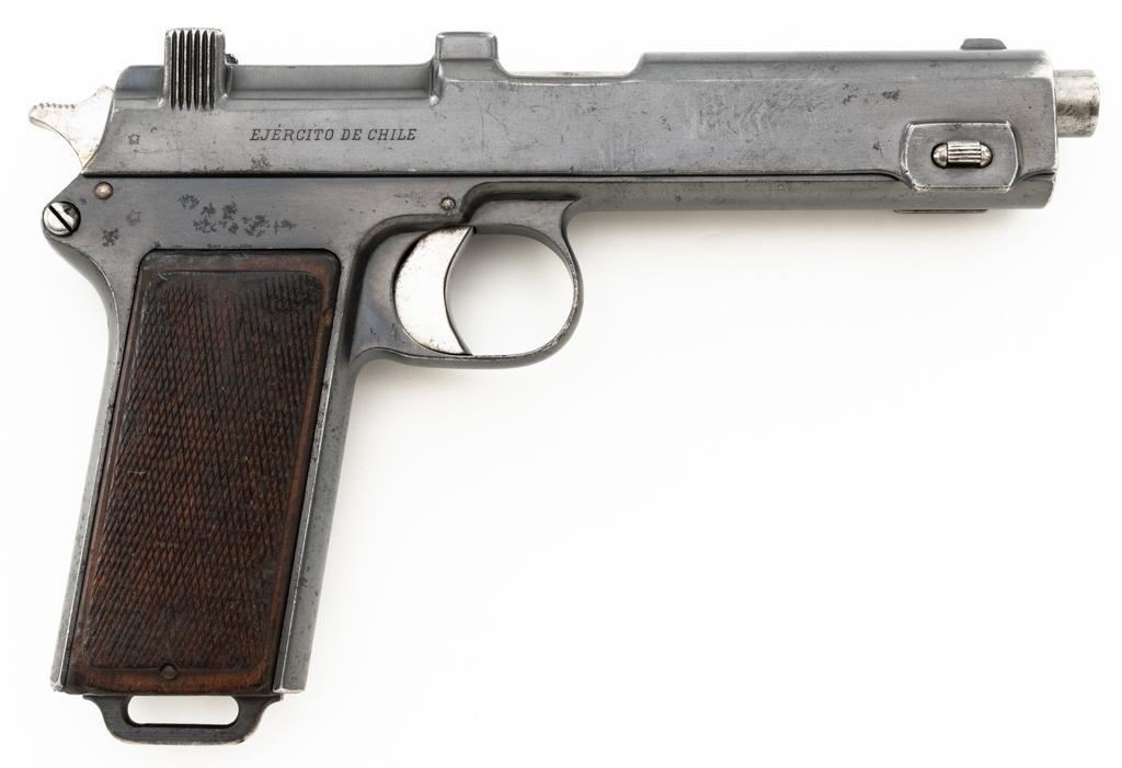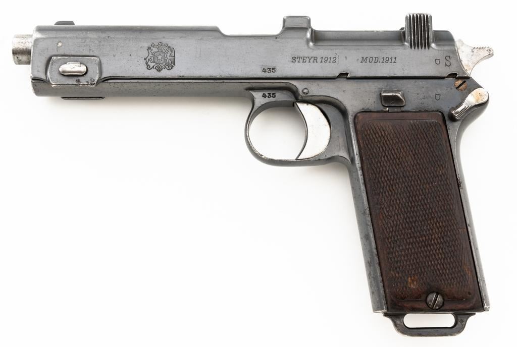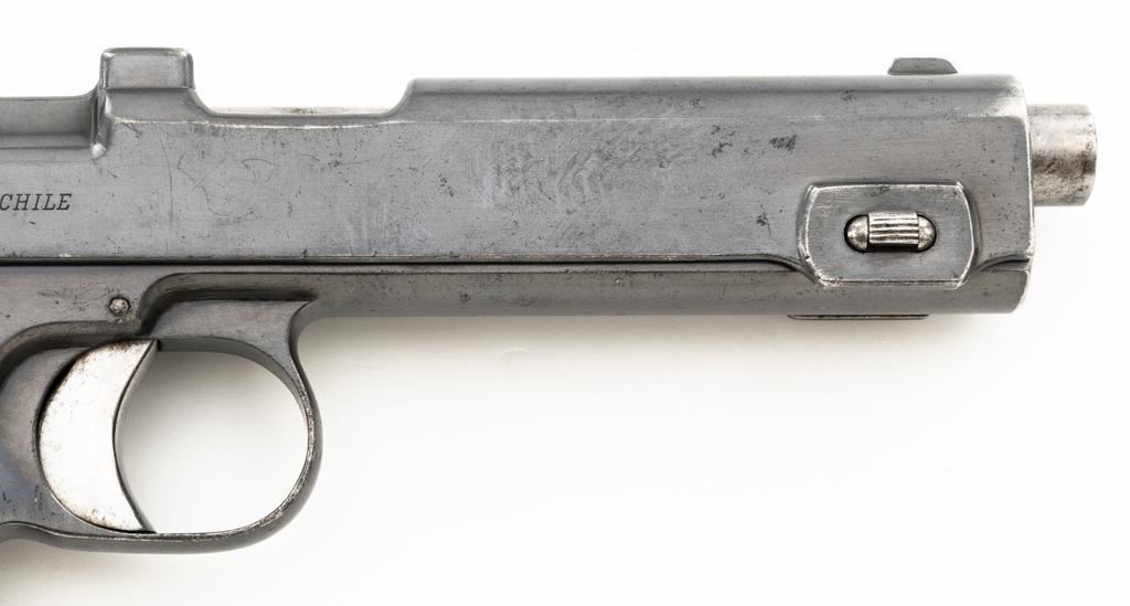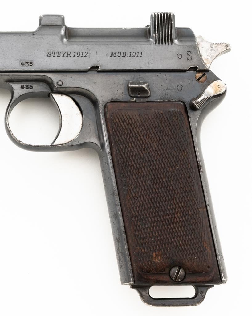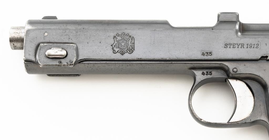 Chilean Contract Steyr-Hahn Model 1911 Semi-Automatic Pistol, #435, 9x23mm cal., 5" barrel, blued finish with bright hammer, trigger, and safety; checkered hardwood grips, blade front sight, fixed rear sight with "V"-notched groove, and fixed lanyard loop at bottom of the frame. Pistol is marked "STEYR 1912" on left side of the slide forward of "MOD.1911" and "(Chilean national crest)". Right side of the slide is marked "EJERCITO DE CHILE". Right side frame at the muzzle is stamped "9MM". Matching numbers on frame and slide, magazine floorplate does not match. No visible import marks. Condition overall is very good, retaining approx. 80%-85% blue, showing toning and fine handling marks, with spot of patina to right side of the frame, slide, and grip straps. Additionally, there are some spots of mild pitting on left side of the frame. Grips show age and wear from service use, with scattered scratches and darkening. Action operates smoothly, but the safety will only engage when the hammer is in the lowered position. Bright bore rates very good, with clearly defined rifling. Est.: $700-$1,000. (C&R/PPT)