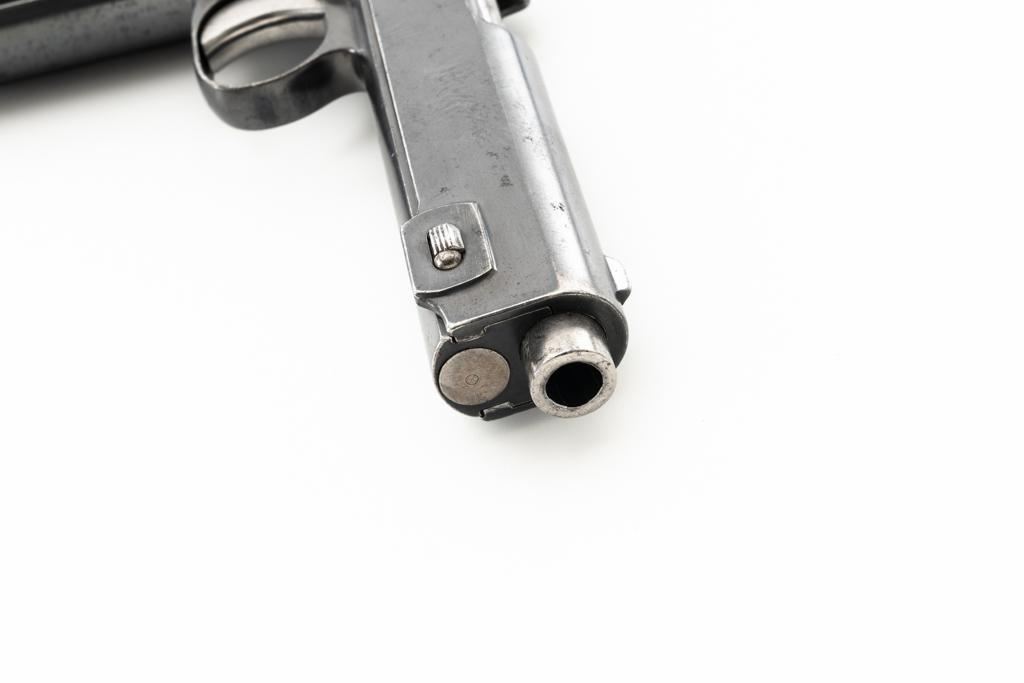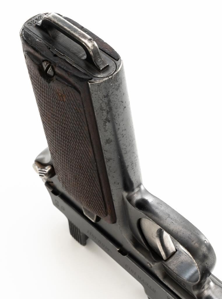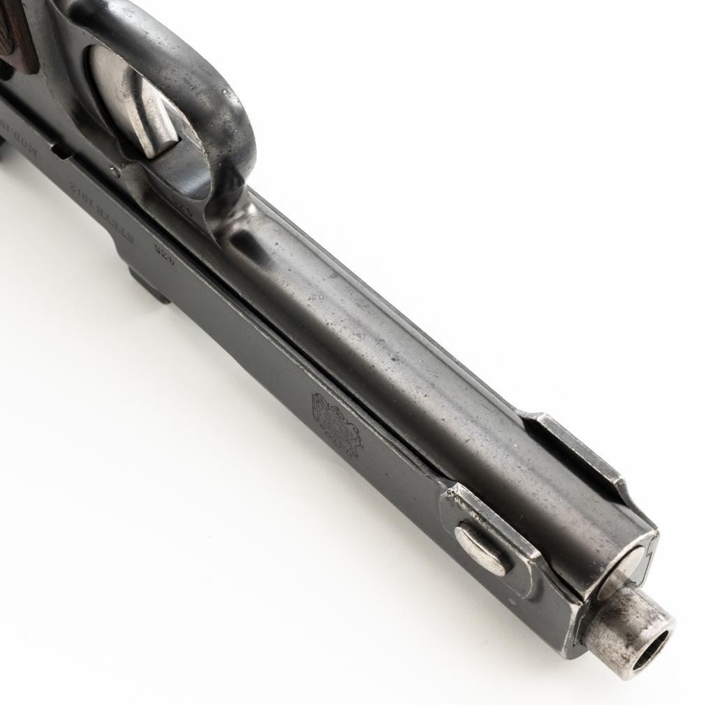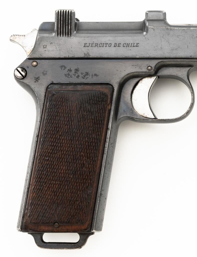 Chilean Contract Steyr-Hahn Model 1911 Semi-Automatic Pistol, #435, 9x23mm cal., 5" barrel, blued finish with bright hammer, trigger, and safety; checkered hardwood grips, blade front sight, fixed rear sight with "V"-notched groove, and fixed lanyard loop at bottom of the frame. Pistol is marked "STEYR 1912" on left side of the slide forward of "MOD.1911" and "(Chilean national crest)". Right side of the slide is marked "EJERCITO DE CHILE". Right side frame at the muzzle is stamped "9MM". Matching numbers on frame and slide, magazine floorplate does not match. No visible import marks. Condition overall is very good, retaining approx. 80%-85% blue, showing toning and fine handling marks, with spot of patina to right side of the frame, slide, and grip straps. Additionally, there are some spots of mild pitting on left side of the frame. Grips show age and wear from service use, with scattered scratches and darkening. Action operates smoothly, but the safety will only engage when the hammer is in the lowered position. Bright bore rates very good, with clearly defined rifling. Est.: $700-$1,000. (C&R/PPT)