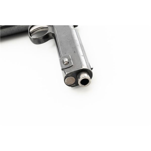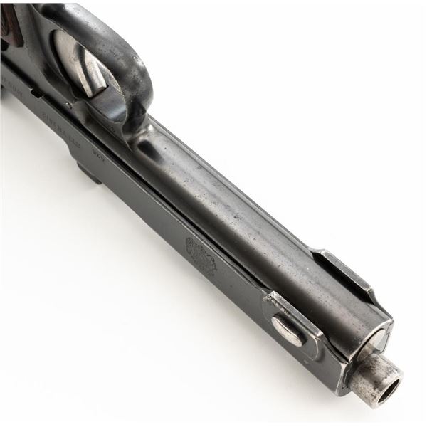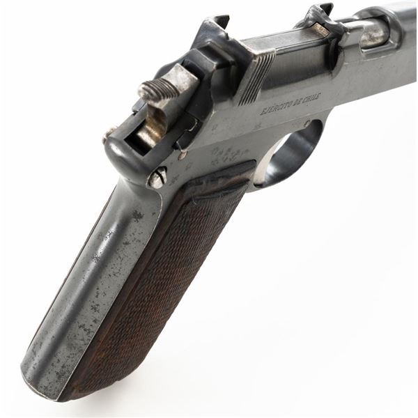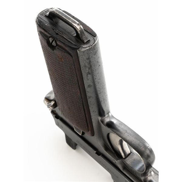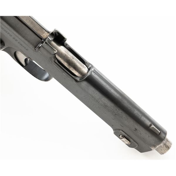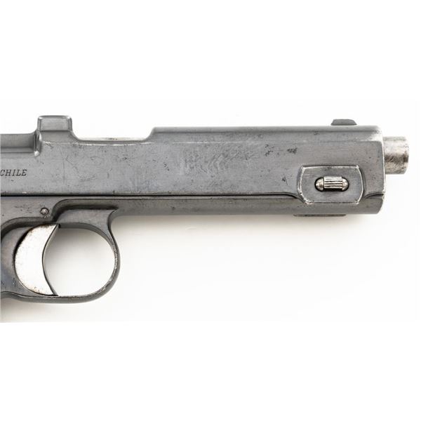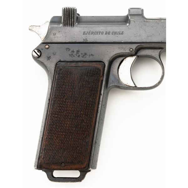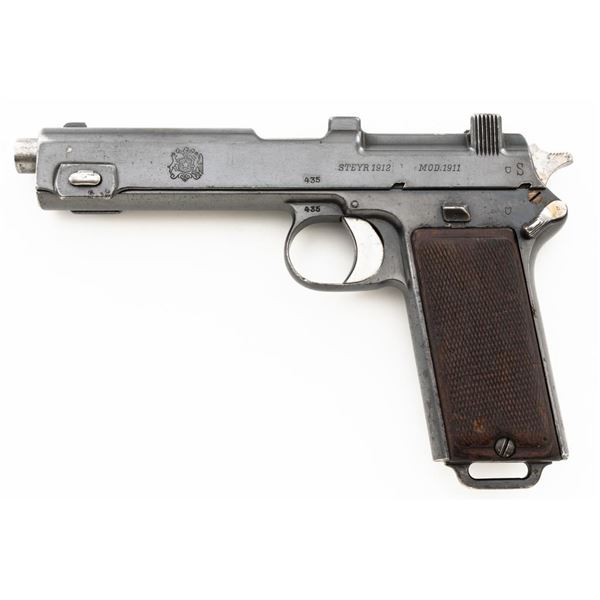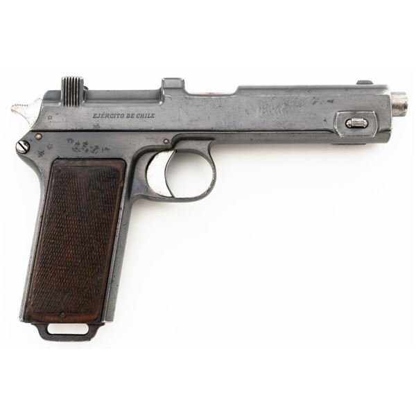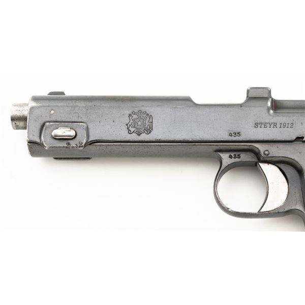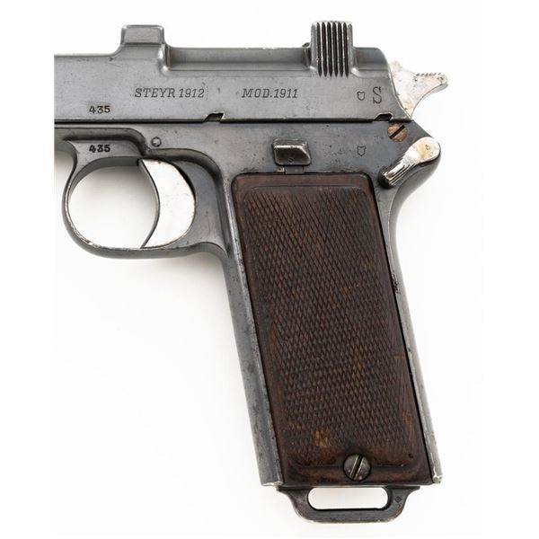 Chilean Contract Steyr-Hahn Model 1911 Semi-Automatic Pistol, #435, 9x23mm cal., 5" barrel, blued finish with bright hammer, trigger, and safety; checkered hardwood grips, blade front sight, fixed rear sight with "V"-notched groove, and fixed lanyard loop at bottom of the frame. Pistol is marked "STEYR 1912" on left side of the slide forward of "MOD.1911" and "(Chilean national crest)". Right side of the slide is marked "EJERCITO DE CHILE". Right side frame at the muzzle is stamped "9MM". Matching numbers on frame and slide, magazine floorplate does not match. No visible import marks. Condition overall is very good, retaining approx. 80%-85% blue, showing toning and fine handling marks, with spot of patina to right side of the frame, slide, and grip straps. Additionally, there are some spots of mild pitting on left side of the frame. Grips show age and wear from service use, with scattered scratches and darkening. Action operates smoothly, but the safety will only engage when the hammer is in the lowered position. Bright bore rates very good, with clearly defined rifling. Est.: $700-$1,000. (C&R/PPT)