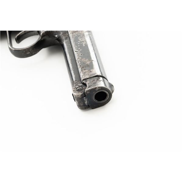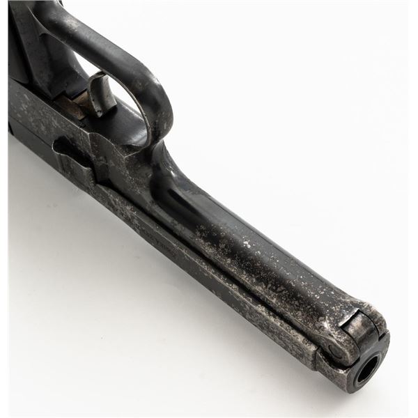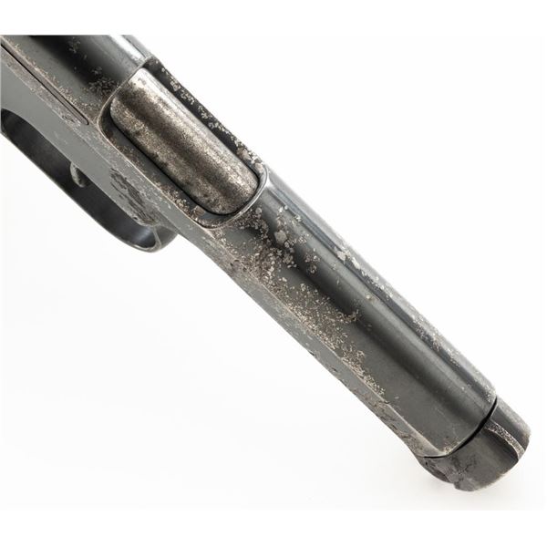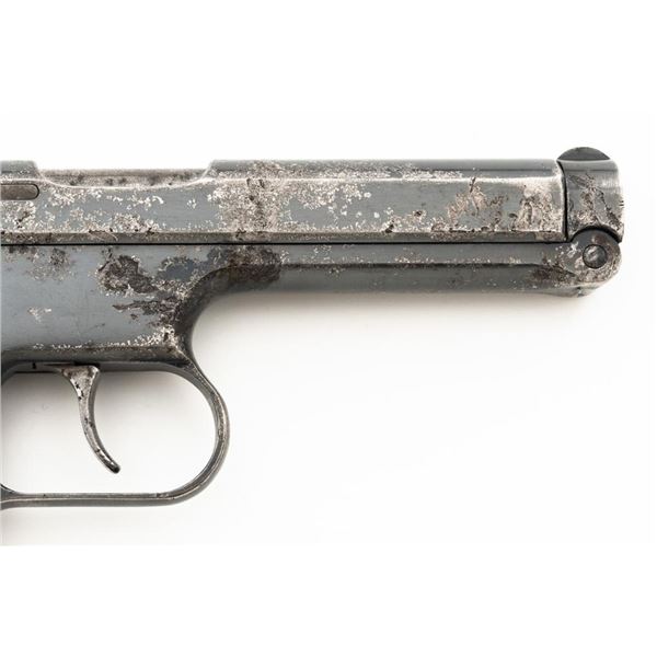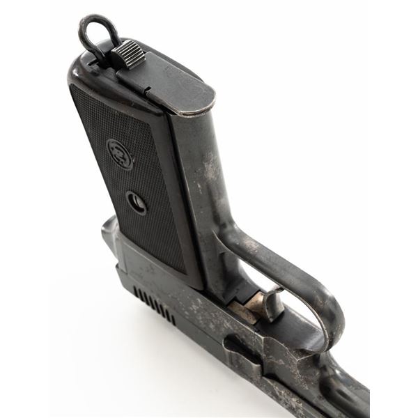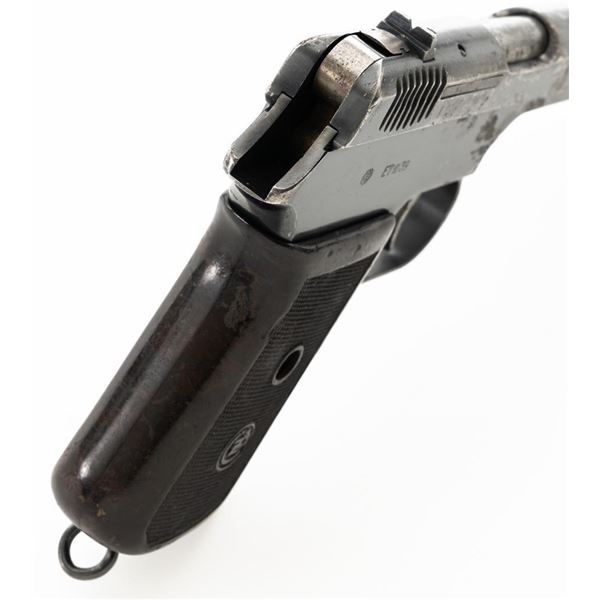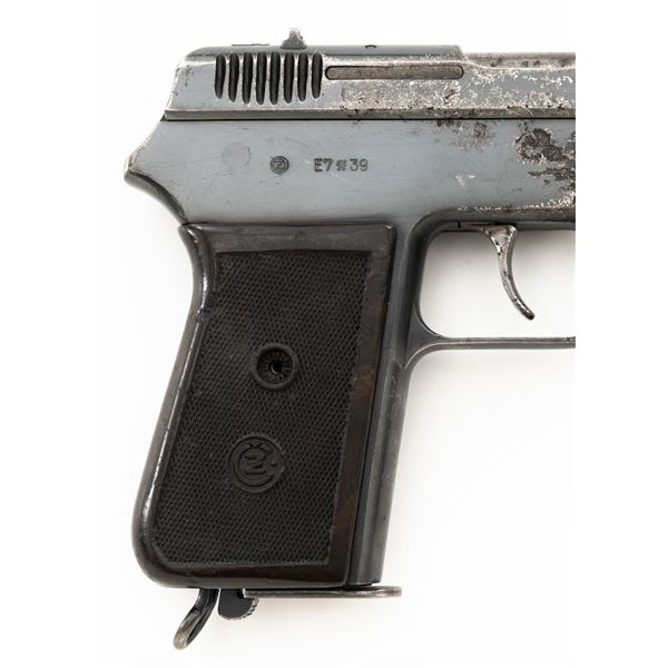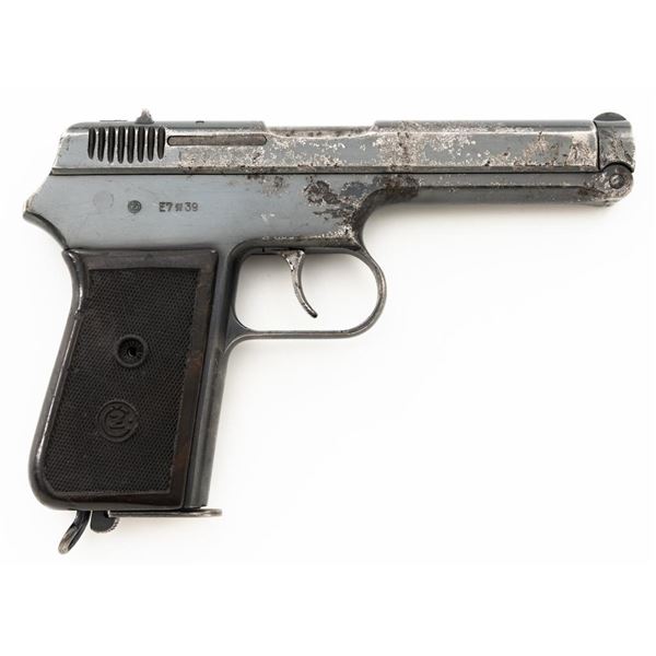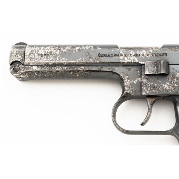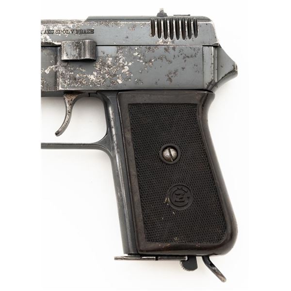 Czech CZ 38 Semi-Automatic Pistol, #255907, .380 ACP cal., 4.7" barrel, blued finish, checkered dark red one piece grip, blade front sight, fixed rear sight with "V"-notched groove, and swiveling lanyard ring at rear of the frame. Includes one unmarked blued steel magazine. Pistol is marked "CESKA ZBROJOVKA AKC.SPOL V PRAZE" on left side of the slide, with "(CZ logo)/E7/(Czech lion)/39" on right side of the frame. There are "(Czech lion)" proofs on top of the slide and on the barrel at the ejection port. Matching visible numbers on frame and slide. No visible import marks. Condition overall is fair, metal with areas of considerable pitting and patina across the front and sides of the frame and slide. Grip also shows considerable wear and right side grip screw is missing. Action operates smoothly. Bright bore rates excellent with well-defined rifling. Est.: $150-$250. (C&R/PPT)