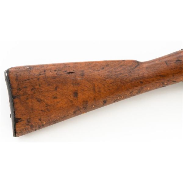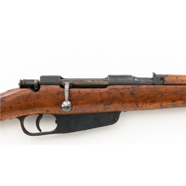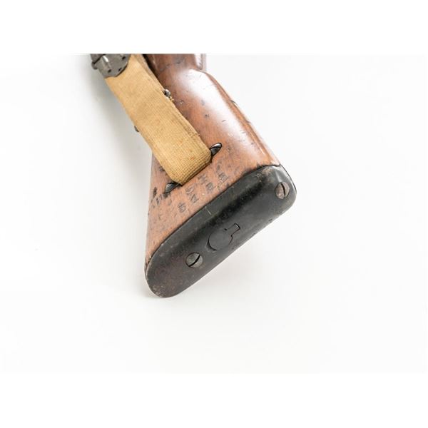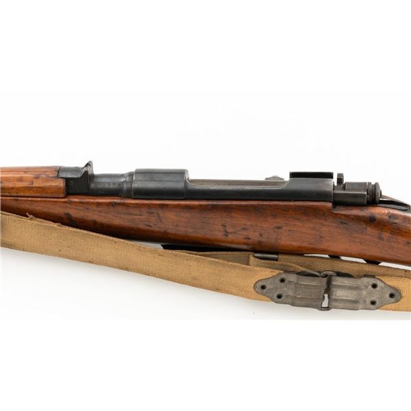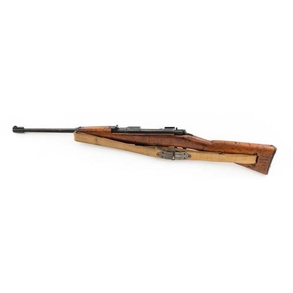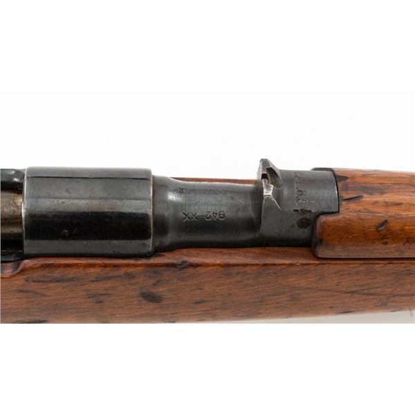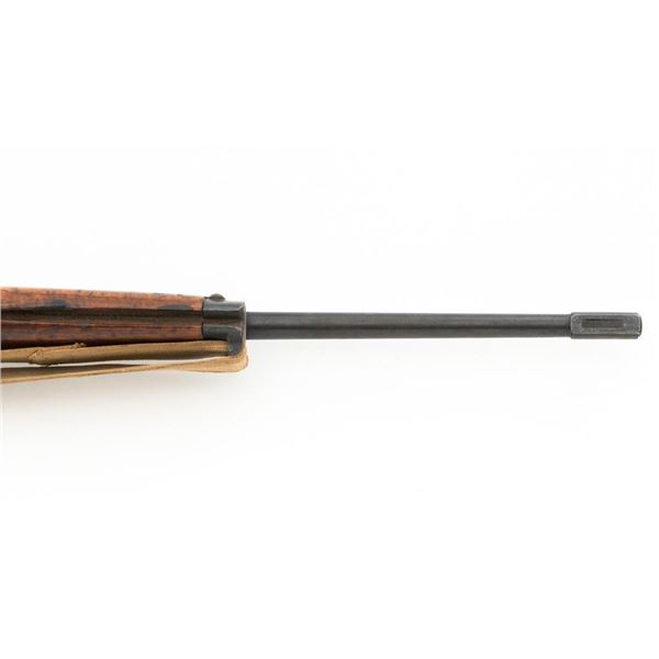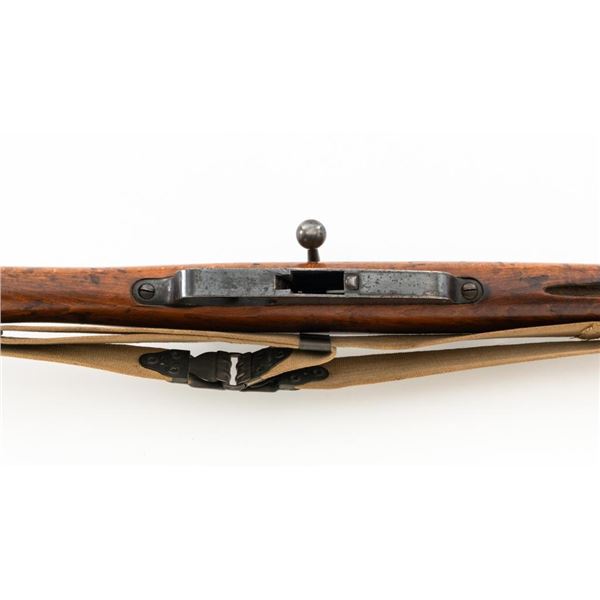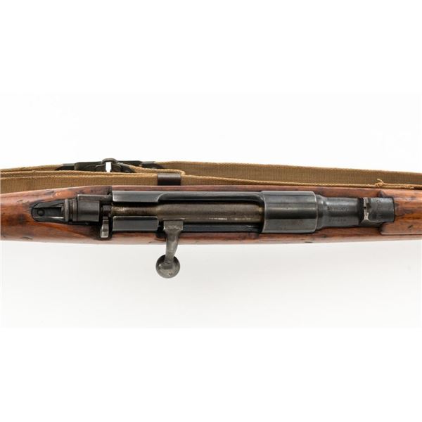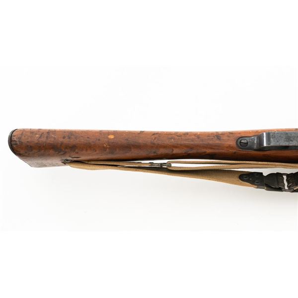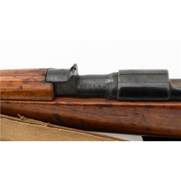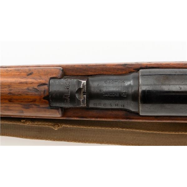 Italian M1891/38 Carcano Bolt Action Carbine, #SF5188, 6.5x52mm cal., 17.75" barrel, blued finish, hardwood stock and handguard, dovetailed blade front sight, and fixed rear sight with "V"-notched groove. Includes a tan colored U.S. "NOBUCKL" sling, in good used condition. The mount for the folding bayonet has been milled off the bottom of the front sight band. Barrel shank marked "GARDONE VT" with Fascist "942-XX", for manufacture in 1942. Marked "MADE IN ITALY" on left side of the barrel. Matching numbered stock. Condition overall is very good+ as refinished, retaining approx. 93%-95% blue, which was applied over light pitting on the barrel, and now shows patina to the magazine. Wood has been sanded and stained over old handling marks, now in very good condition. Action functions well. Bright bore rates very good, with clearly defined rifling. Est.: $150-$250. (C&R)