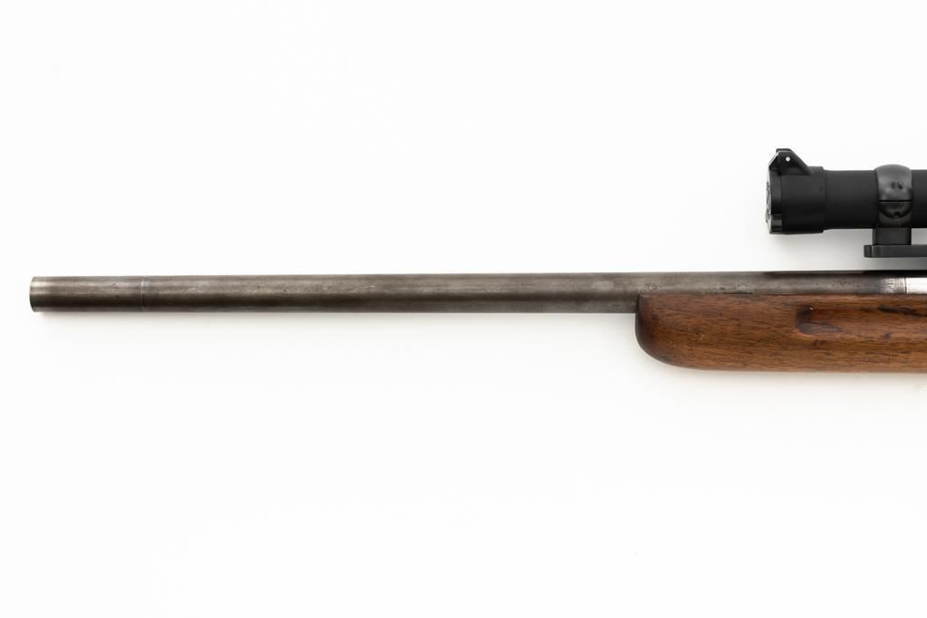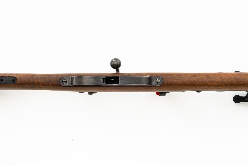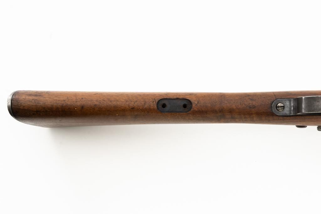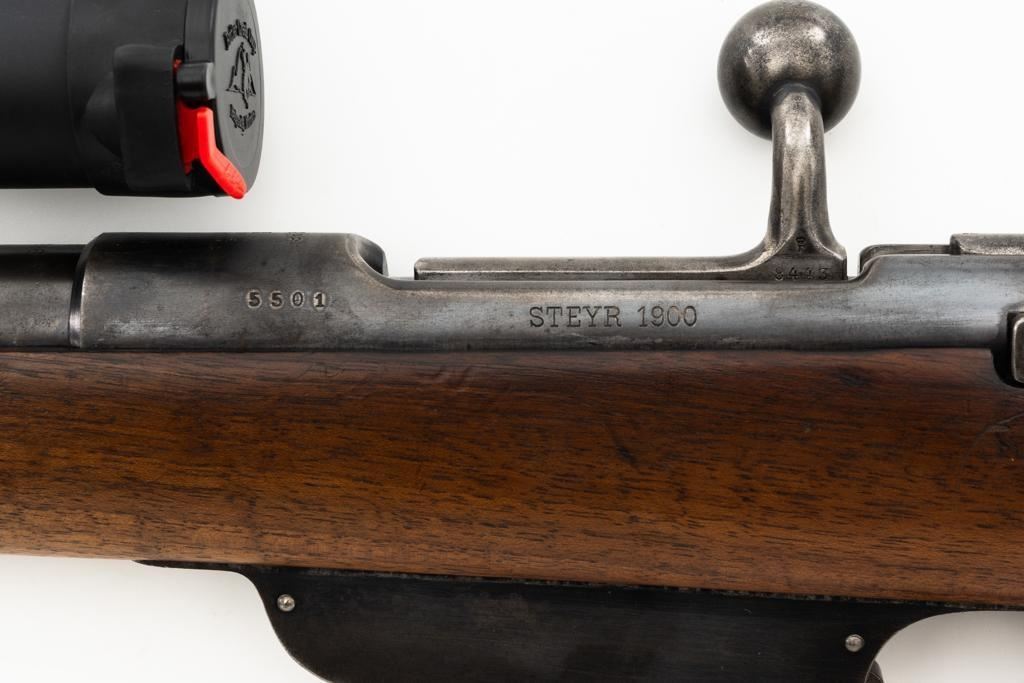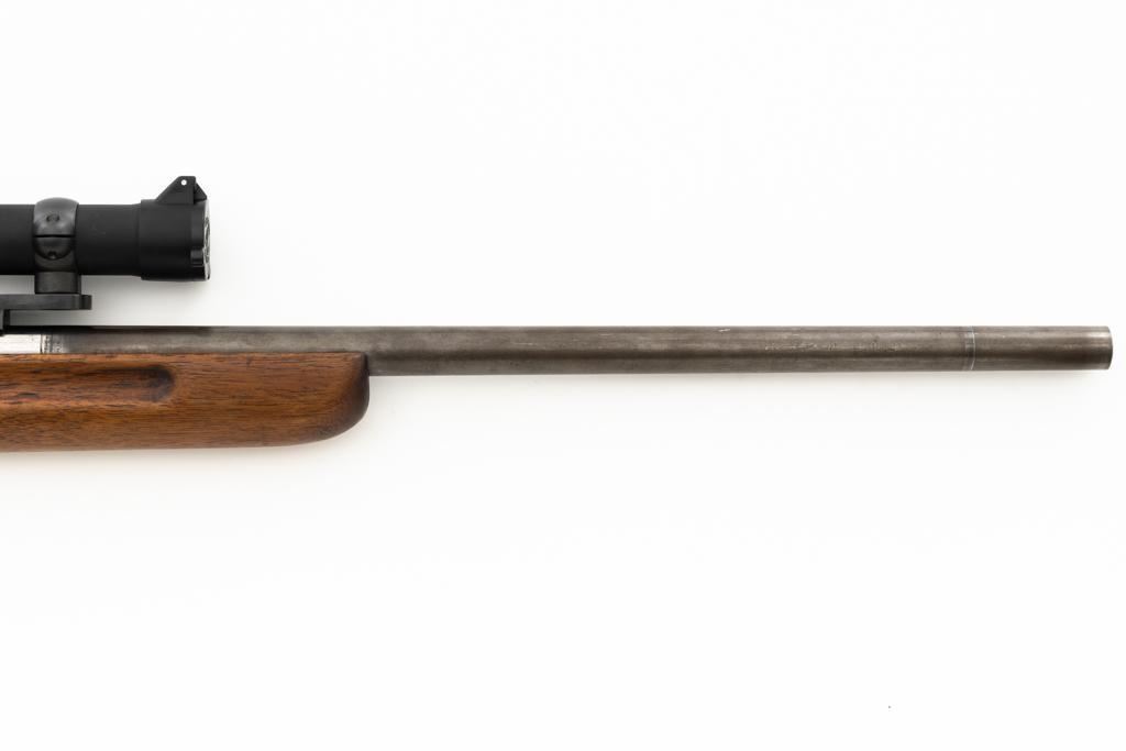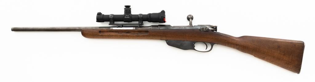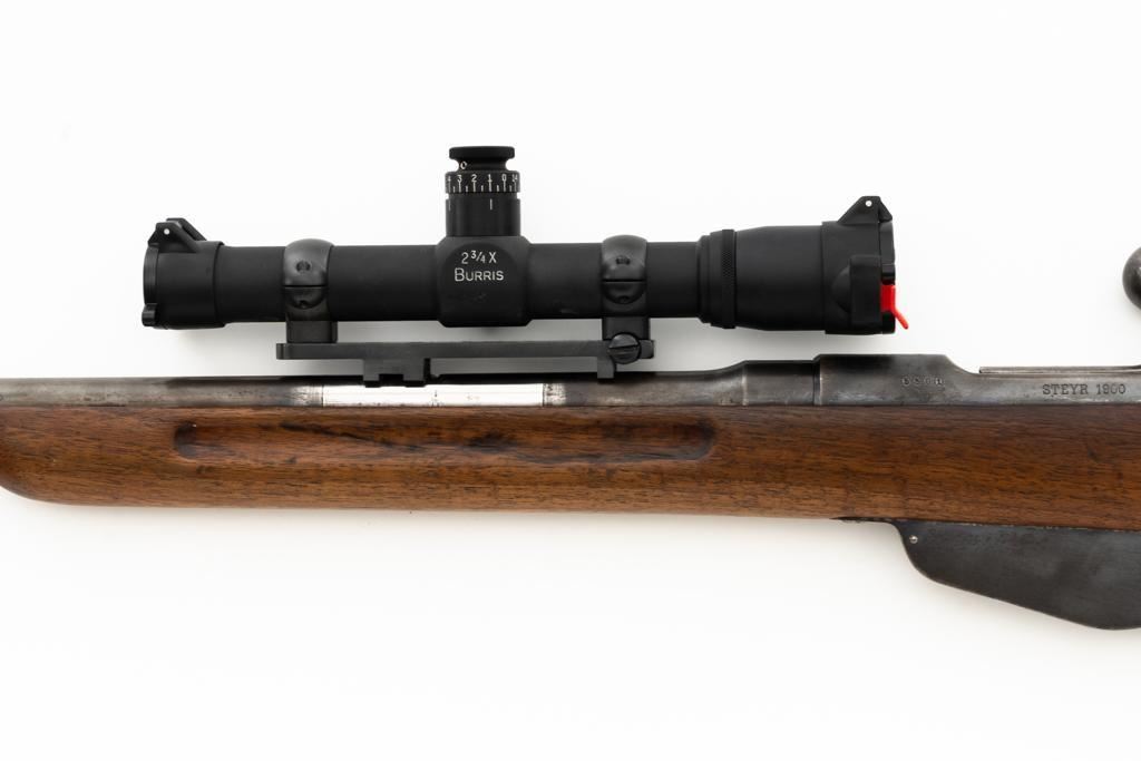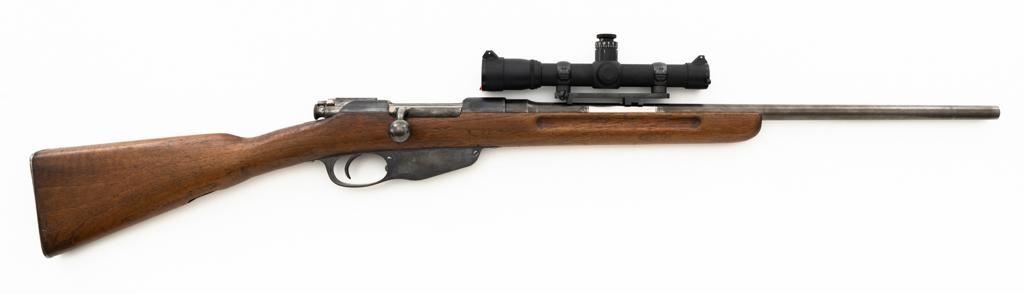 Modified M1895 Dutch Mannlicher Bolt Action Rifle with Scope, #963L, possibly in 6.5x53Rmm cal., but needs to be verified, 22.25" barrel, blued finish, with hardwood stock. Sights have been removed. Topped with a Burris mount and 2-3/4x Burris scope with flip-up lens covers. Scope is in excellent condition, with bright, clear optics. Rifle has been modified by cutting back the barrel and forend, removing the military hardware. Top of receiver ring with a crowned inspection stamp and marked "STEYR 1900" on left side of the receiver rail. Condition is good as modified, retaining approx. 45%-50% blue, showing wear and toning. Wood has been sanded and stained, now in good condition, with a crack to the forend at the filled cleaning rod channel. Action operates smoothly. Bore is good but needs thorough cleaning. Est.: $200-$300. (C&R)