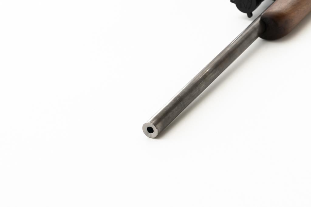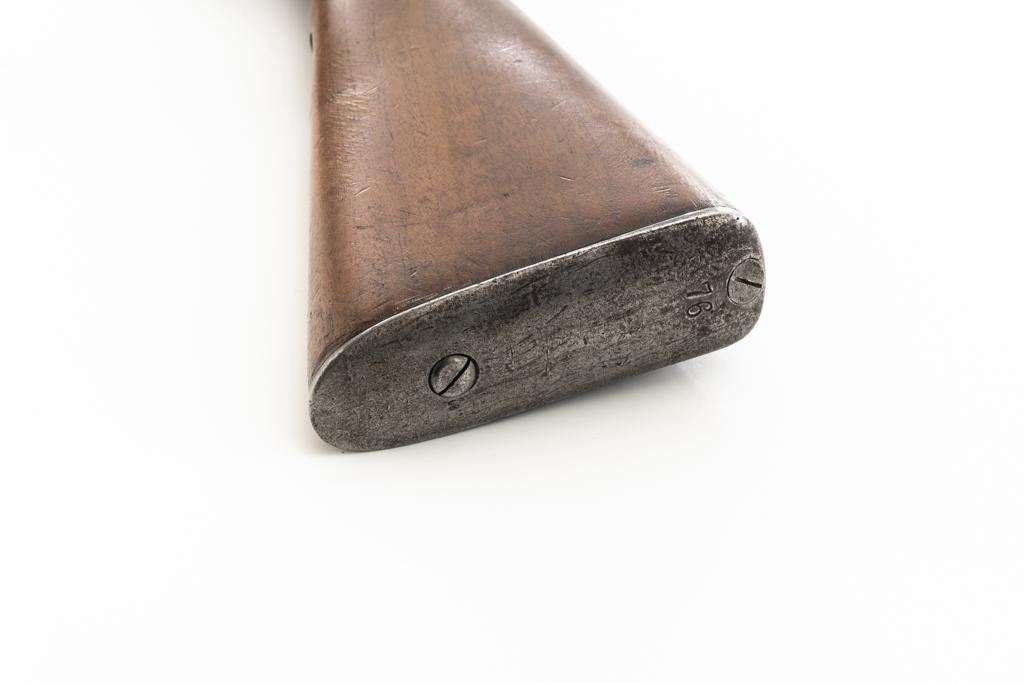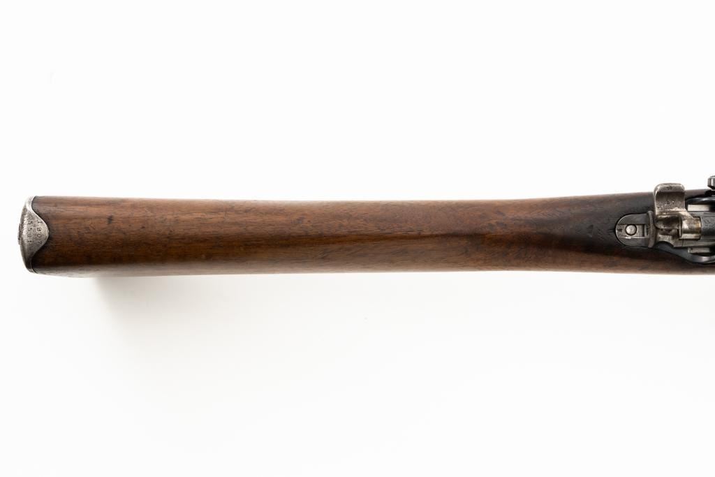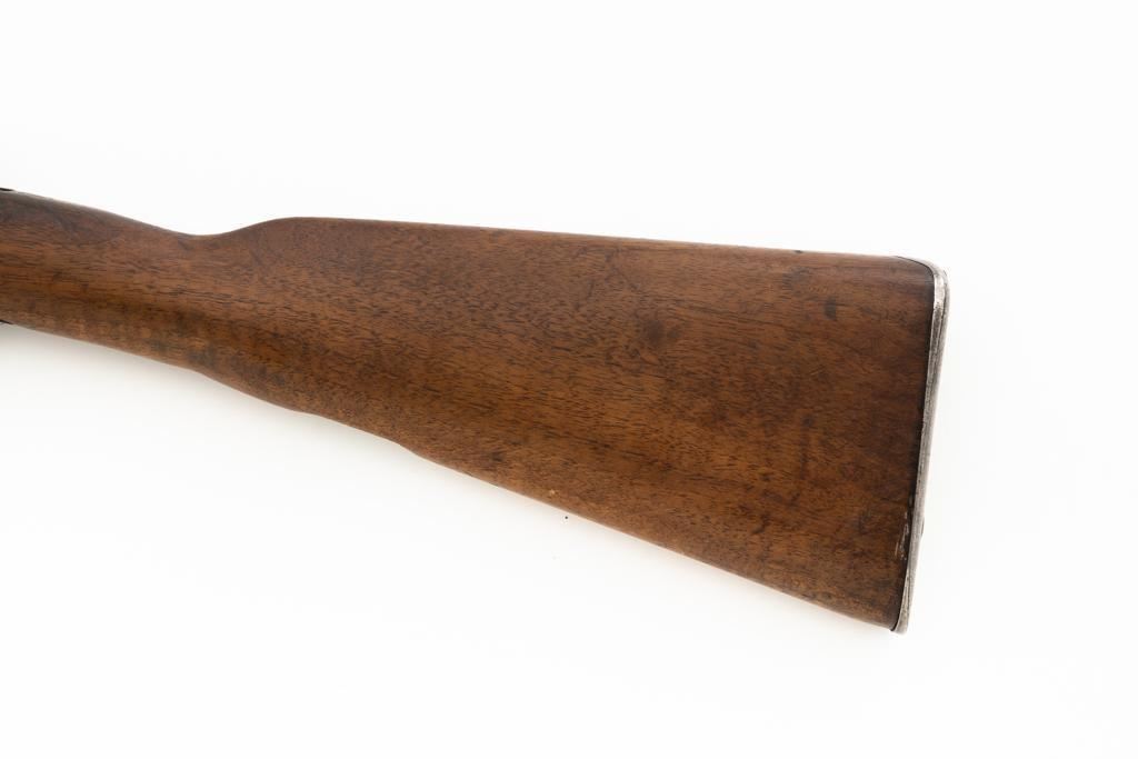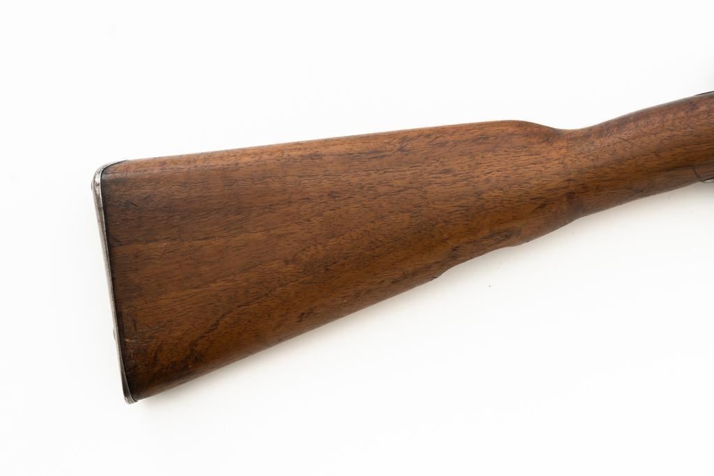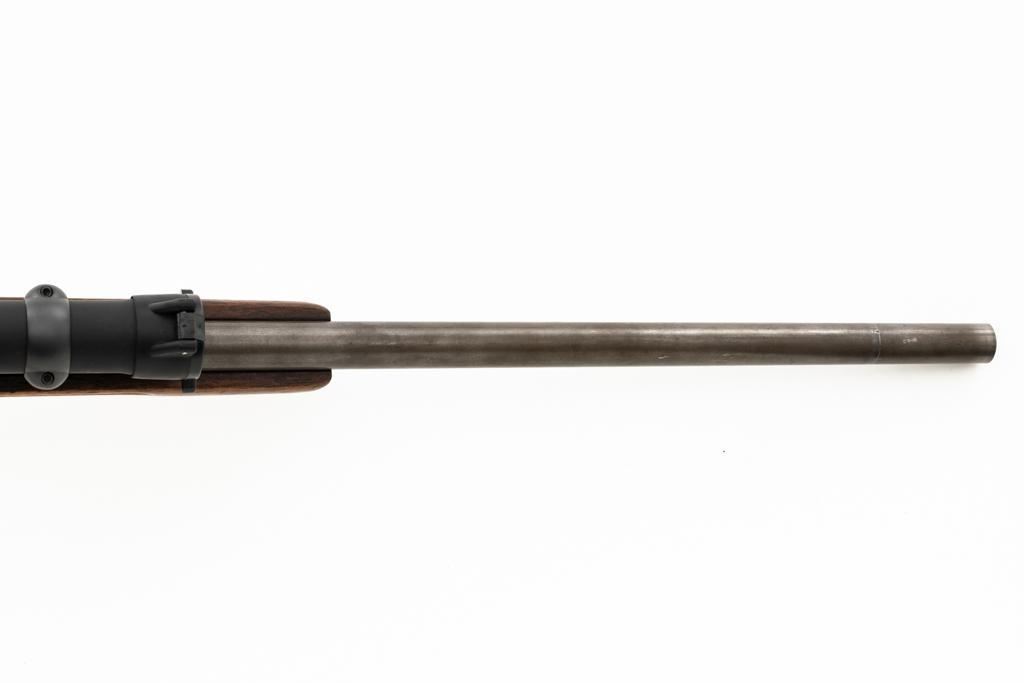 Modified M1895 Dutch Mannlicher Bolt Action Rifle with Scope, #963L, possibly in 6.5x53Rmm cal., but needs to be verified, 22.25" barrel, blued finish, with hardwood stock. Sights have been removed. Topped with a Burris mount and 2-3/4x Burris scope with flip-up lens covers. Scope is in excellent condition, with bright, clear optics. Rifle has been modified by cutting back the barrel and forend, removing the military hardware. Top of receiver ring with a crowned inspection stamp and marked "STEYR 1900" on left side of the receiver rail. Condition is good as modified, retaining approx. 45%-50% blue, showing wear and toning. Wood has been sanded and stained, now in good condition, with a crack to the forend at the filled cleaning rod channel. Action operates smoothly. Bore is good but needs thorough cleaning. Est.: $200-$300. (C&R)