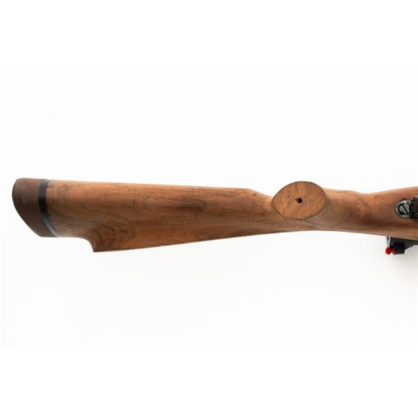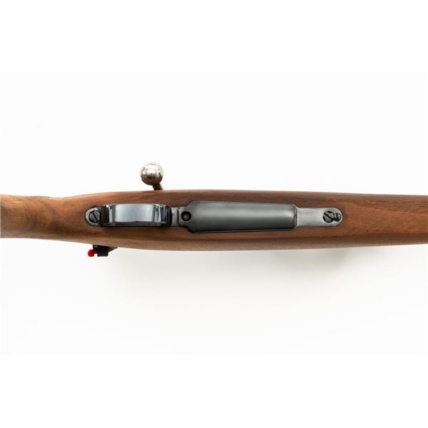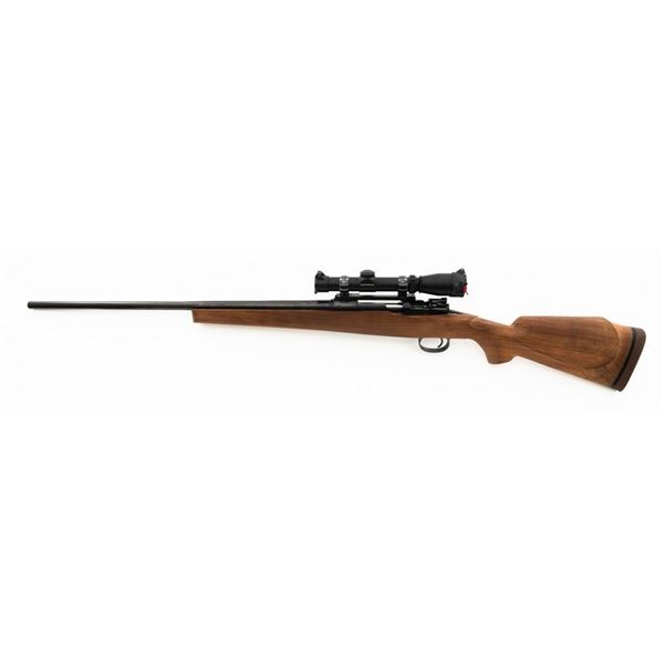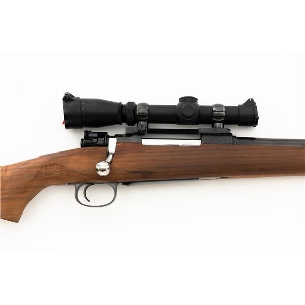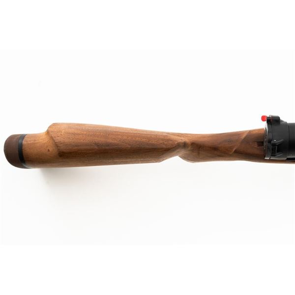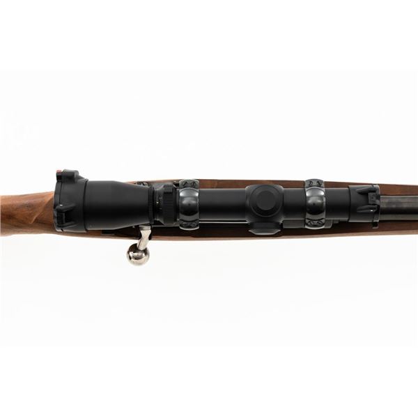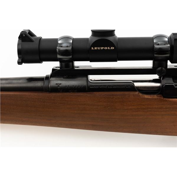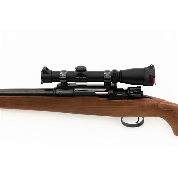 Modified German Kar 98k Mauser Bolt Action Rifle with Scope, #D17507, 8x57mm cal., 24" barrel, blued finish with bright bolt, sporter stock with cheekpiece and recoil pad. Issue sights removed. Rifle is fitted with a scope rail and Leupold 1x4 scope, which is in excellent condition with bright, clear optics. Rifle with the original military markings on the receiver. Bolt handle has been turned down and polished, with an added flip safety on the cocking piece. Condition overall is good as modified, retaining nearly all of the reblued finish, which was applied over old pitting on the receiver and barrel. Wood is unfinished, reshaping to the stock comb and wrist needs to be finished. Action operates smoothly. Bright bore rates excellent overall with well-defined rifling. Est.: $300-$500. (Modern)