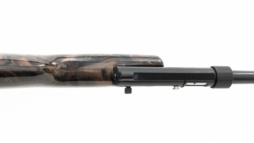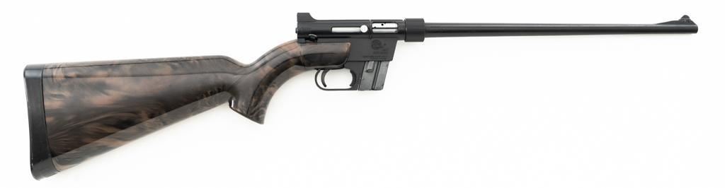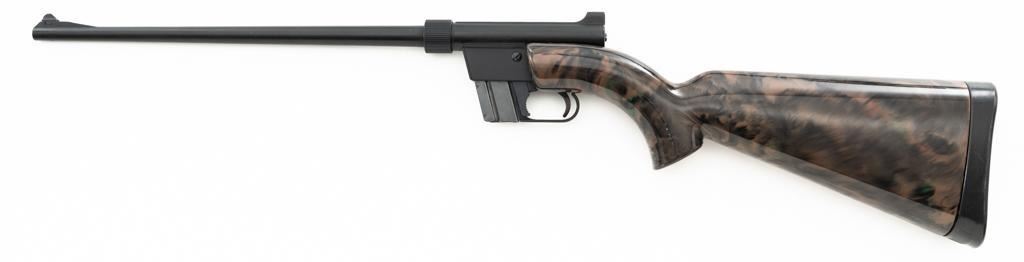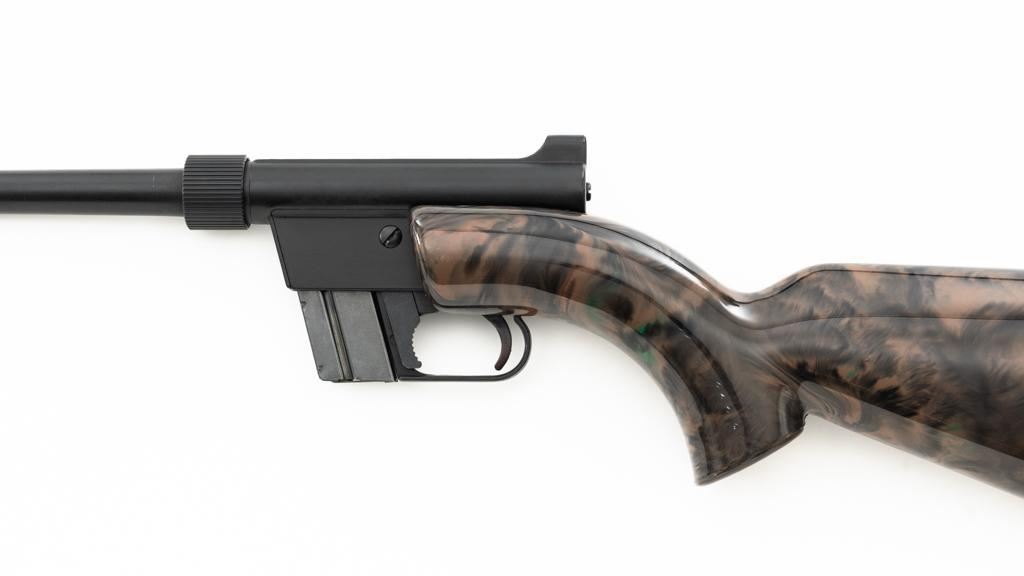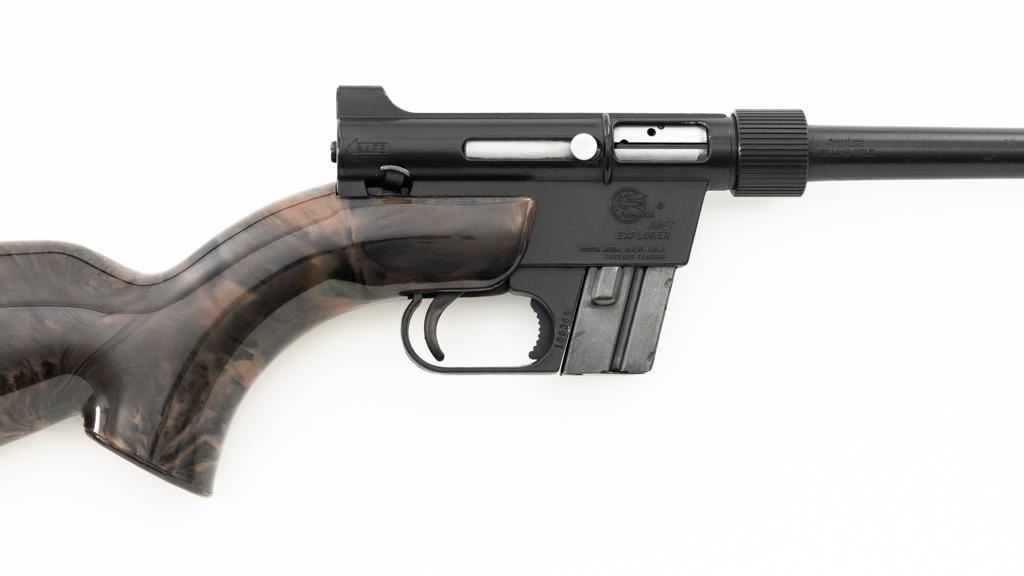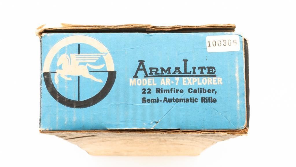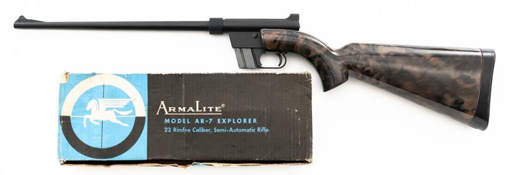 Armalite AR-7 Explorer Semi-Automatic Takedown Survival Rifle, #100306, .22 LR cal., 16" aluminum barrel with steel liner, matte black finish, scarce brown camouflage synthetic stock, factory dovetailed blade front and aperture rear sight, with one 8-round blue steel detachable magazine. Factory markings are clear, with "COSTA MESA, CALIF. U.S.A." on the right side of the receiver. Includes the factory cardboard box with matching serial number at the end. Box is in very good condition. Mfgd circa 1972-1973. Rifle is in excellent overall condition, retaining approx. 98%-99% factory finish, with light marks at the muzzle and scattered minor handling marks. Stock is in excellent condition with light scuffs and storage marks. Action functions well. Bore is bright with excellent rifling. Est.: $300-$500. (C&R)
