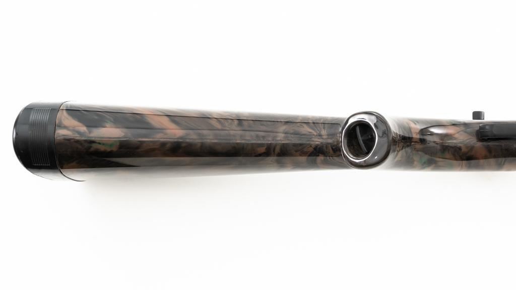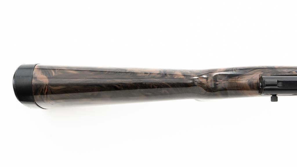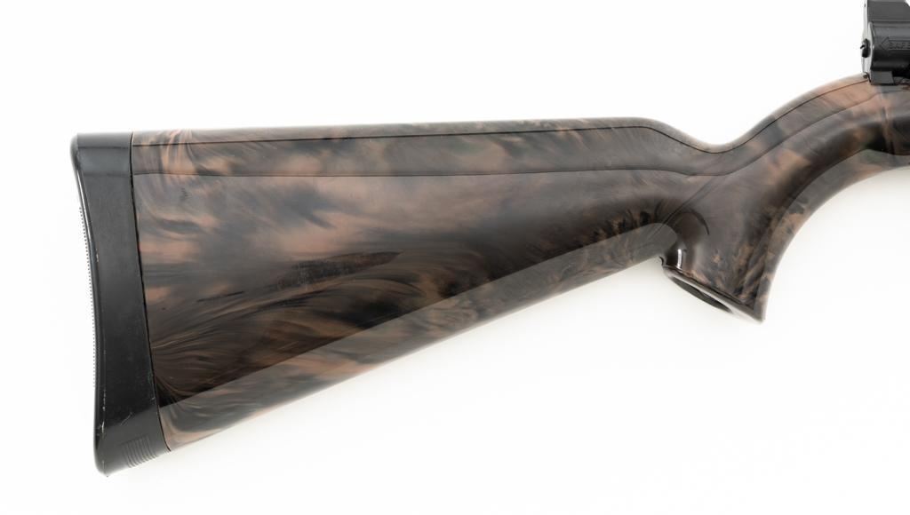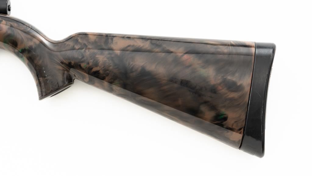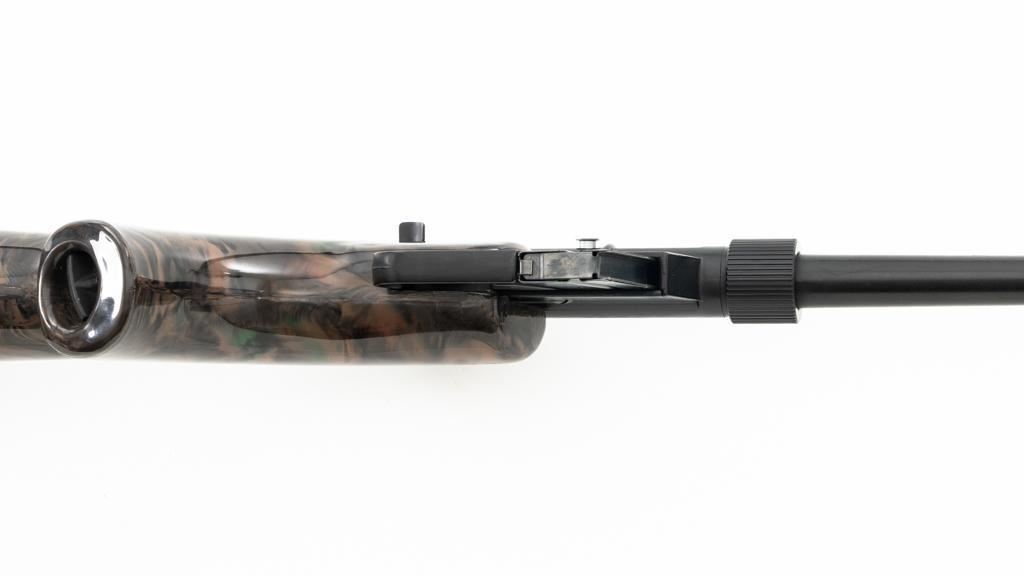Armalite AR-7 Explorer Semi-Automatic Takedown Survival Rifle, #100306, .22 LR cal., 16" aluminum barrel with steel liner, matte black finish, scarce brown camouflage synthetic stock, factory dovetailed blade front and aperture rear sight, with one 8-round blue steel detachable magazine. Factory markings are clear, with "COSTA MESA, CALIF. U.S.A." on the right side of the receiver. Includes the factory cardboard box with matching serial number at the end. Box is in very good condition. Mfgd circa 1972-1973. Rifle is in excellent overall condition, retaining approx. 98%-99% factory finish, with light marks at the muzzle and scattered minor handling marks. Stock is in excellent condition with light scuffs and storage marks. Action functions well. Bore is bright with excellent rifling. Est.: $300-$500. (C&R)