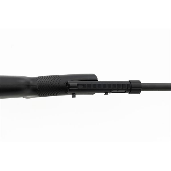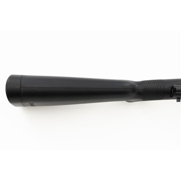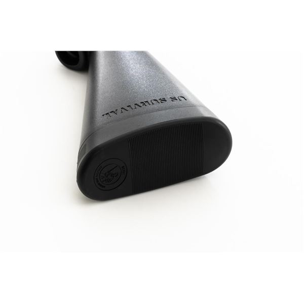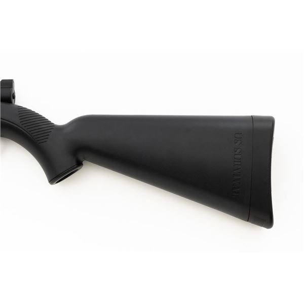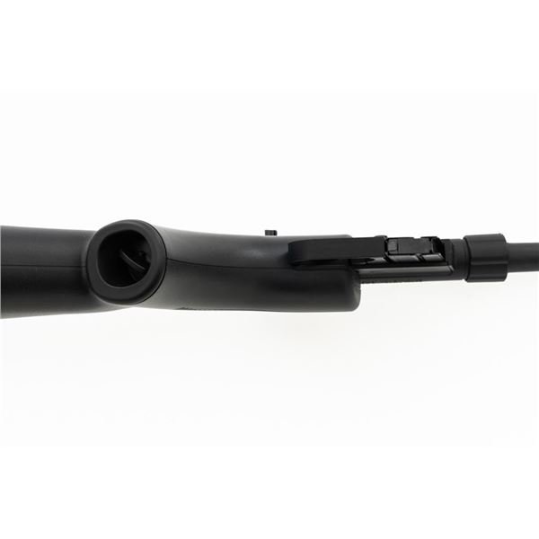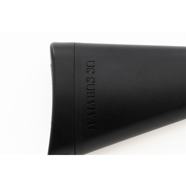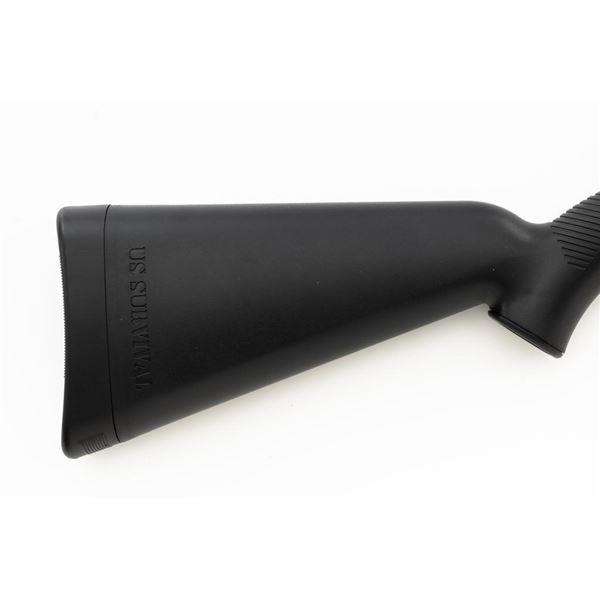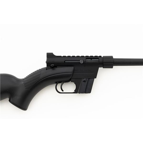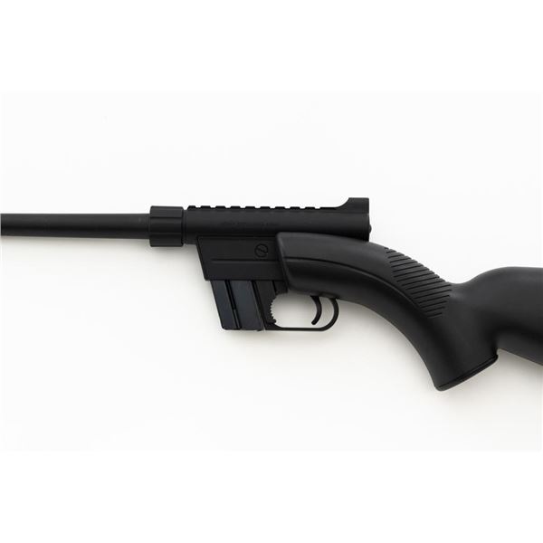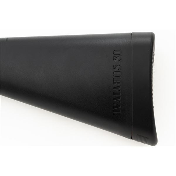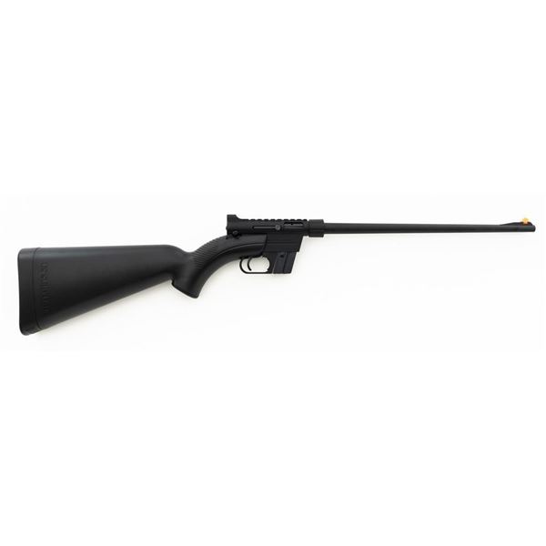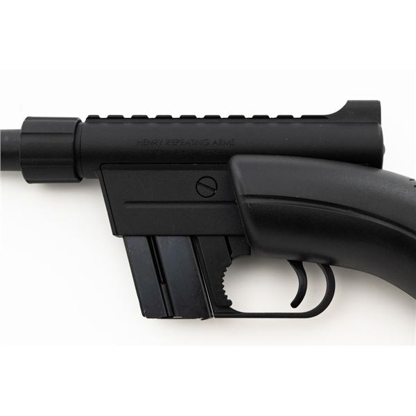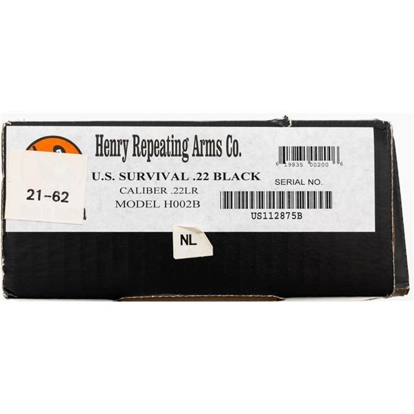 Henry Repeating Arms U.S. Survival Semi-Automatic Takedown Rifle, #US112875B, .22 LR cal., 16" ABS plastic coated barrel, matte black finish, textured ABS plastic stock, orange plastic dovetailed blade front sight, and fixed peep sight at the rear of the receiver, Picatinny style rail on top of the receiver. Includes two (2) 8-round blue steel magazines and factory cardboard box with matching end label. Rifle is excellent overall condition, retaining approx. 99% factory finish, with only minor handling marks. Stock is in excellent condition. Action functions well. Bore is mirror bright with excellent rifling, and shows little use. The rifle disassembles and can be stored in the buttstock along with the extra magazine. Est.: $200-$300. (Modern)