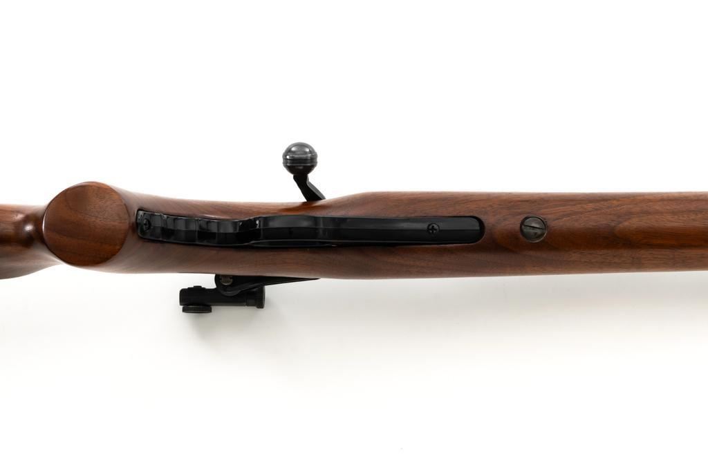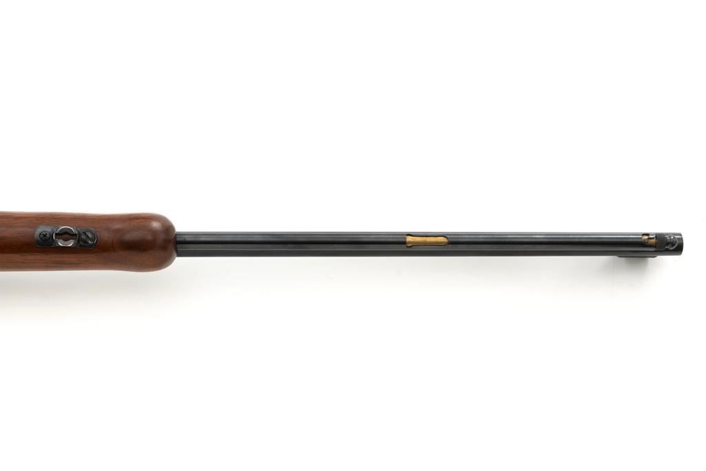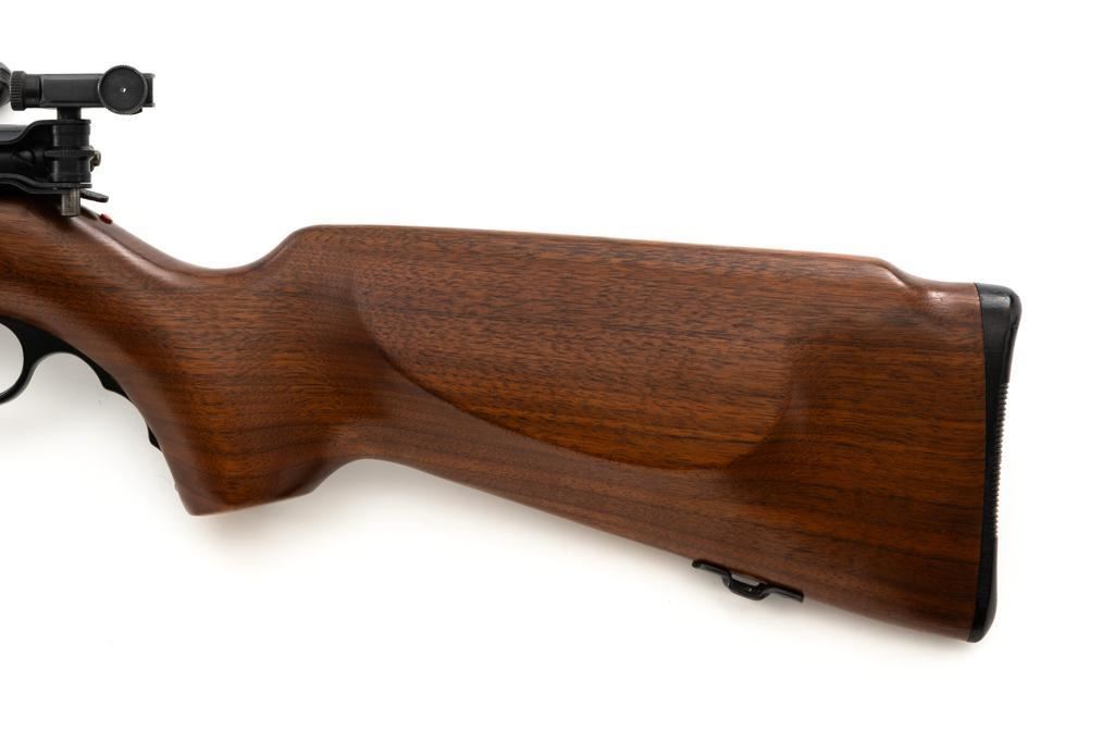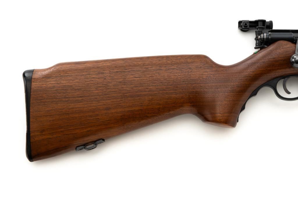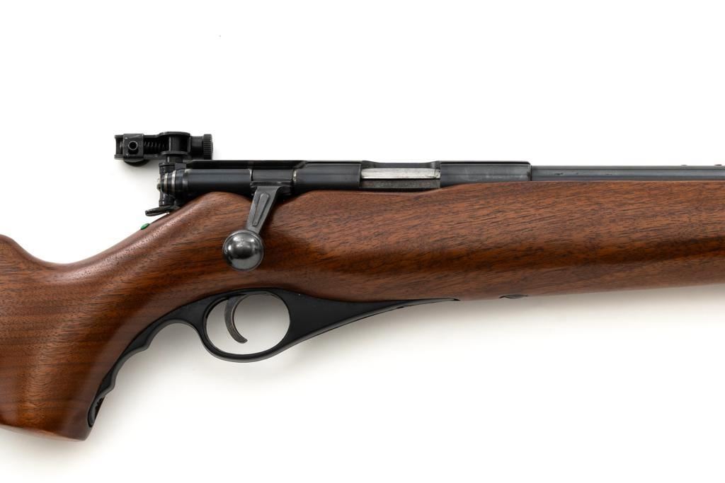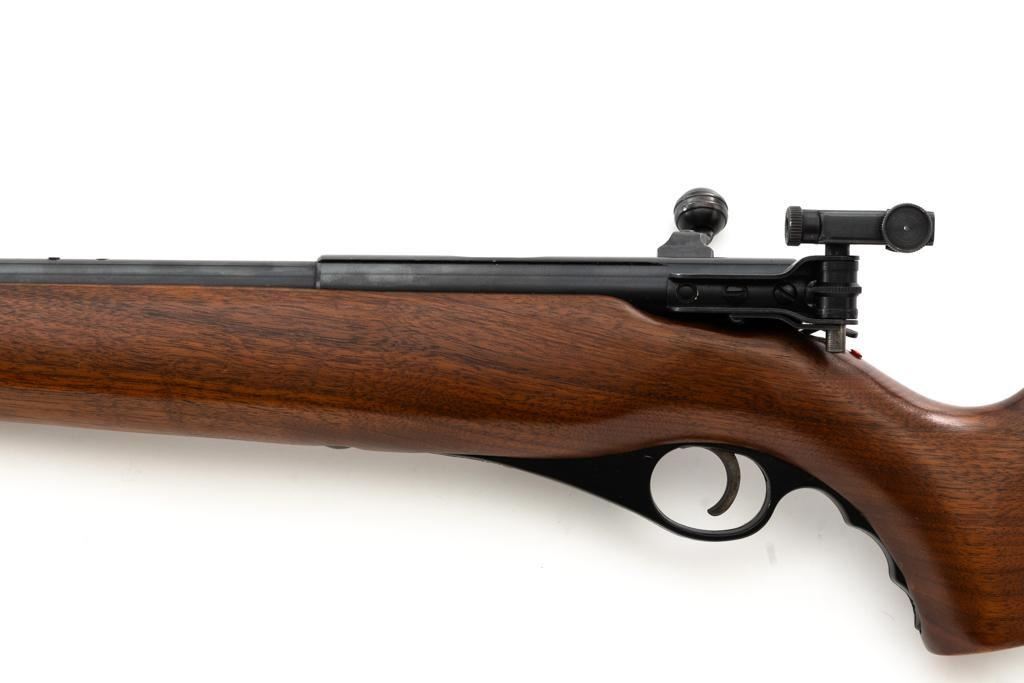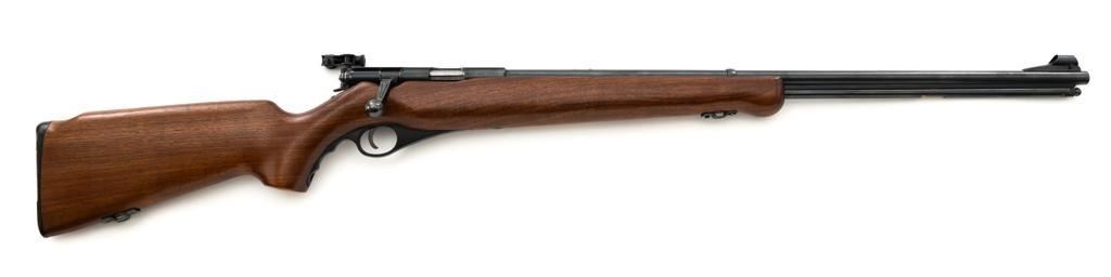Mossberg Model 146B-A Bolt Action Rifle, #NVSN, .22 S-L-LR cal., 26" barrel, smooth walnut one-piece pistol grip stock with Schnabel forend and sling swivel mounts, hooded flip-up front sight, rear sight has been removed, Mossberg Model S-130 folding aperture sight at the left rear of the receiver, factory grooved receiver, and nylon finger groove trigger guard. Buttstock ends with a ribbed hard rubber buttplate, providing a 13.5" LOP. Mfgd circa 1954-58. Rifle is in near excellent overall condition, retaining approx. 96%-97% factory finish, showing light wear and minor handling marks. Stock is in near excellent condition with minor indentations and light storage marks. Action functions smoothly with a crisp trigger. Bright bore is near excellent with well-defined rifling. Est.: $200-$400. (C&R)