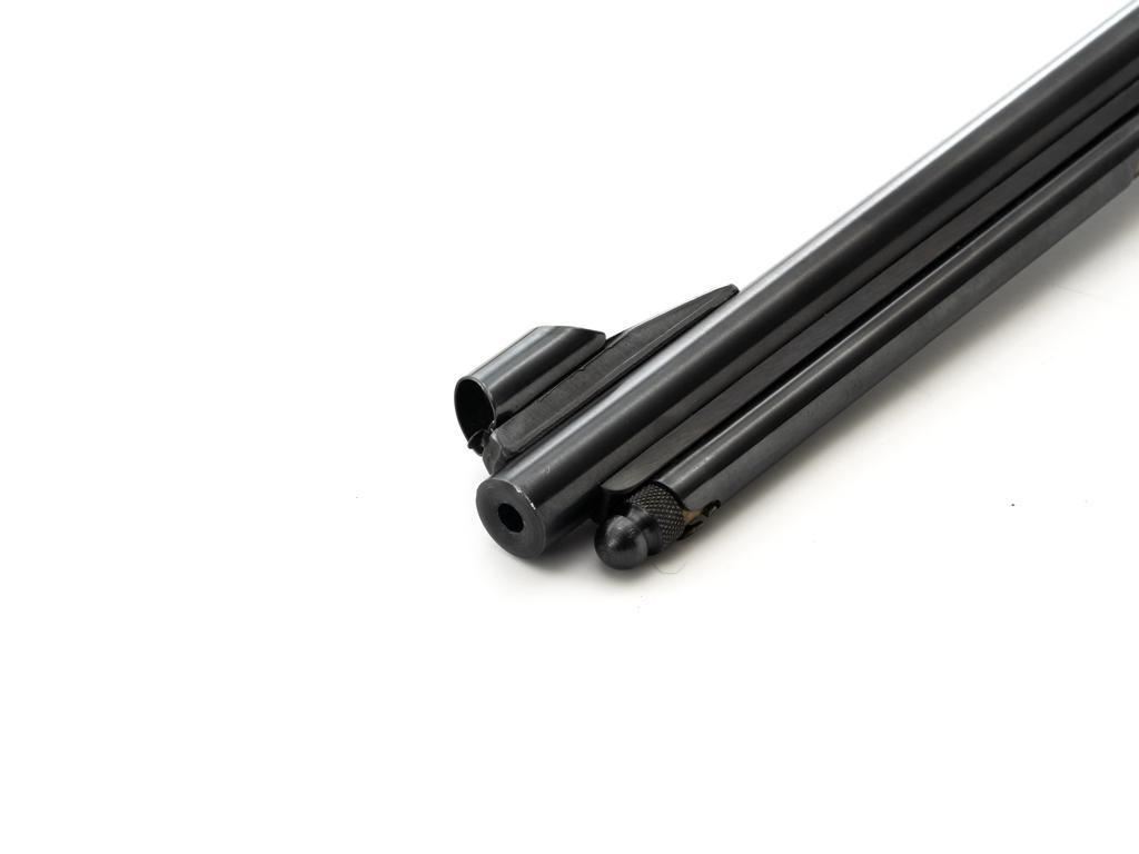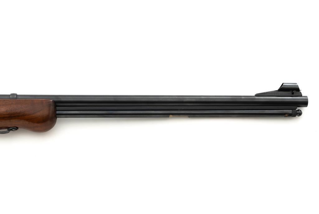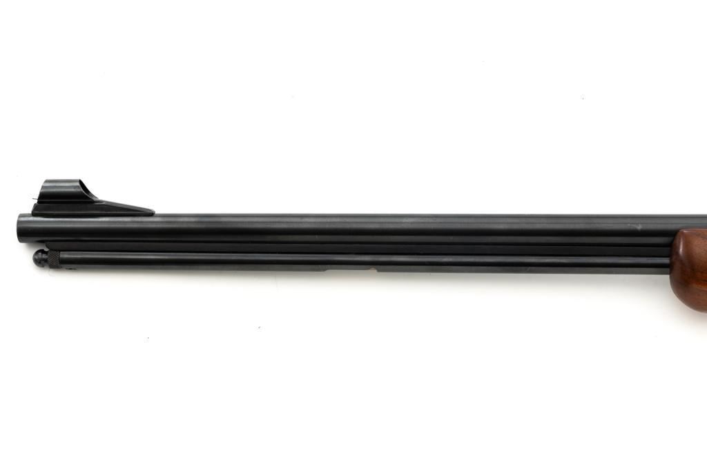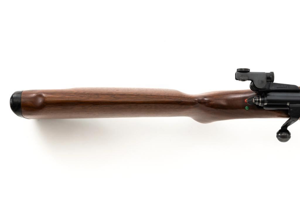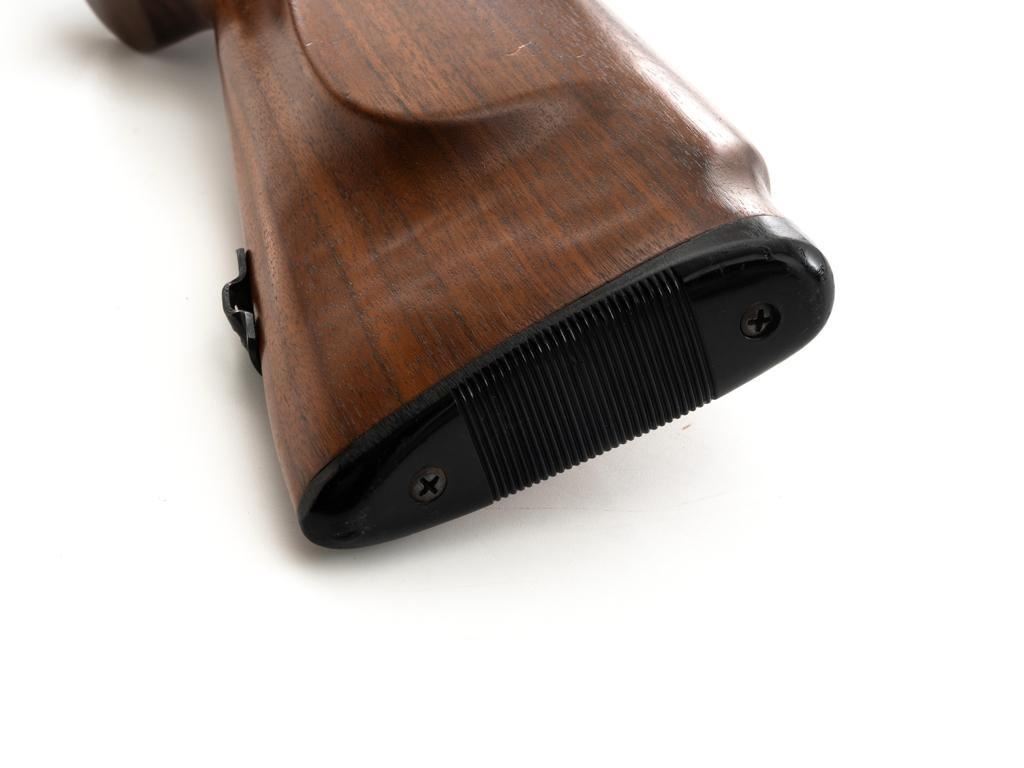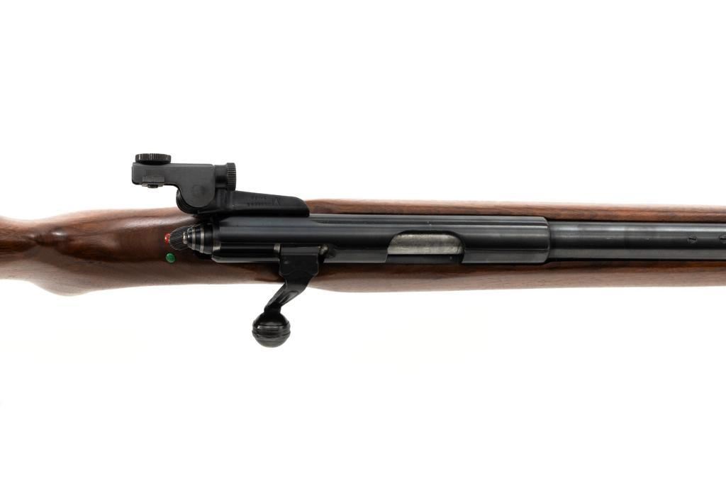 Mossberg Model 146B-A Bolt Action Rifle, #NVSN, .22 S-L-LR cal., 26" barrel, smooth walnut one-piece pistol grip stock with Schnabel forend and sling swivel mounts, hooded flip-up front sight, rear sight has been removed, Mossberg Model S-130 folding aperture sight at the left rear of the receiver, factory grooved receiver, and nylon finger groove trigger guard. Buttstock ends with a ribbed hard rubber buttplate, providing a 13.5" LOP. Mfgd circa 1954-58. Rifle is in near excellent overall condition, retaining approx. 96%-97% factory finish, showing light wear and minor handling marks. Stock is in near excellent condition with minor indentations and light storage marks. Action functions smoothly with a crisp trigger. Bright bore is near excellent with well-defined rifling. Est.: $200-$400. (C&R)