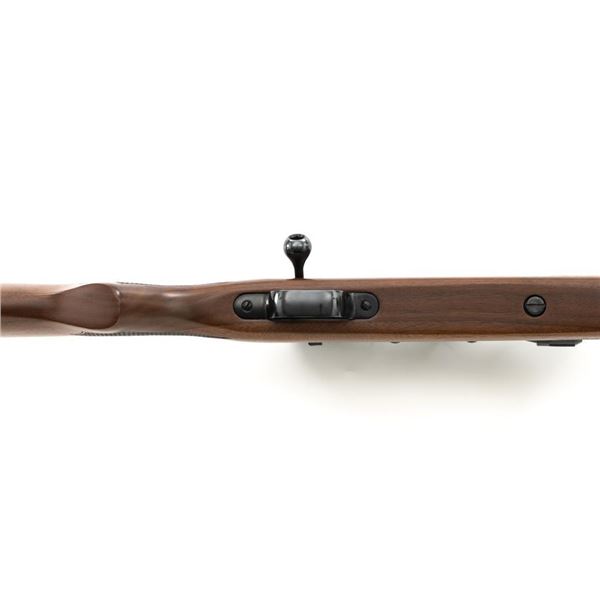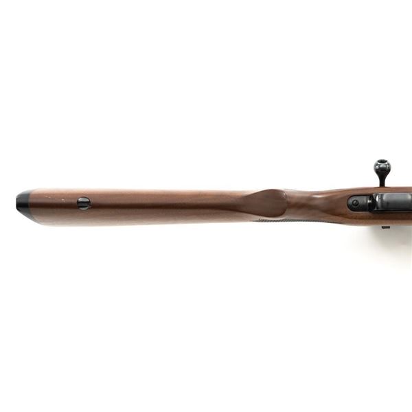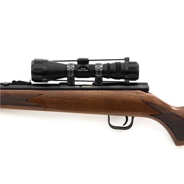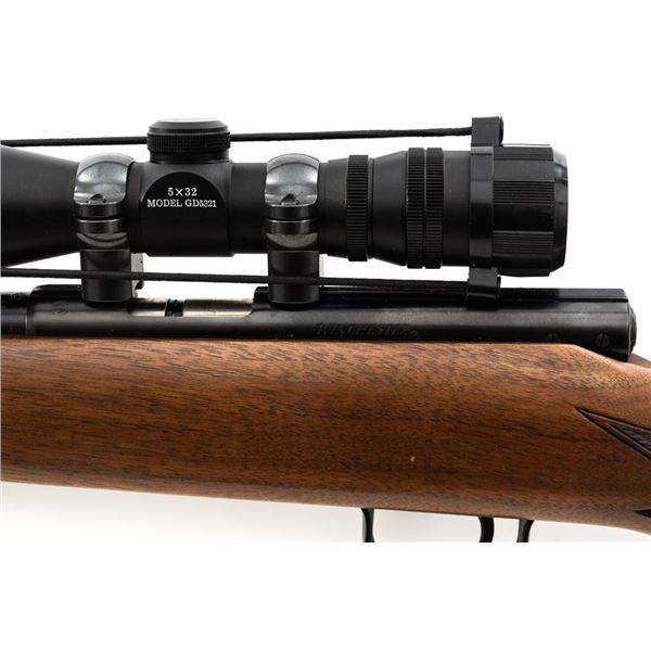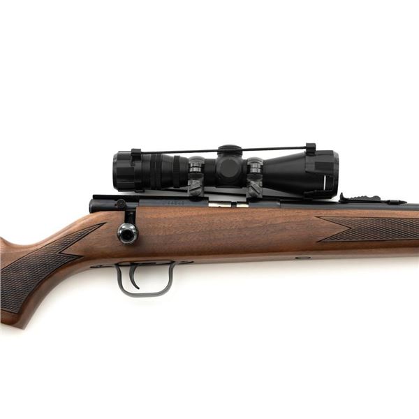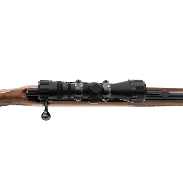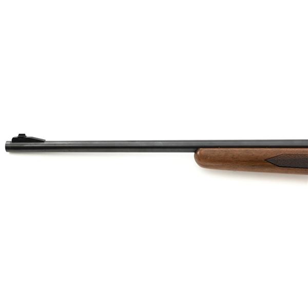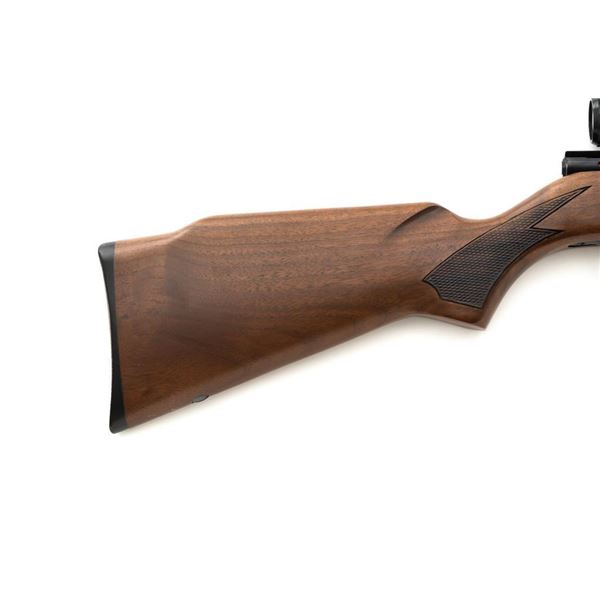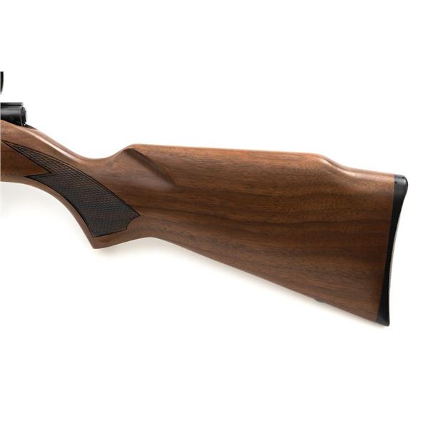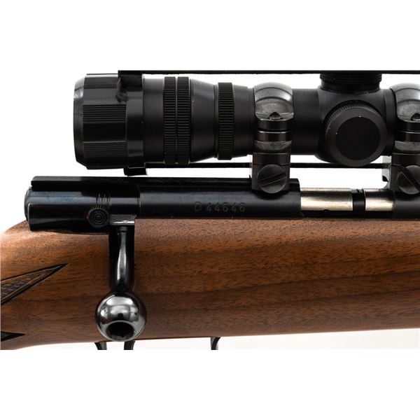 Winchester Model 310 Bolt Action Single Shot Rifle, #D44646, .22 S-L-LR cal., 22" barrel, blue finish, machine checkered hardwood one-piece Monte Carlo stock with sling swivel bases, steel bead ramped blade front and standard elevator rear sights, with factory grooved receiver. Factory markings are clear, with Winchester "WP" proofs on the barrel and receiver. Rifle is topped with an unmarked 5x32 scope, finished in matte black with a duplex reticle, and set of plastic lens covers. Scope is in excellent condition with clear, bright optics. Mfgd from 1972-75. Rifle is in excellent overall condition, retaining approx. 98%-99% factory finish, with only light handling marks, showing little use. Stock is in excellent condition with minor storage marks only. Action is crisp. Bore is mirror bright with excellent rifling. Est.: $200-$350. (Modern)