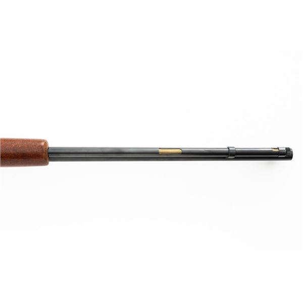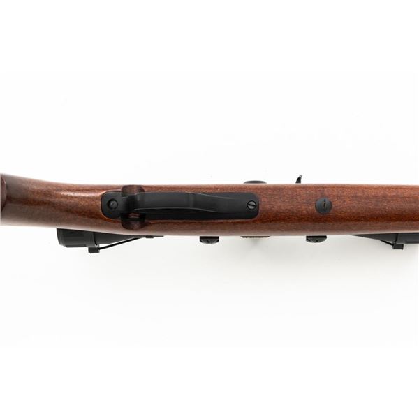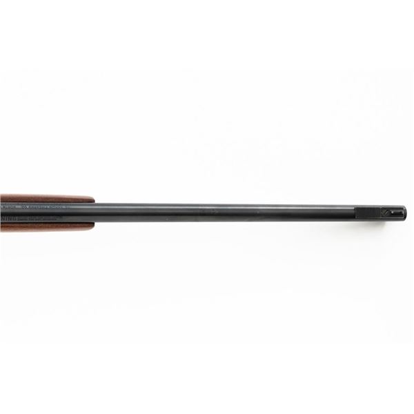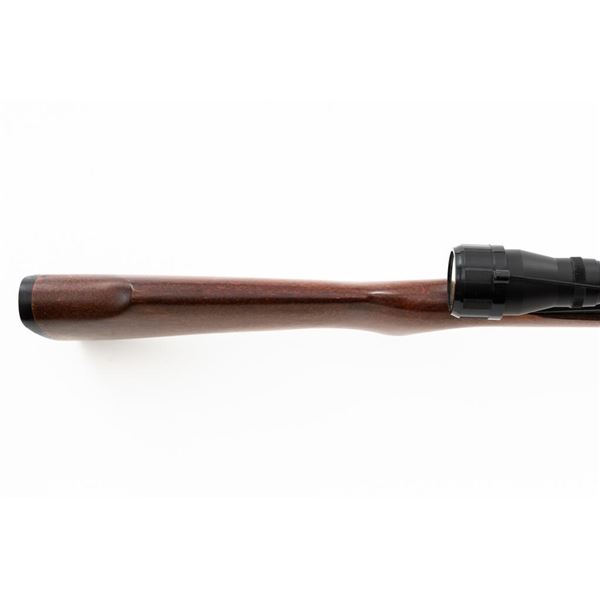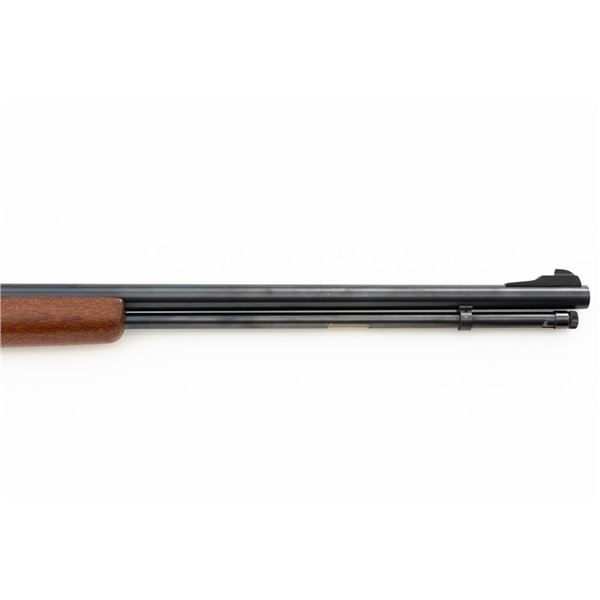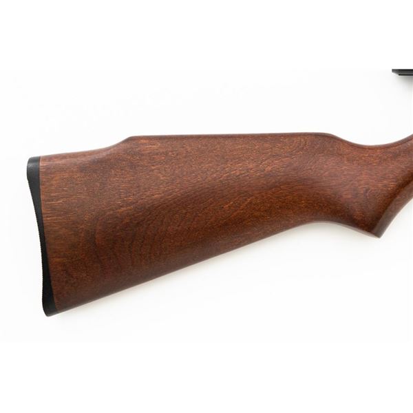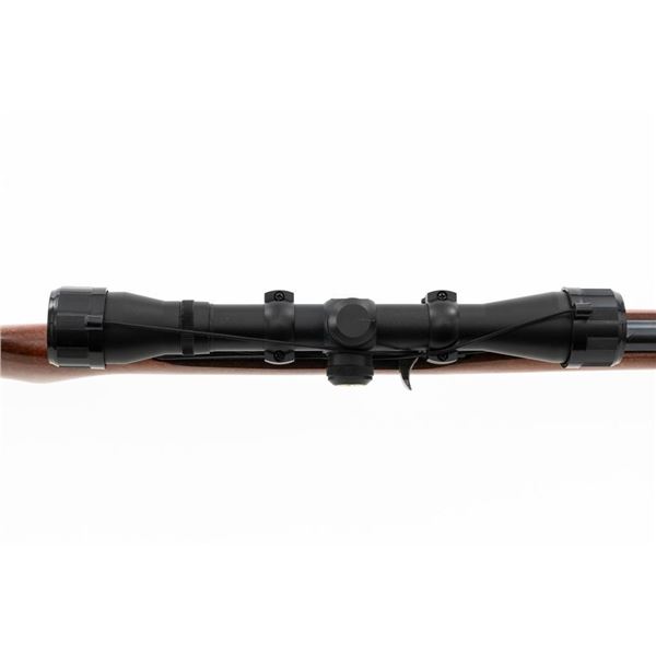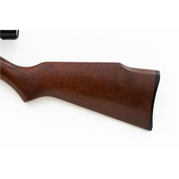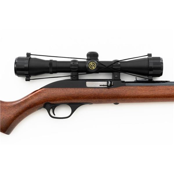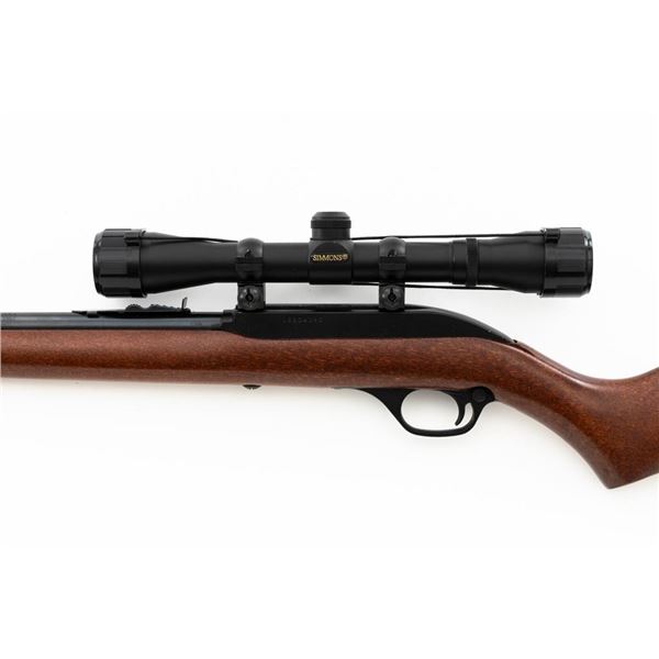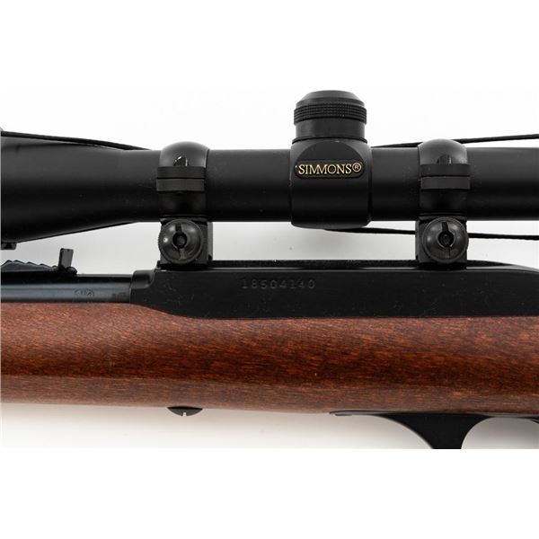 Marlin Model 60 Semi-Automatic Rifle, #18504140, .22 LR cal., 22" micro-groove barrel, blue finish, smooth hardwood one-piece Monte Carlo stock, ramped blade front sight, standard elevator "U"-notch rear sight, with factory grooved receiver. Left side of the barrel with a sharp Marlin "JM" proof. Topped with unmarked rings and a Simmons .22 MAG. 4x32 fixed power rifle scope, finished in matte black, with a duplex reticle, and includes a set of plastic lens covers. Scope is in excellent condition with clear, bright optics. Rifle is in excellent overall condition, retaining approx. 98%-99% factory finish, with only light marks to the metal and wood. Action is crisp. Bore is mirror bright with excellent rifling, showing little use. Est.: $150-$250. (Modern)