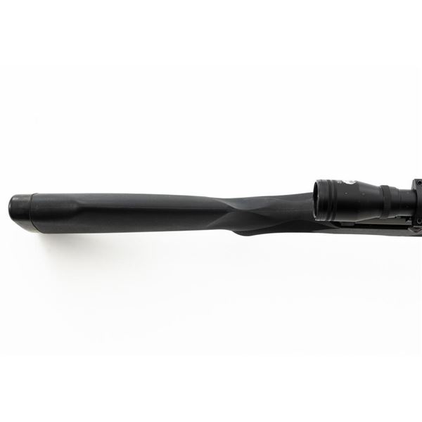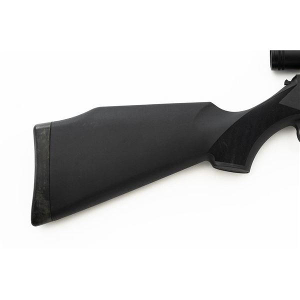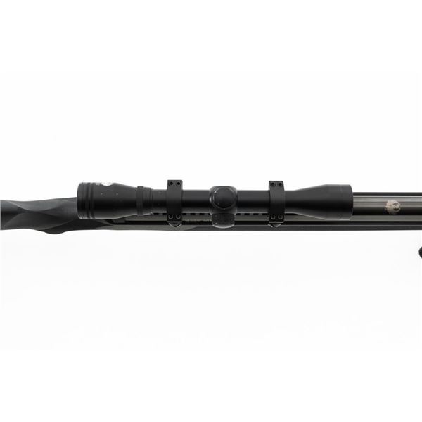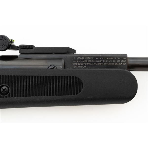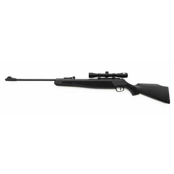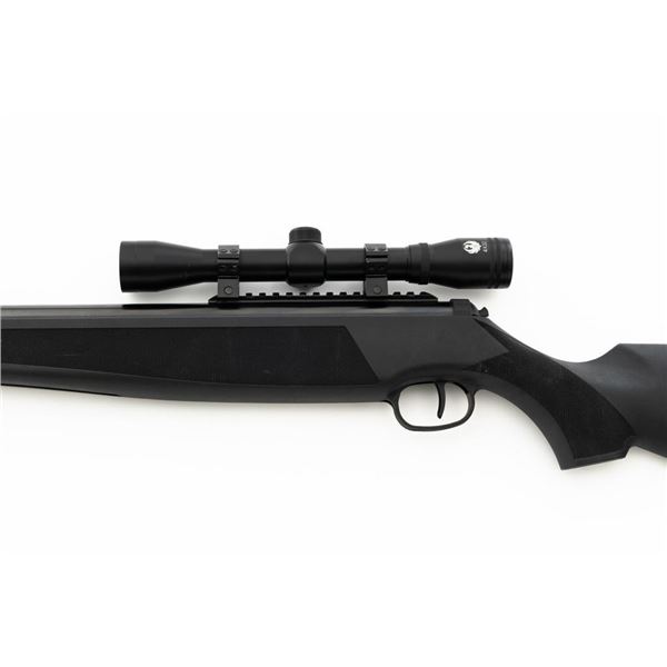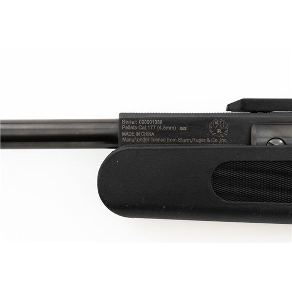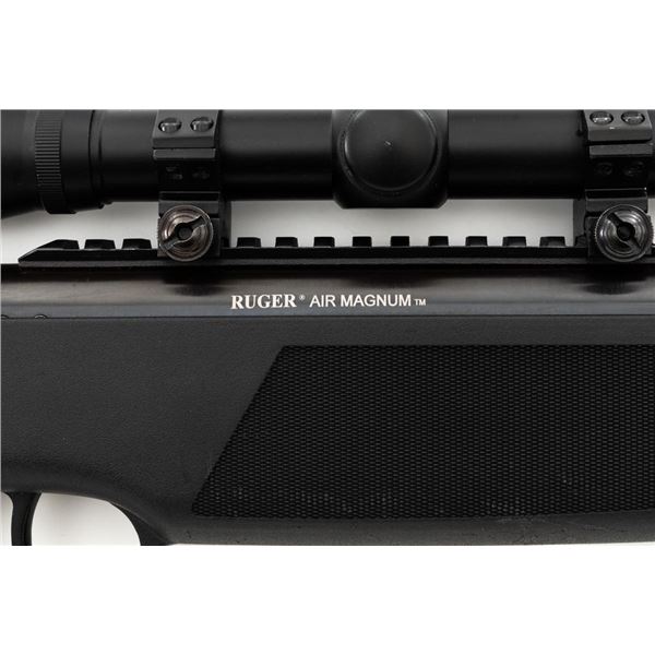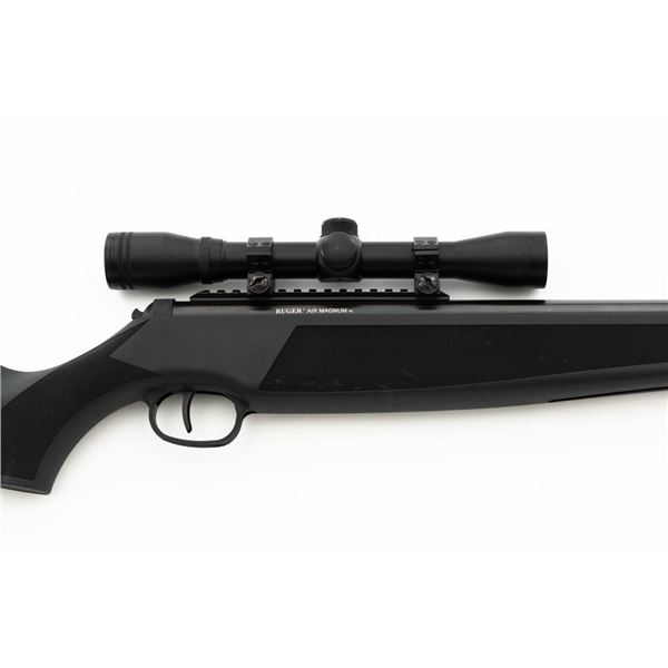 Umarex Ruger Magnum Air Rifle, #000001088, .177 cal., 19.5" rifled barrel, blued finish, ambidextrous black composite stock with rubber recoil pad, red fiber optic front sight, and green fiber optic rear sight. Includes Ruger branded 4x32 scope. Made in China, imported by Umarex. The rifle is in very good overall condition, showing light handling marks to both the metal surfaces and stock. Barrel bluing shows some frosted oxidation. Scope features a duplex reticle, optics are clear. Rifle holds air and functions as expected. Est.: $100-$200.
