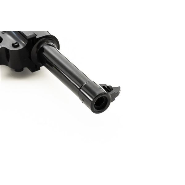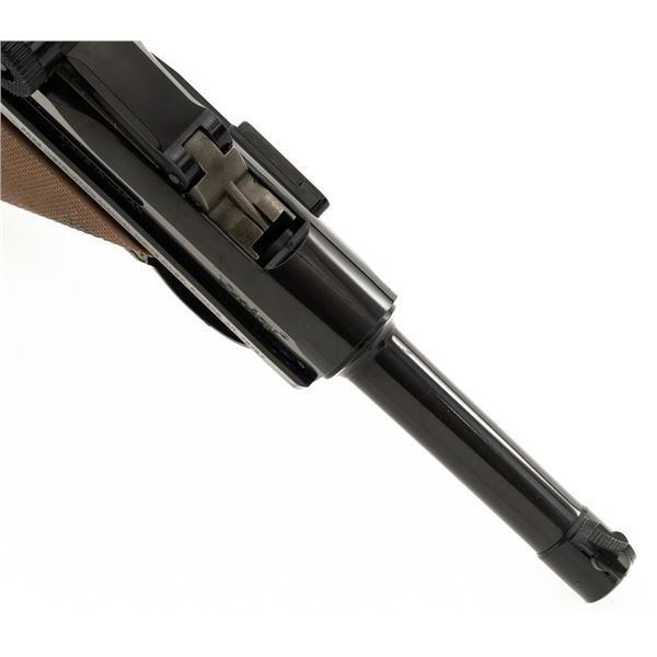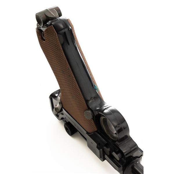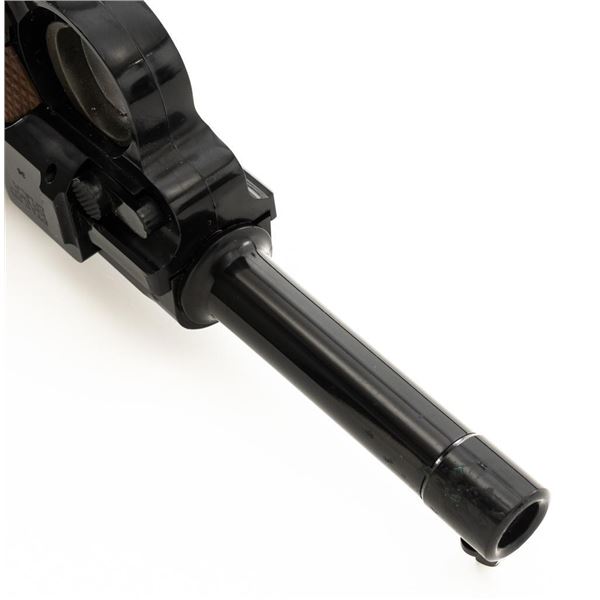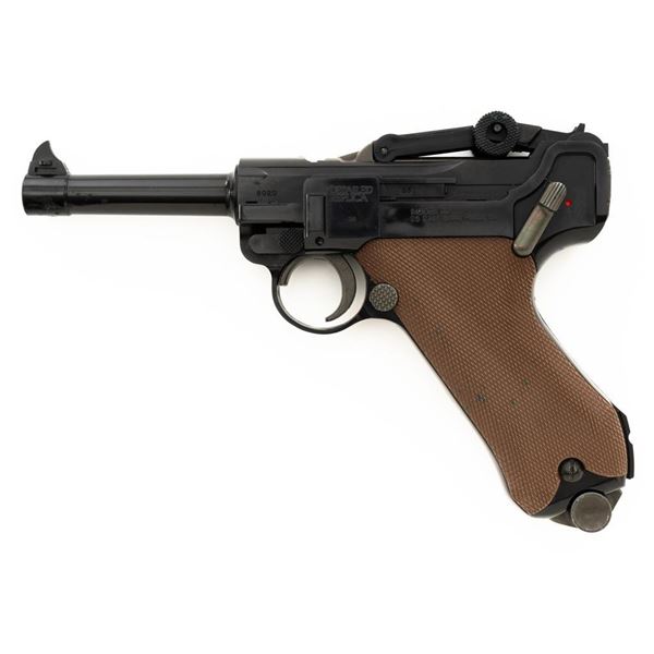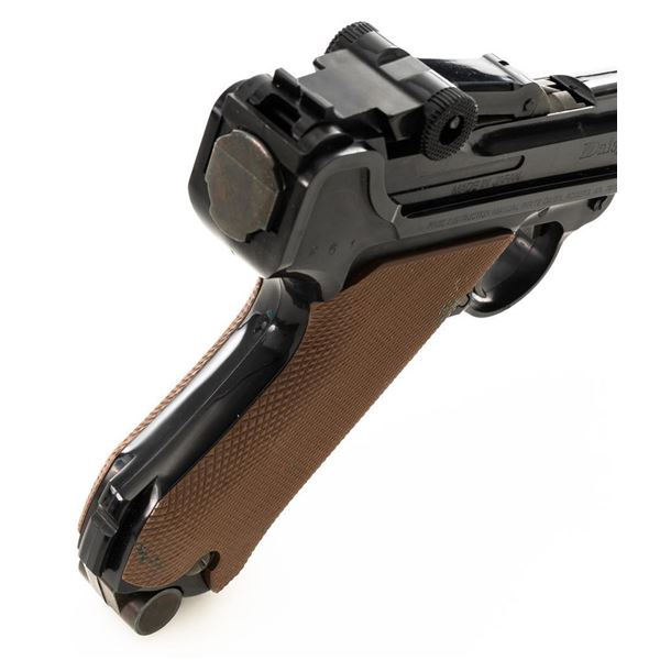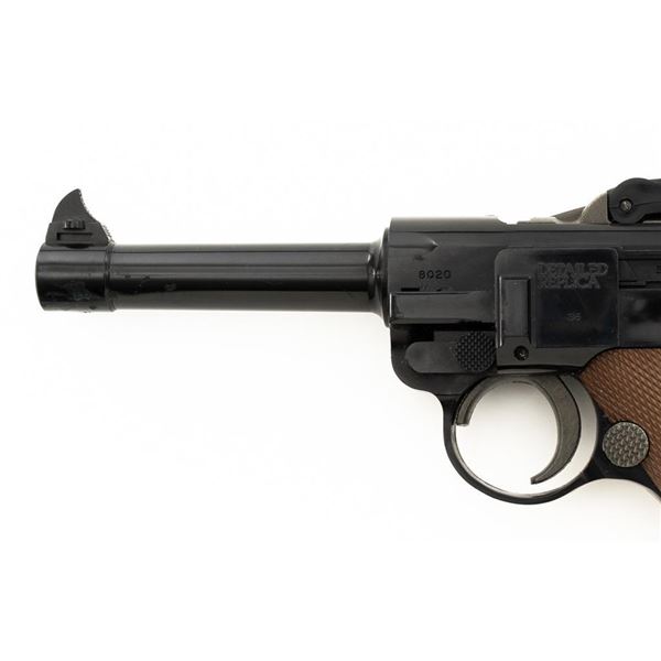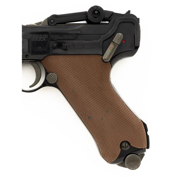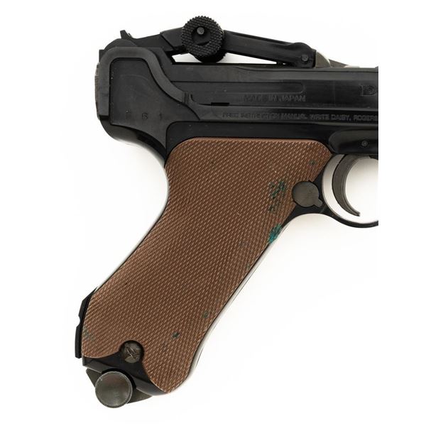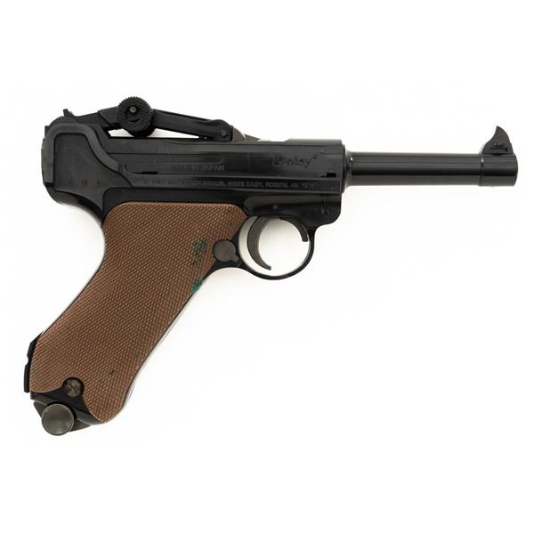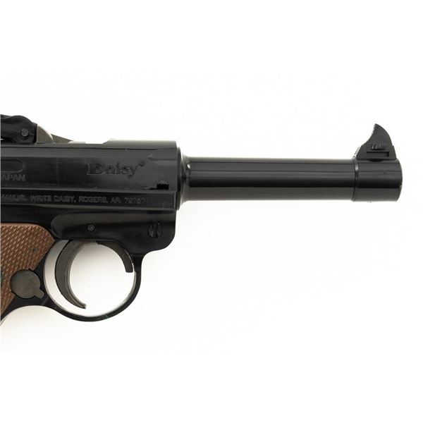 Detailed Daisy Replica P08 Luger Airsoft Pistol with Holster, 6mm cal., 4.25"barrel, black plastic frame, barrel, and action with checkered brown plastic grips. Includes one magazine. Black leather flap holster has a police type belt extension and a pocket for an extra magazine. Made in Japan. Condition overall is good. Right side frame has small scars from disassembly and a screw head is distorted and there is a small hairline crack to the adjacent frame. Grips are in excellent condition. Action operates smoothly. Est.: $75-$150. (Non-Gun)