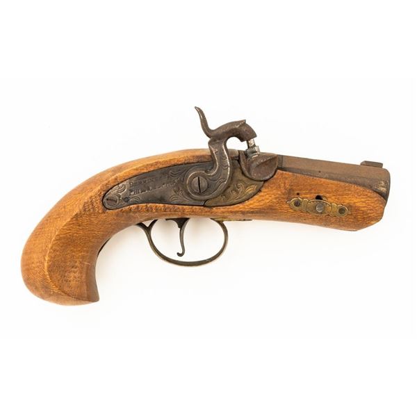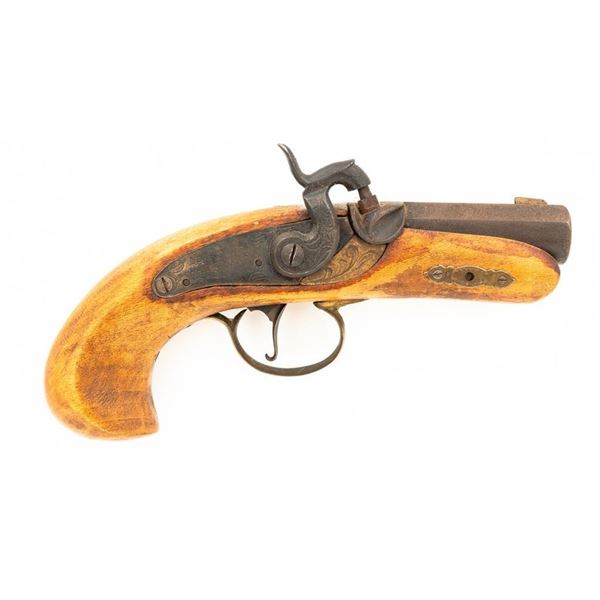 Lot of Three (3) Modern Percussion Pistols: 1.) Made in Spain, #10258, .40 cal., 10" barrel, "in the white", with hardwood stock. 2.) Made in Spain "Philadelphia Derringer", #0005604, .45 cal., 2.25" barrel, blued with brass trigger guard, hardwood stock. 3.) Unknown manufacturer "Philadelphia Derringer", #NVSN, .45 cal., 2.25" barrel, blued with brass trigger guard, hardwood stock. Condition of all three pistols is fair. All with varying degrees of surface rust to the exterior metal parts. Bores have rust which is mostly confined to the first inch of the barrel and nipples exhibit rust. Wood stocks are serviceable with numerous nicks, scratches, small holes and rub marks. There are no visible cracks in the wood. Small screws and pins may be missing from the hardware. Est.: $100-$200/lot. (No FFL Required)