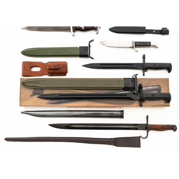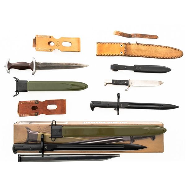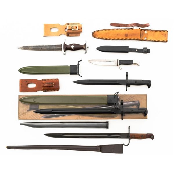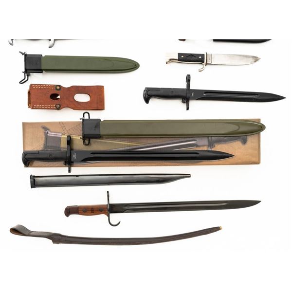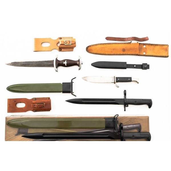 Reproduction Lot of Three (3) Bayonets, Two (2) Knives, and Two (2) Frogs: 1.) M1905 bayonet with scabbard and box. Made in China. In near excellent overall condition. 2.) Japanese Type 30 bayonet with scabbard. Marked "MADE IN INDIA". In excellent condition. 3.) U.S. M1 bayonet with scabbard. Made in China. In excellent overall condition. 4.) SA Dagger with Sheath, with standard German markings. Condition is fair with sharpening, wear, and toning. Pommel fits loosely. Scabbard is home made and tied with plastic cord, in fair condition. 5.) German HJ knife with scabbard, marked "SM/1940" and "GERMANY". HJ emblem is detached and included. Condition is fair with cracked handle and loose blade. Scabbard is very good. 6.) Finnish M91 Mosin Nagant leather scabbard, in very good condition. 7.) Japanese Type 30 leather scabbard, in good condition. 8.) Japanese Type 30 leather scabbard, in near excellent condition. All items are reproductions. Est.: $150-$300/lot.