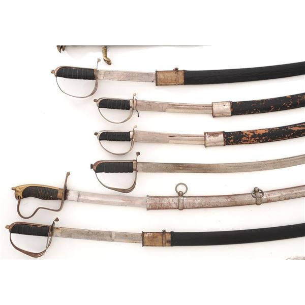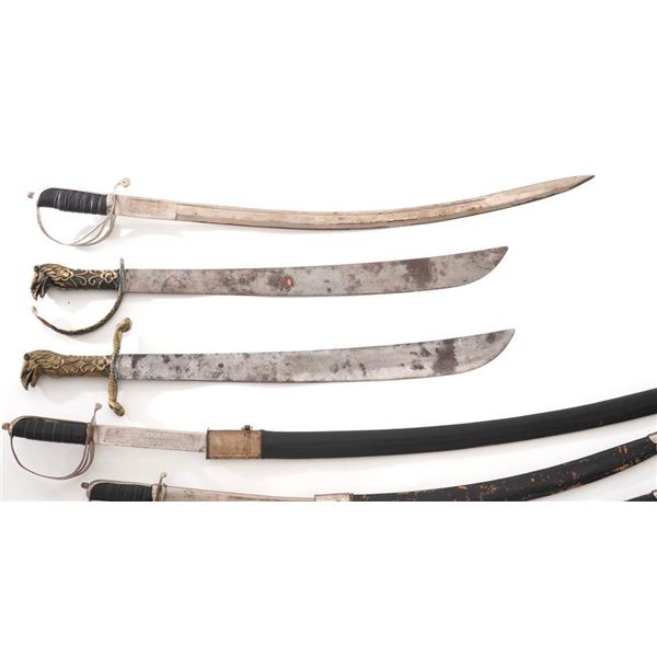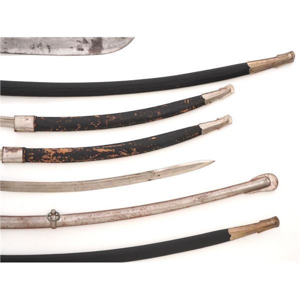Lot of Nine (9) Foreign Swords: 1.) Indian sword, 30"curved blade, black leather wrapped handle, acid etched "INDIA" with Hindi script on blade. 2.) Sikh marked Indian sword, 29"curved blade, black leather wrapped handle, acid etched "MADE IN INDIA" and with Sikh symbol and Hindi script on blade. 3.) Indian sword with scabbard, 32.25" blade, black leather wrapped handle, acid etched "MADE IN INDIA" with Hindi script and floral motifs on blade. 4.) Sword made from British Martindale machete blade, 23.5" blade, cast brass eagle head pommel. 5.) Sword made from British Martindale machete blade, 23.5"blade, cast brass eagle head pommel with cobra decorated hilt. 6.) Indian made cavalry saber with scabbard, 33.5" curved single edged blade, brass snake head pommel, with bow shaped hilt, and wire wrapped wooden handle. Blade is unmarked and has been polished bright. 7.) Indian sword with scabbard, 34" curved blade, wire wrapped leather handle, acid etched "MADE IN INDIA" with Hindi script and floral motifs on blade. 8.) Indian short sword, 21.25" blade, wire wrapped leather handle, acid etched "MADE IN INDIA" with Hindi script on blade. 9.) Indian short sword, 21.25" blade, wire wrapped leather handle, acid etched "MADE IN INDIA" with Hindi script on blade. Conditions range from fair to very good, showing varying degrees of age and wear, some with spots of light rust. A few of handles and guards fit loosely. Est.: $200-$400/lot.