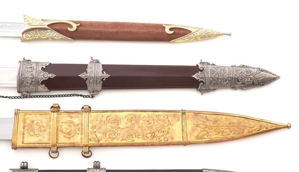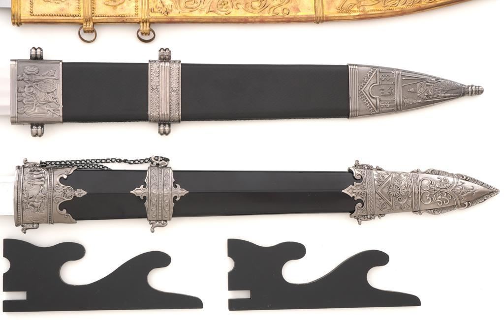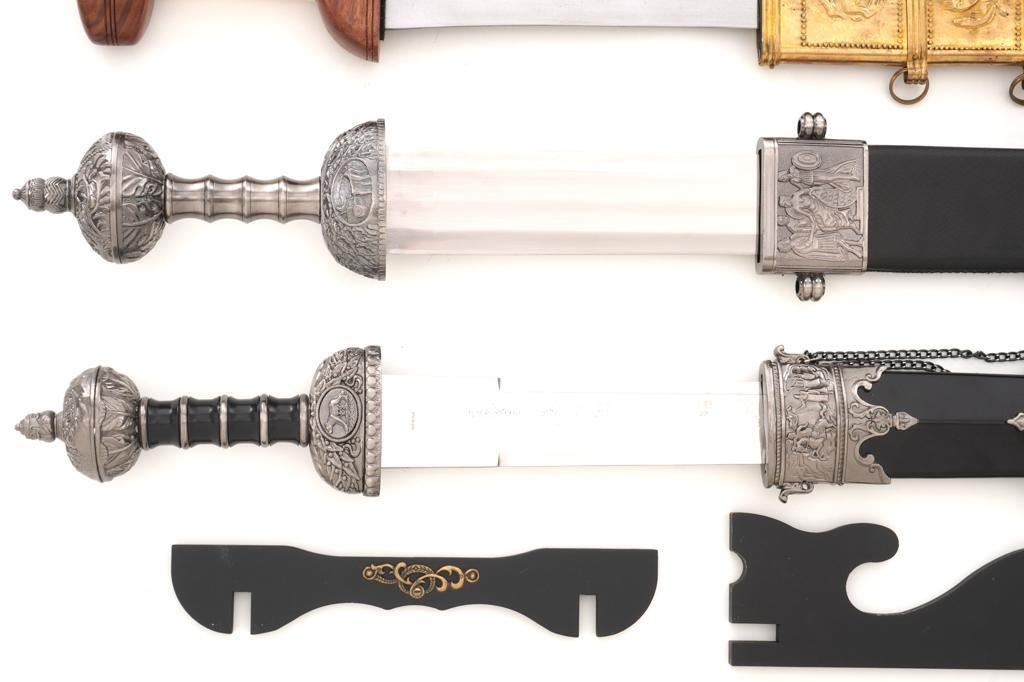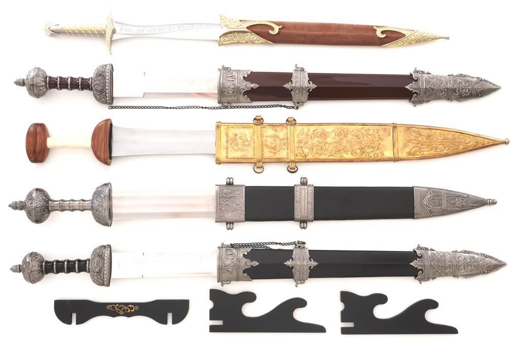 Lot of Five (5) Reproduction Roman Gladiator Style Swords. They are unmarked, other than a couple of the blades being labeled "Stainless". Blade lengths range from 17.5" to 22". Three (3) of the scabbards are plastic, another is covered with thin metal, and the last is a combination of suede and plastic. An info sheet is provide for a shop in Italy that sells items like these. Also included is a wood stand that will hold two (2) swords. All are in near excellent to excellent condition, with only light handling marks. Est.: $200-$400/lot.
