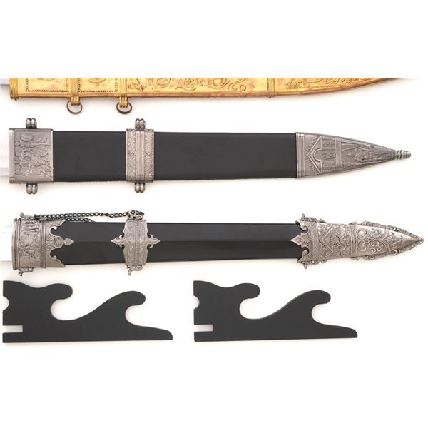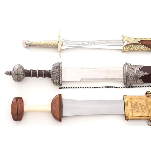 Lot of Five (5) Reproduction Roman Gladiator Style Swords. They are unmarked, other than a couple of the blades being labeled "Stainless". Blade lengths range from 17.5" to 22". Three (3) of the scabbards are plastic, another is covered with thin metal, and the last is a combination of suede and plastic. An info sheet is provide for a shop in Italy that sells items like these. Also included is a wood stand that will hold two (2) swords. All are in near excellent to excellent condition, with only light handling marks. Est.: $200-$400/lot.