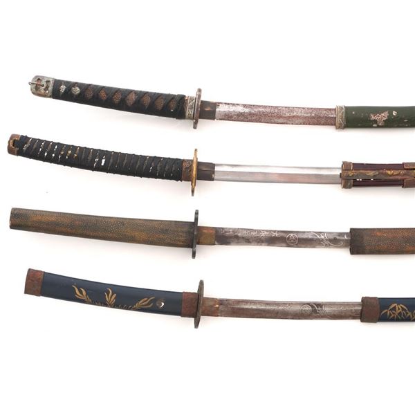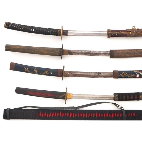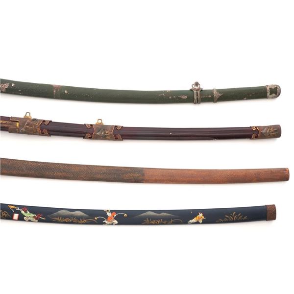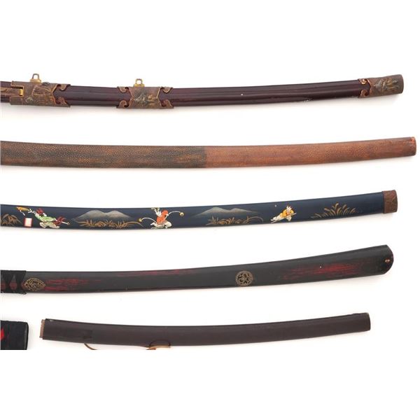 Lot of Five (5) Reproduction Japanese Style Swords and Two (2) Scabbards, most likely Chinese manufacture, blade lengths range from 27.5" to 30.5". Two of the blades are clean with minor nicks. Remaining three show varying degrees of surface rust on the blades, that ranges from light to heavy. Handles are eel skin, wrapped eel skin or lacquer. Ones of the sheaths has a visible crack. The remainder do not but lacquer finishes do have chips and loose hardware. Est.: $150-$250/lot.