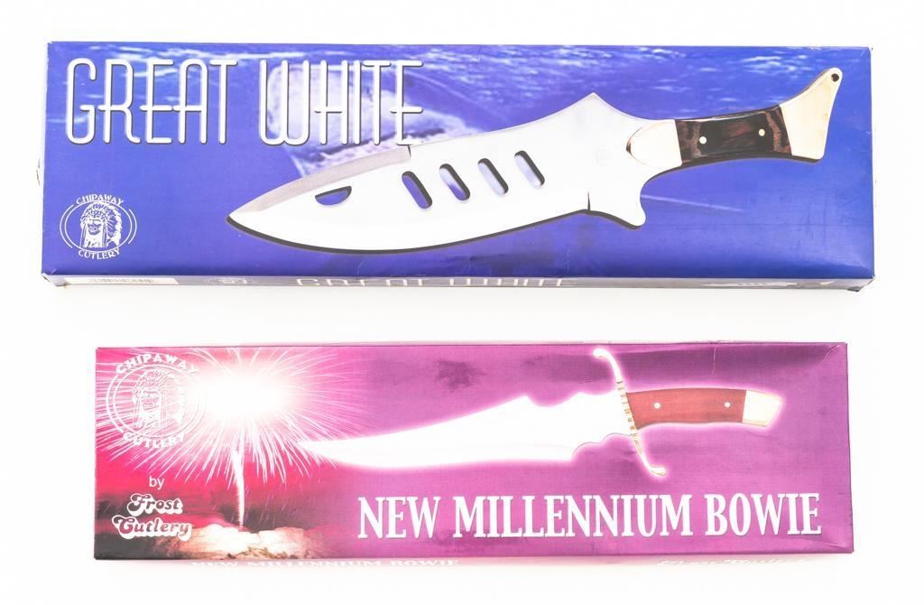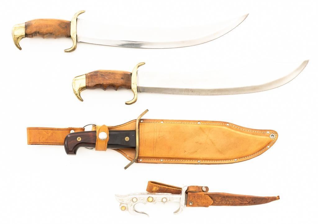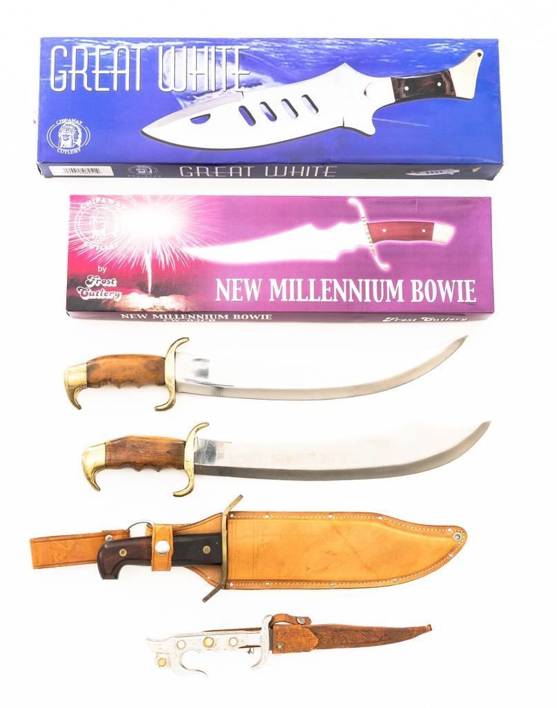Lot of Six (6) Fantasy Style Bowie Knives, manufactured in Pakistan, China, and the Philippines. Blade lengths range from 7" to 13". Conditions range from good to new old stock in the box. Est.: $100-$200/lot.