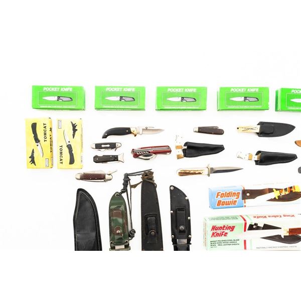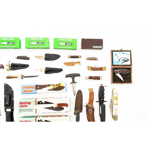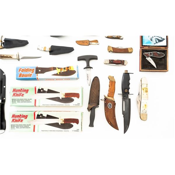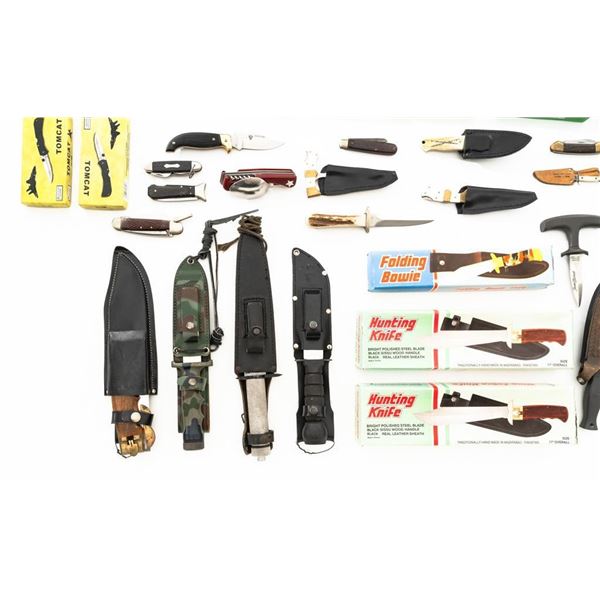 Lot of Thirty-Six (36) Folding and Fixed Blade Knives, consisting of twenty-three (23) folding knives and thirteen (13) fixed blade knives. Manufacturers include Frost Cutlery, Parker Cut Co., CVA Italy, Compass, Nieto, Edgemark, Moscow, Taylor Cutlery, LF&C, Ka-Bar, Camillus, Schrade, and C.Risner Cutlery Co. Others are marked only Pakistan, Taiwan, and China. Conditions range from good with chips to the blade to new old stock in the box. Est.: $250-$450/lot.