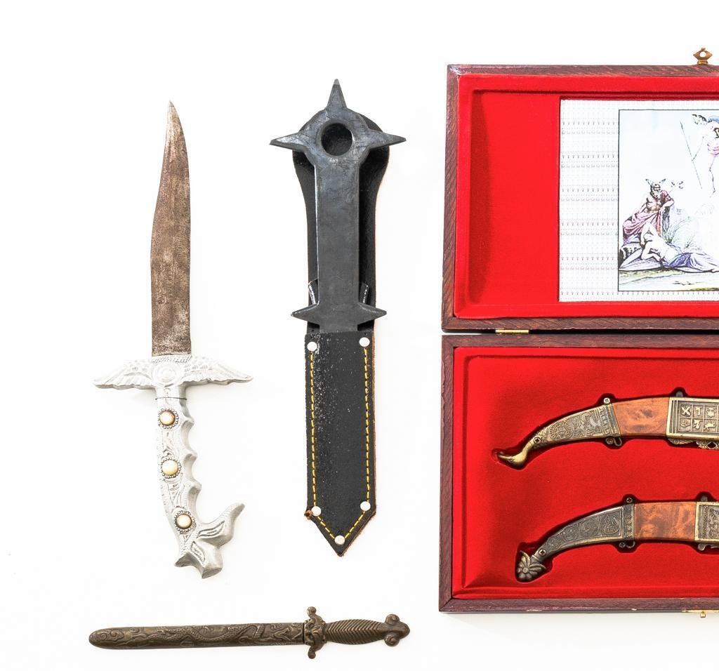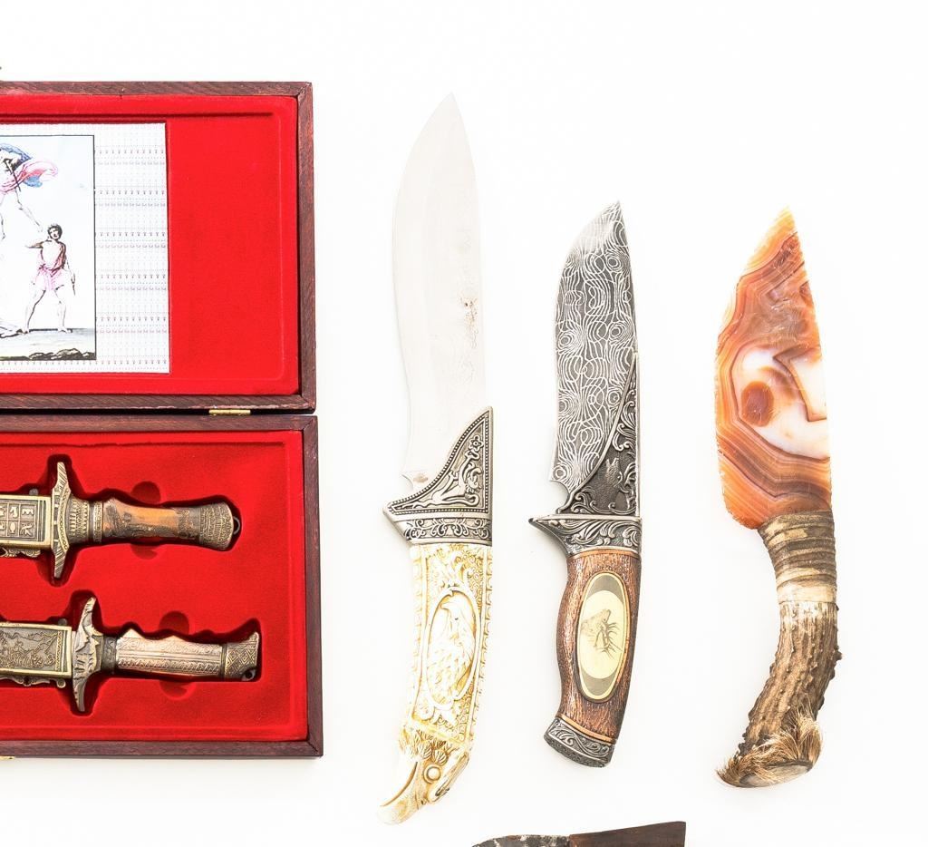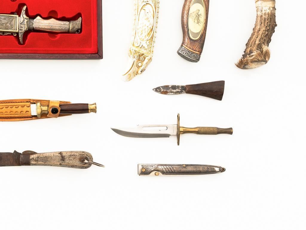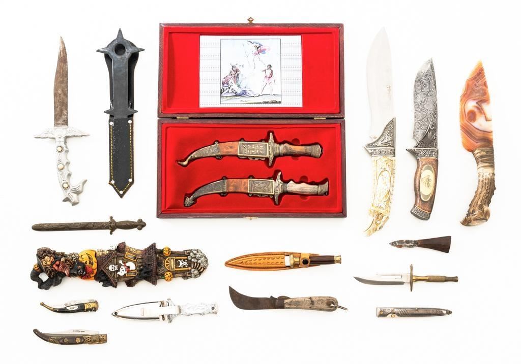 Lot of Seventeen (17) Fixed Blade and Folding Novelty Knives, consisting of thirteen (13) fixed blade knives and four (4) folding knives. One of the fix blades has an obsidian type blade and horn handle. Manufactured in China, Pakistan, Spain, and several are unmarked. Conditions range from fair with surface rust on the blades to very good. Est.: $150-$250/lot.