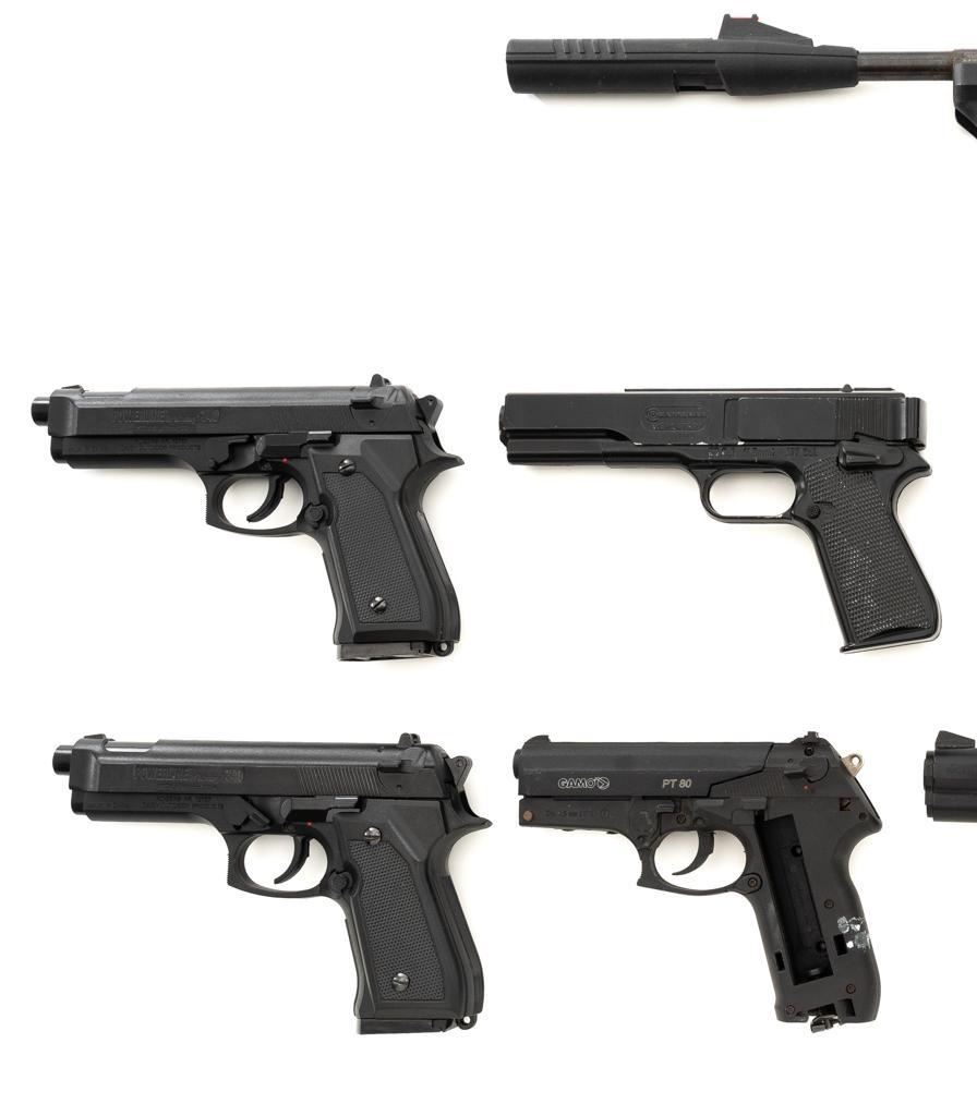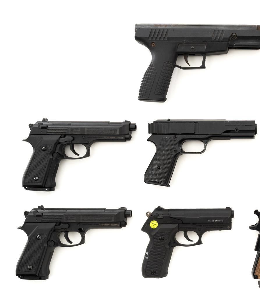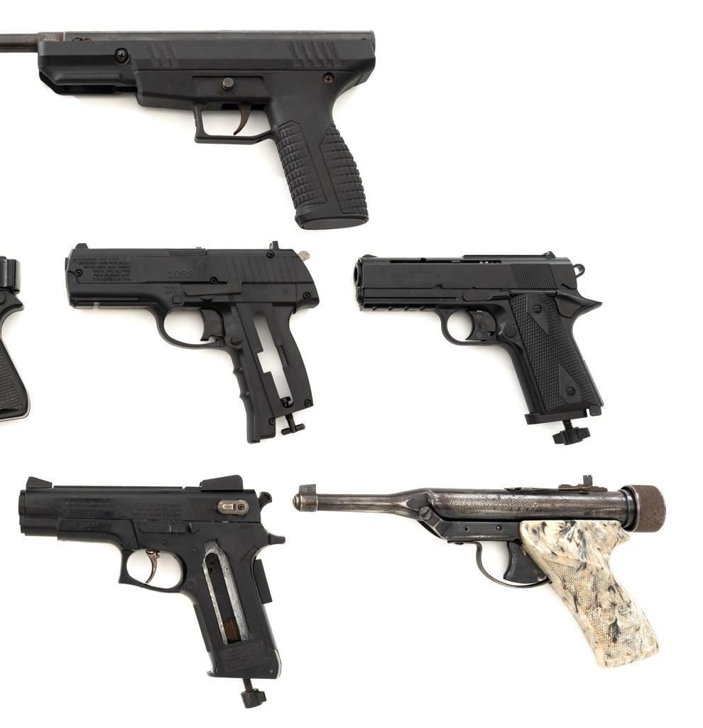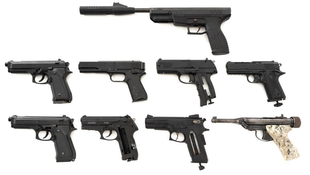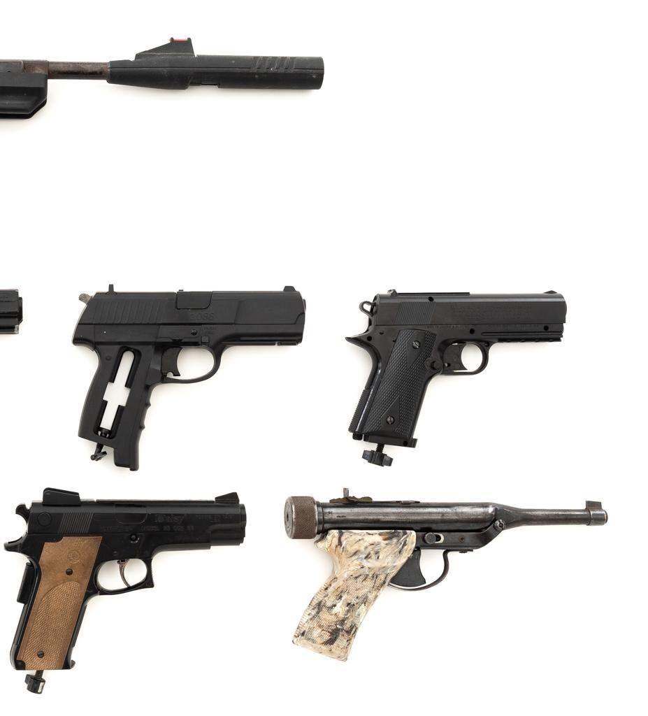 Lot of Nine (9) Air Pistols. 1.) Hy Score Target Model,.177 cal., 10.25" barrel, blued finish. Pistol is in good overall condition. Bluing has thinned and faded. There is light surface rust in areas. 2.) Benjamin Model BBP77,.177 cal., 11.25" barrel, blued finish. Pistol is in good overall condition. There is light to moderate surface rust throughout. 3&4.) Daisy Model 340, .177 cal., 3.5" barrel, black plastic slide, and frame. Both are in very good condition, with only minor marks from handling and use. 5.) Daisy Model 15XT,.177 cal., 4.5" barrel, black plastic slide, and frame. Pistol is in very good condition with only minor marks from handling and use. 6-9.) Gamo PT80, Marskman Repeater, Crossman 1088, and Daisy 92. These are all missing parts and are for parts only. None of the guns in this lot have been test fired. Est.: $200-$300/lot.