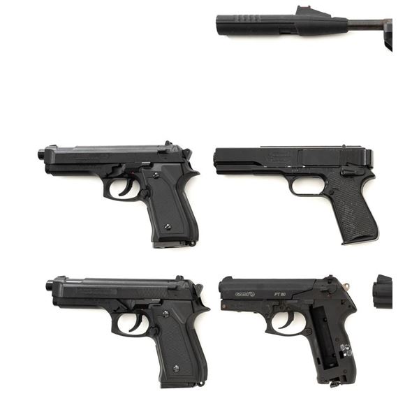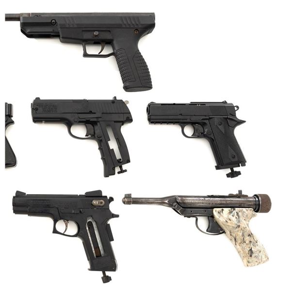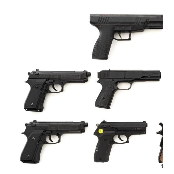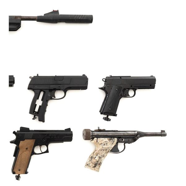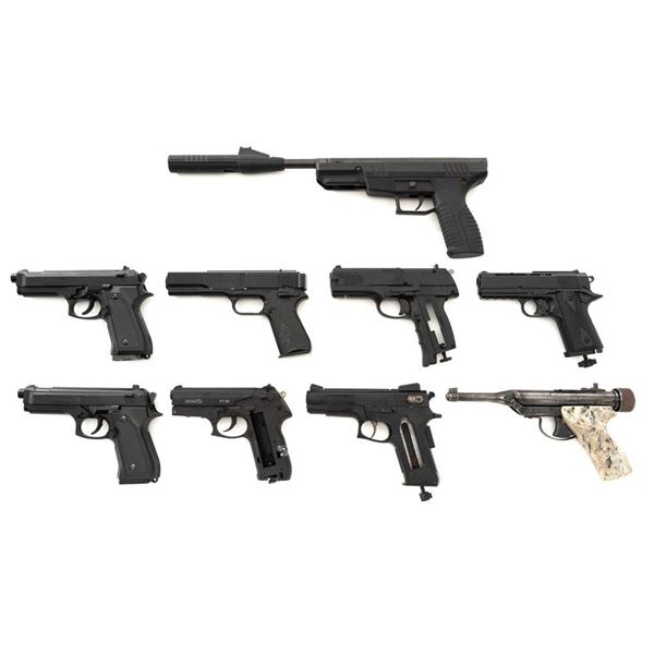 Lot of Nine (9) Air Pistols. 1.) Hy Score Target Model,.177 cal., 10.25" barrel, blued finish. Pistol is in good overall condition. Bluing has thinned and faded. There is light surface rust in areas. 2.) Benjamin Model BBP77,.177 cal., 11.25" barrel, blued finish. Pistol is in good overall condition. There is light to moderate surface rust throughout. 3&4.) Daisy Model 340, .177 cal., 3.5" barrel, black plastic slide, and frame. Both are in very good condition, with only minor marks from handling and use. 5.) Daisy Model 15XT,.177 cal., 4.5" barrel, black plastic slide, and frame. Pistol is in very good condition with only minor marks from handling and use. 6-9.) Gamo PT80, Marskman Repeater, Crossman 1088, and Daisy 92. These are all missing parts and are for parts only. None of the guns in this lot have been test fired. Est.: $200-$300/lot.