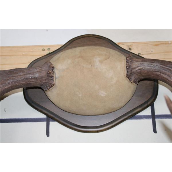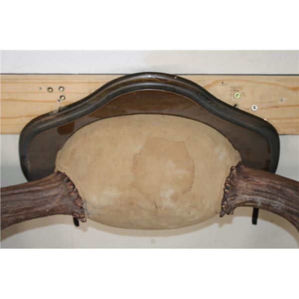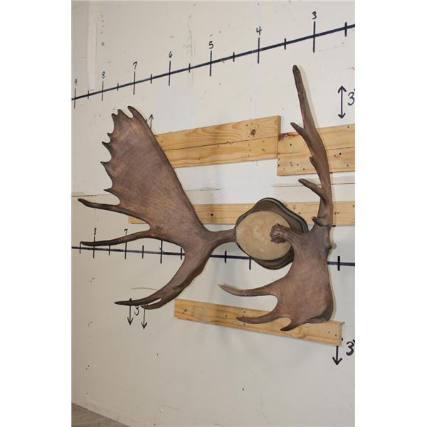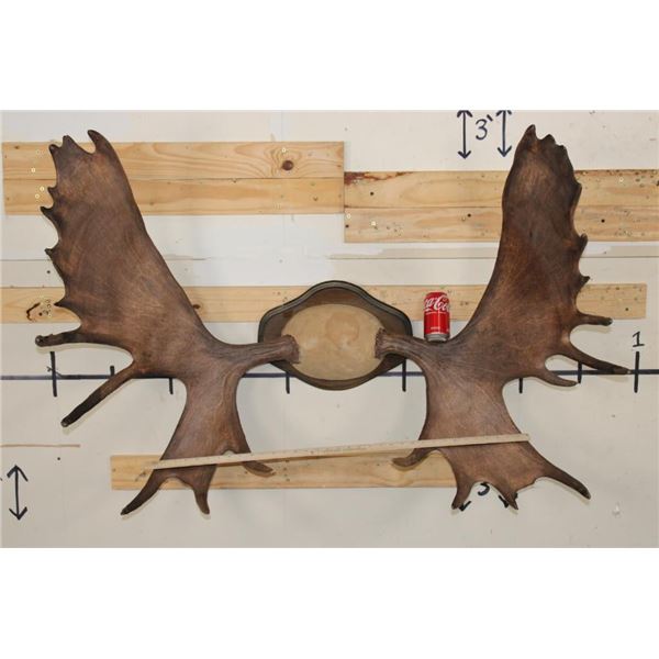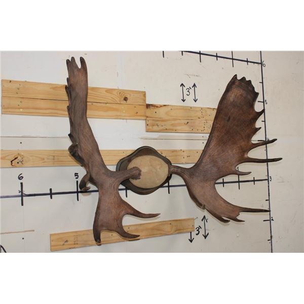 Respectable MOOSE Antler Rack Mounted on a Wooden Plaque with Suede. It was "Taken" 8-27-1967 in Alaska-Yukon and has a 48" Spread. The suede has a stain. TAXIDERMY
