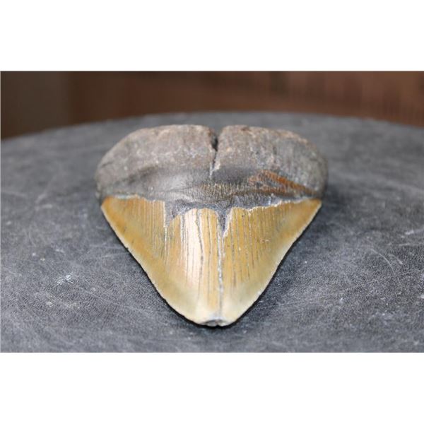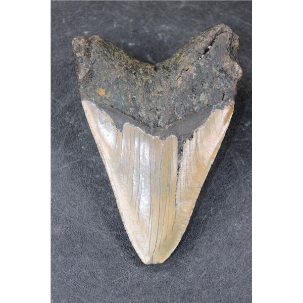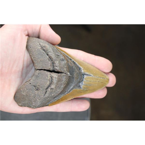 Massive XXL MEGALODON Shark Tooth Fossil. It measures a whopping 5 3/8" from the Top Corner to the Tip. The Total Weight is 12 oz or .75 lbs. MEGALODON SHARK TEETH