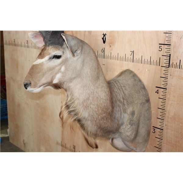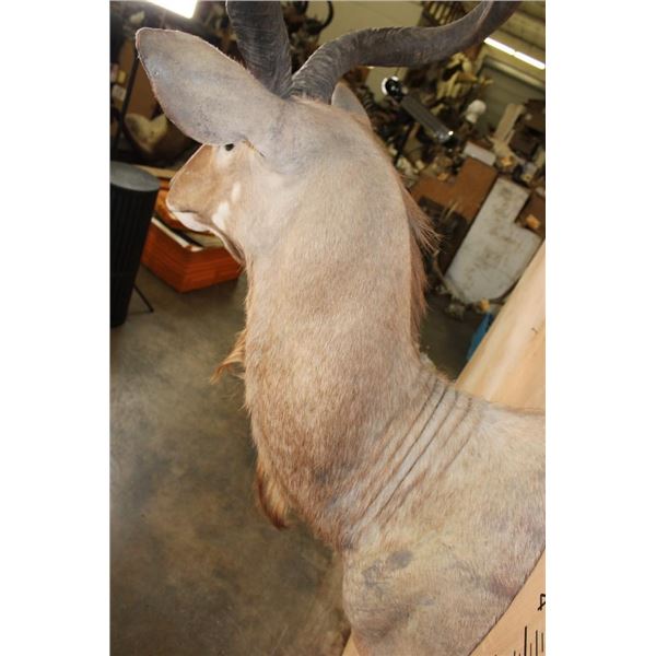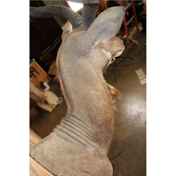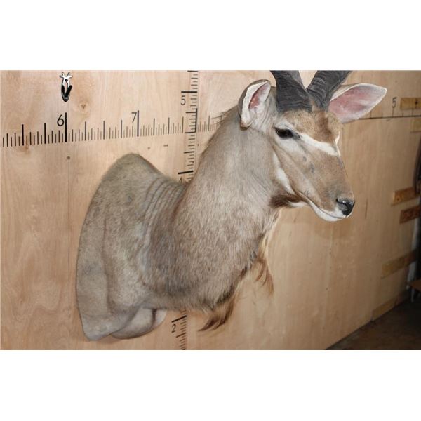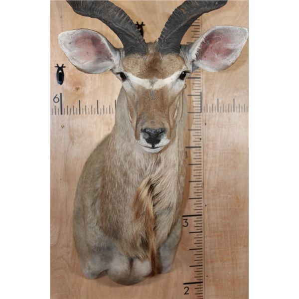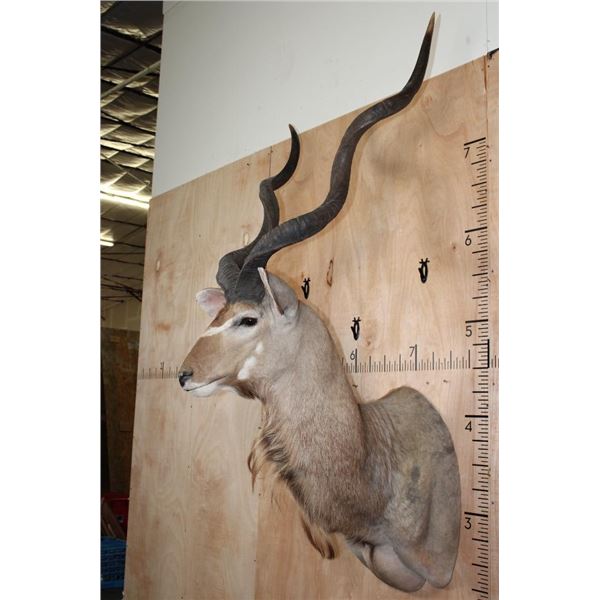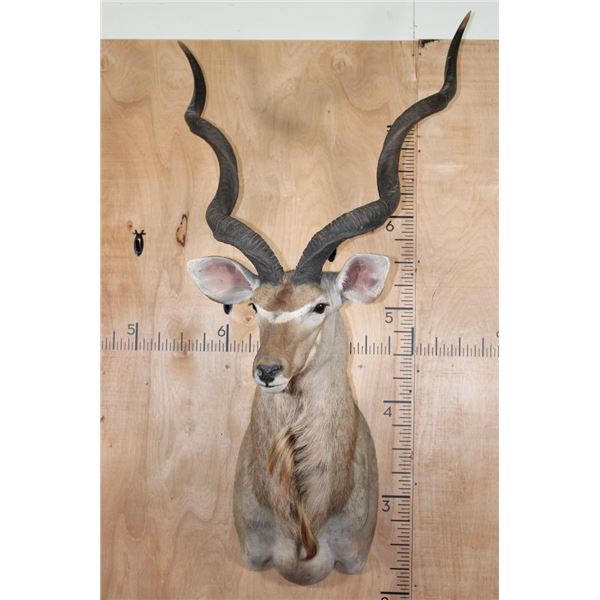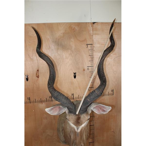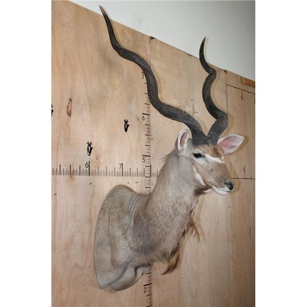 Very Nice, Clean, and Newer KUDU Shoulder Mount. The Left Horn measures 50.75" and the Right Horn 50" around the Spiral Ridge. It is in Very Good Condition. TAXIDERMY