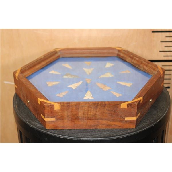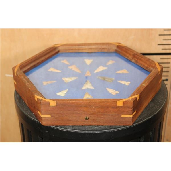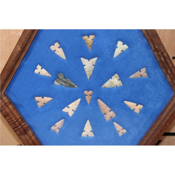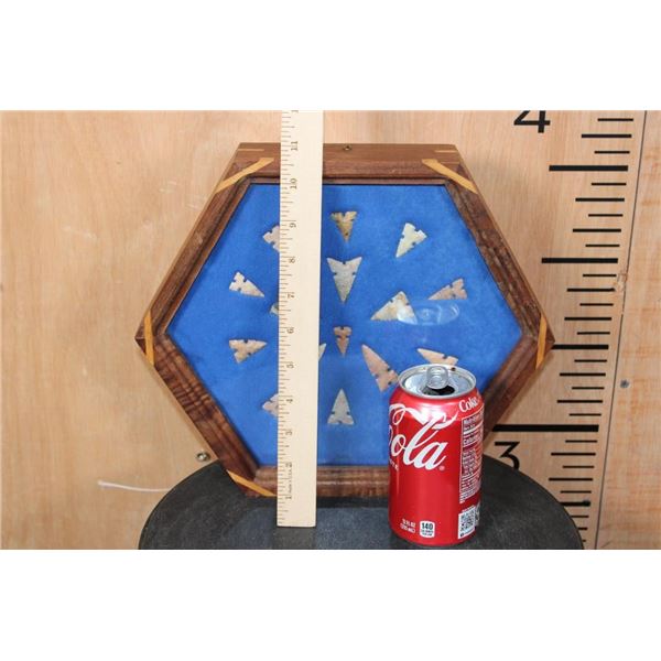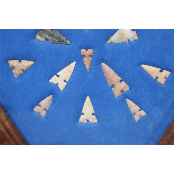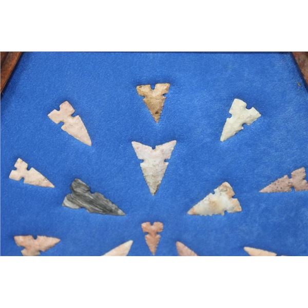 16 Very Nice Cahokia ARROWHEAD Points. The Points measure 1" to 1.5" Long each. The Wood and Glass Case measures 10" Tall x 12" Wide. The Total Weight is 2 lbs 3 oz. *While these arrowheads came from an estate of a long-time collector; we as the auction company are not going to get into a protracted discussion about age and authenticity. This collector has no paperwork or COA as to age or authenticity. While we believe the vast majority; if not all to be old; we are wholly uncomfortable with an argument with qualified and unqualified, alleged authorities. All of that to say; we are not guaranteeing age or authenticity* ARROWHEADS