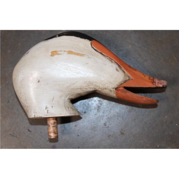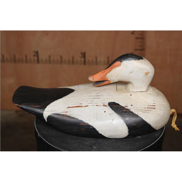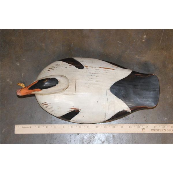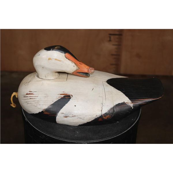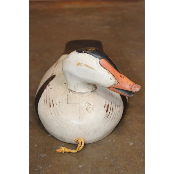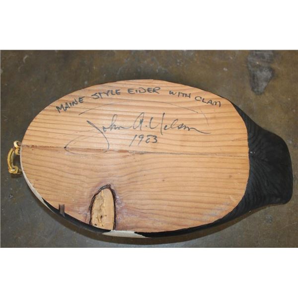 "Maine Style Eider with Clam" Hand-carved and Painted Wooden Duck Decoy. It is Signed by John A. Nelson 1983 and has a removable swivel head. It measures 16.5" Long x 8" Wide x 7" Tall and Weighs 3 lbs 10 oz. John A. Nelson (1940-2020) moved to Texas in 1980 whre he began to make his mark as a master wood craftsman, folk artist, and decoy carver. His decoys have been featured in national art galleries, and his folk art carvings are a prized possession in many households today. COLLECTIBLE DUCK DECOYS