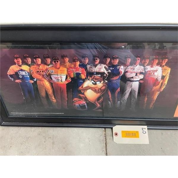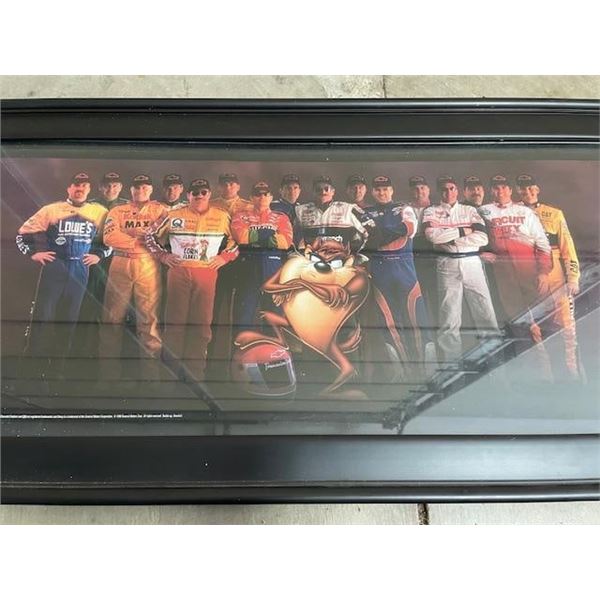 *Rare* Dale Ernhardt Signed Vintage Nascar Team Monte Carlo Tasmanian Devil Poster from 1998. It is displayed in a Wood and Glass Frame that measures 37" Wide x 13" Tall. COLLECTIBLE NASCAR POSTERS