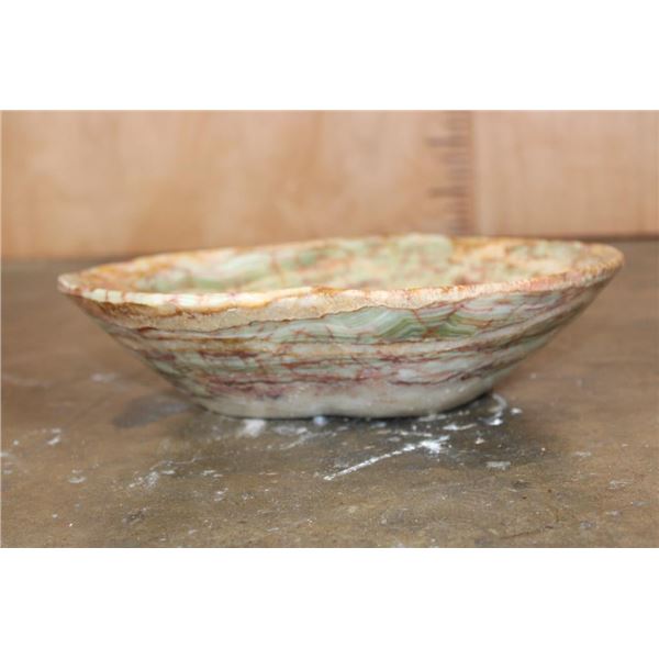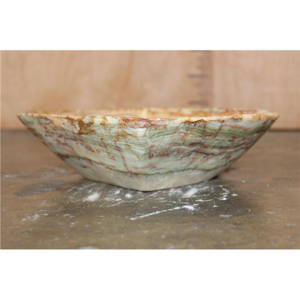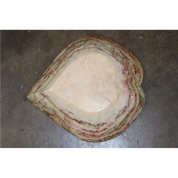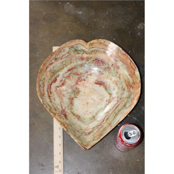 Big Beautiful Heart Shaped BOWL Carved from a single piece of GREEN BANDED ONYX. It measures 13.75" Long x 12.5" Wide x 3" Tall. The Total Weight is 8.8 lbs. Green banded onyx is a naturally banded stone valued for its visual appeal and metaphysical properties like promoting emotional stability, courage, and clarity. ROCKS MINERALS FOSSILS