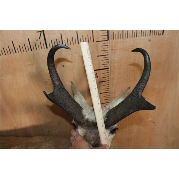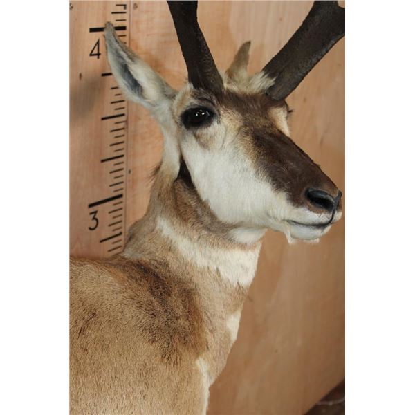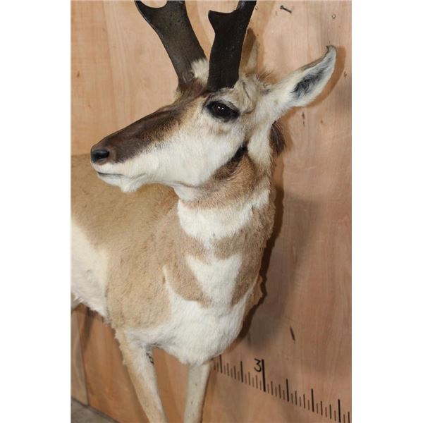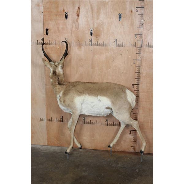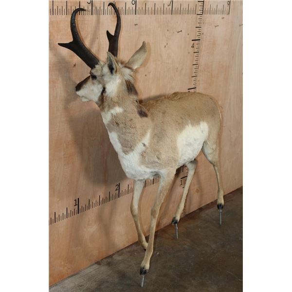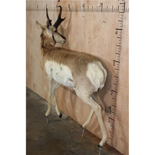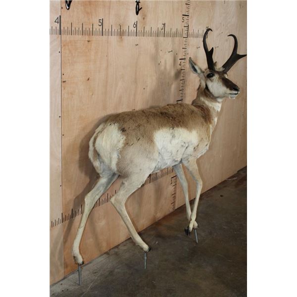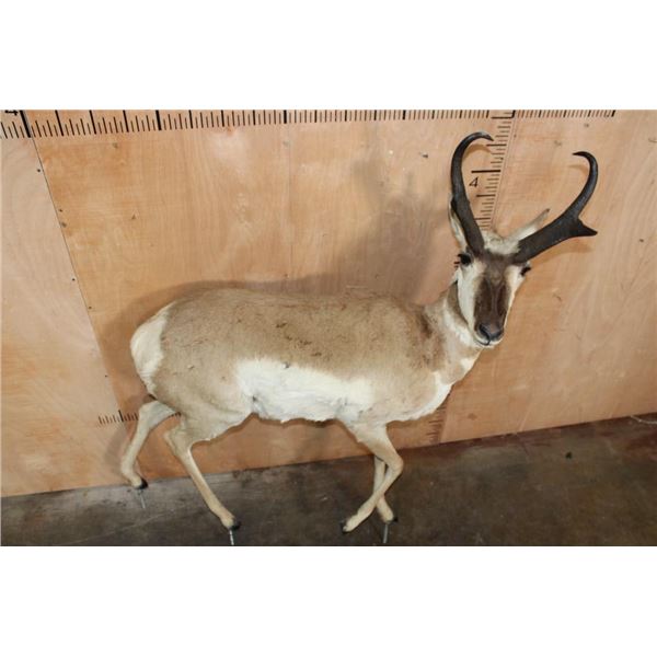 Life-sized PRONGHORN on Bolts with No Base. It measures 4' 3" Long x 15" Wide x 57" Tall. The Left Horn measures 13 3/8" Long and the Right Horn measures 13.5" Long. It is in Good Condition. TAXIDERMY