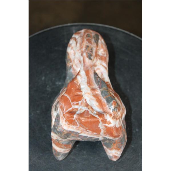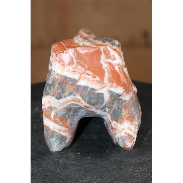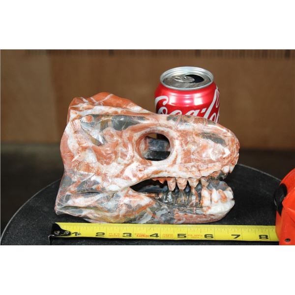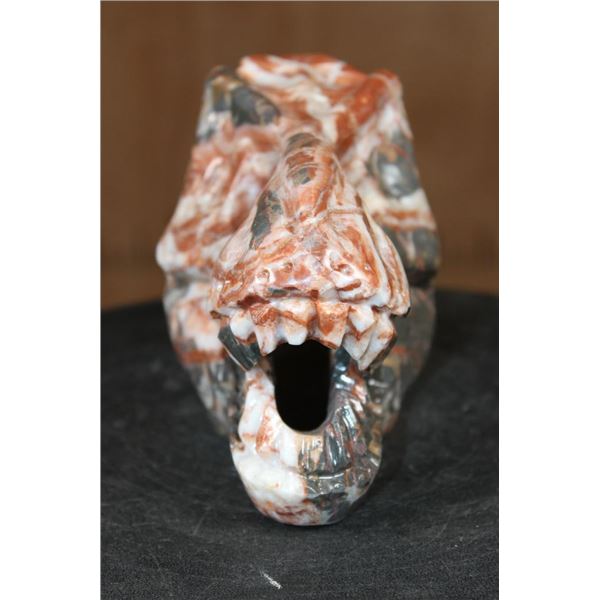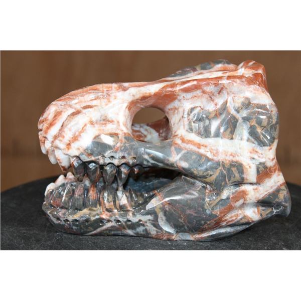 CRAZY LACE AGATE Hand-carved Tyrannosaurus Rex Skull. It measures 7" Long x 4" Wide x 4.75" Tall and Weighs 3 lbs 14 oz. ROCKS FOSSILS MINERALS