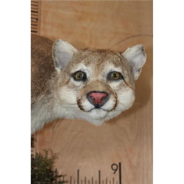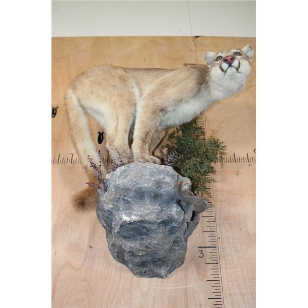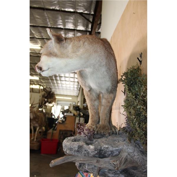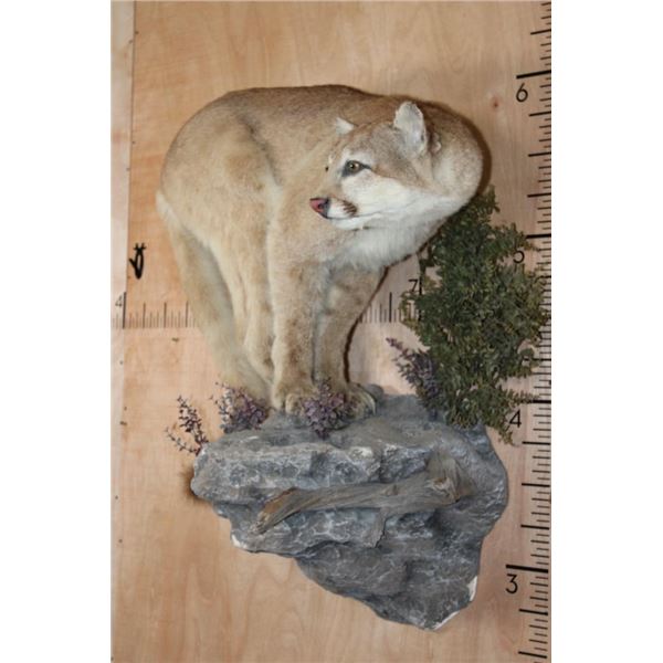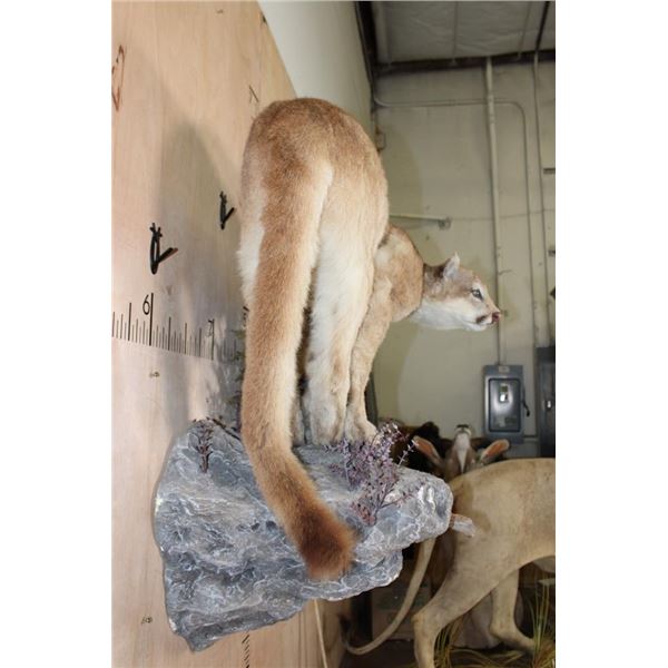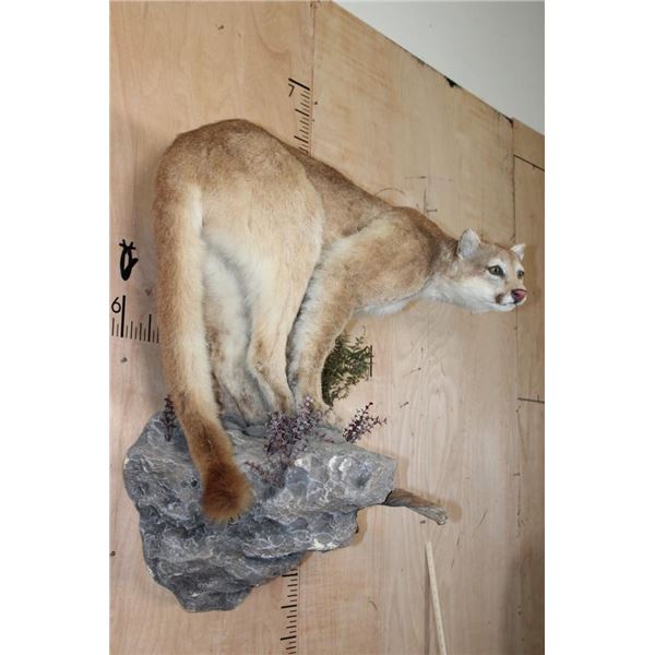 Nice Life-sized MOUNTAIN LION or COUGAR with All its Claws. It is mounted in a cool pose on a reproduction Rock Wall Hanger. The Cat is removable and it is in Good Condition. TAXIDERMY