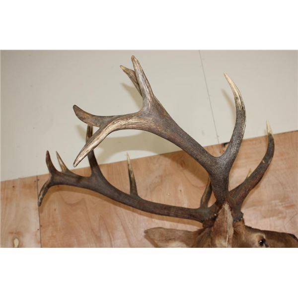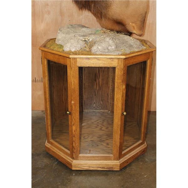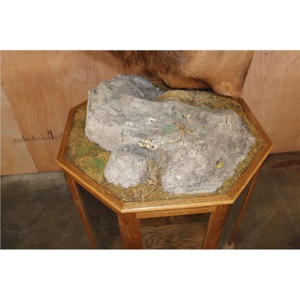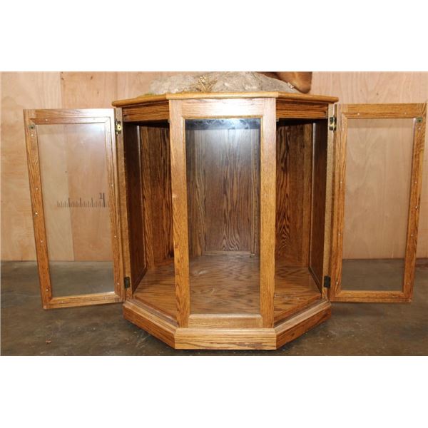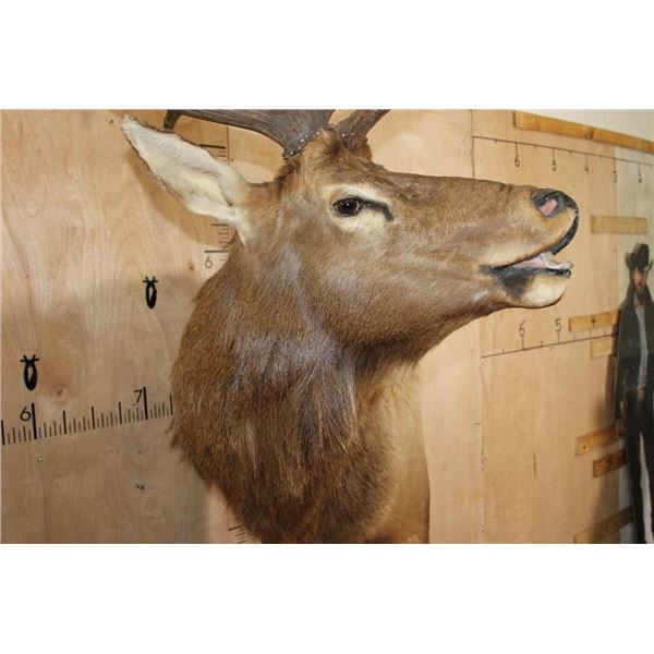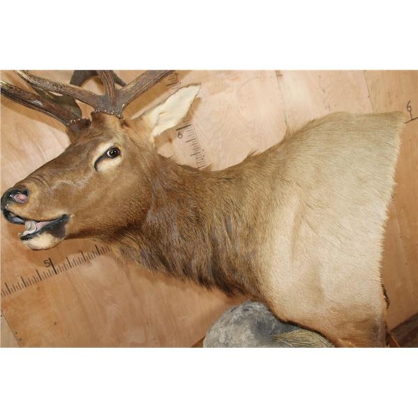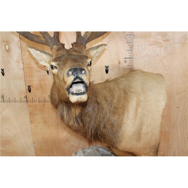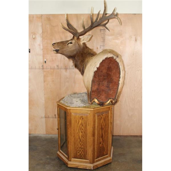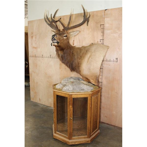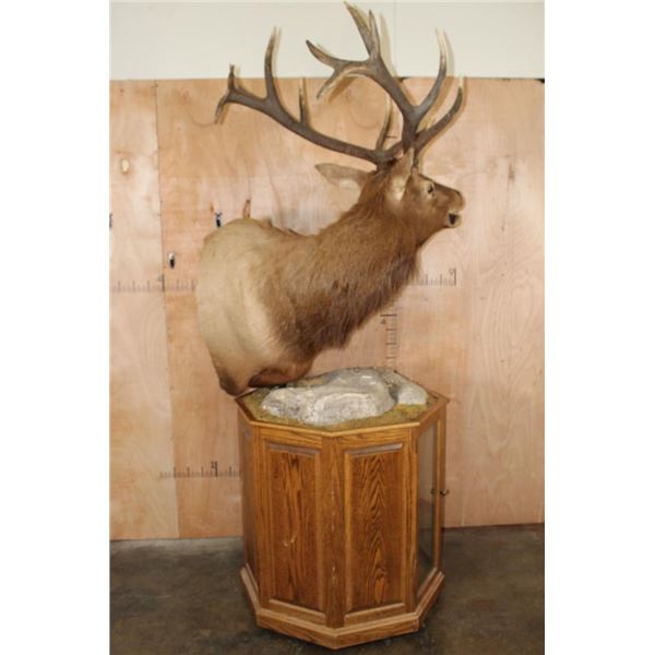 Very Nice 14-Point Bugling ELK Pedestal Mount with a 32.75" Spread. It is displayed on a unique wood Pedestal with glass doors and wheels. The Pedestal could display another taxidermy mount or be utilized as storage. The Elk is removable. TAXIDERMY