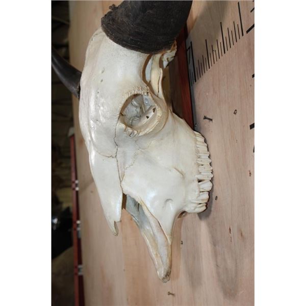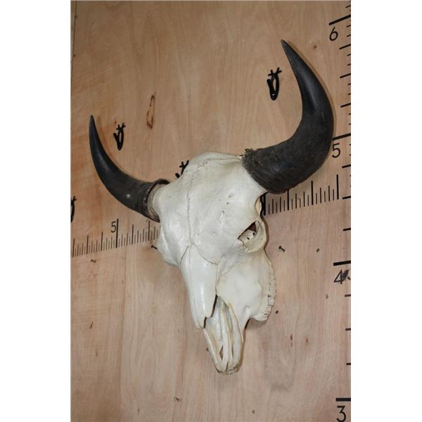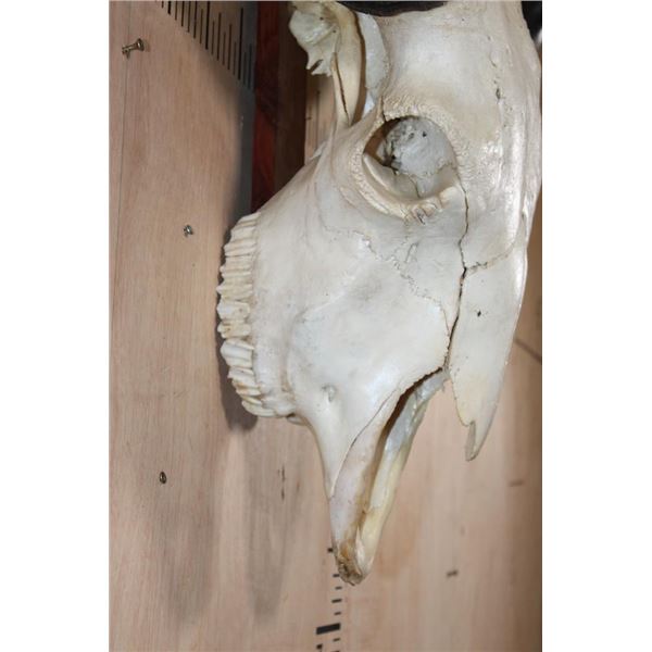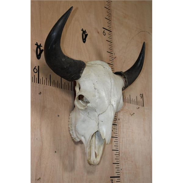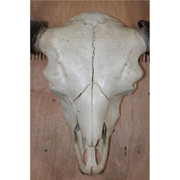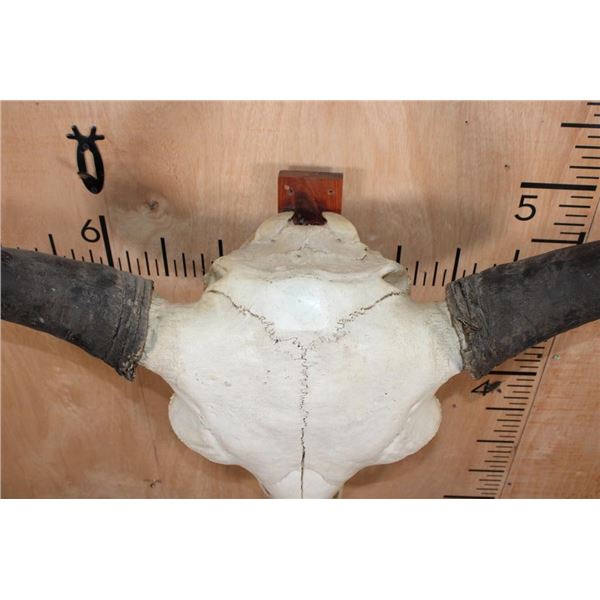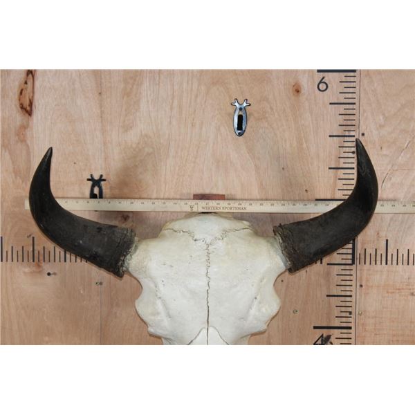 Massive XXL BUFFALO or BISON Skull with All its Teeth and a 30" Spread. The Left Horn measures 18 1/8" Long (along the outside curve) and 15" around the Horn Base. The Right Horn measures 18 3/8" Long and 14.75" around the Horn Base. TAXIDERMY SKULLS