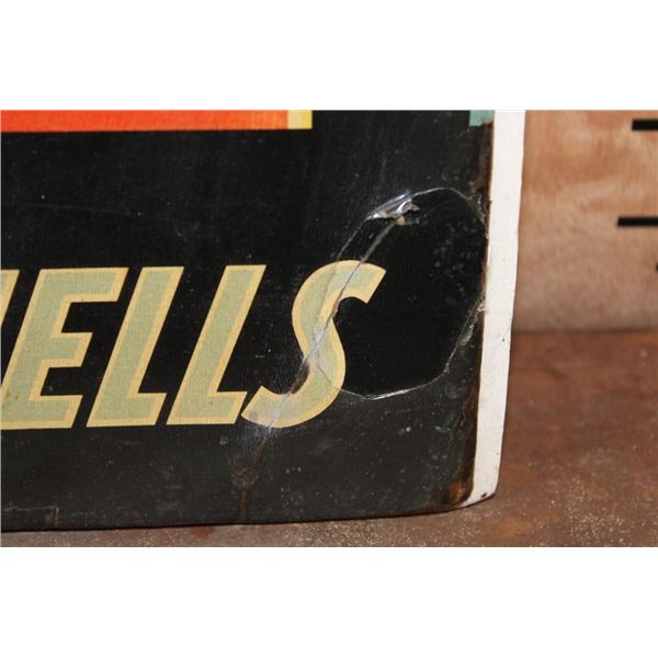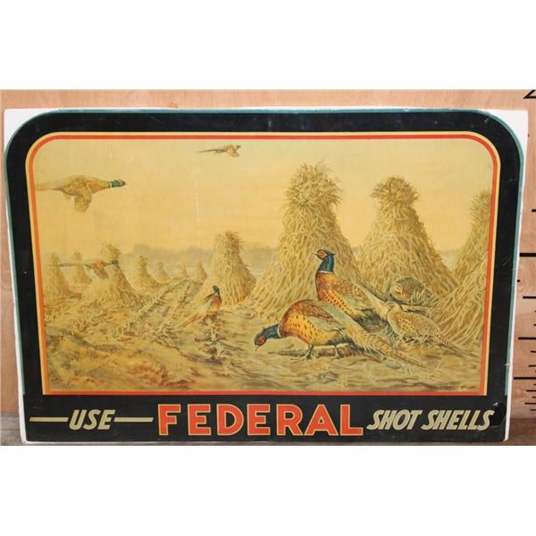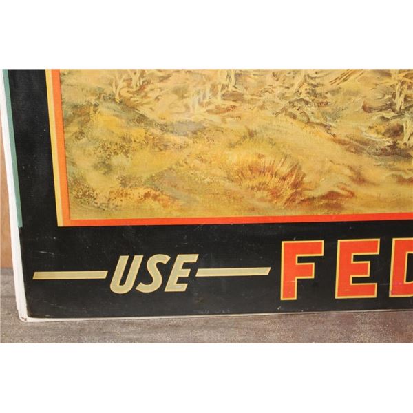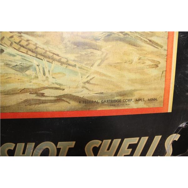 Original Antique Federal Shot Shells Cardboard Advertisement. It measures 22" Tall x 32" Wide. It has a minor crease in the bottom right corner, otherwise it is in Very Good Condition for its age. It has been sealed in plastic. COLLECTIBLE ANTIQUE HUNTING AND SPORTING ADVERTISEMENTS