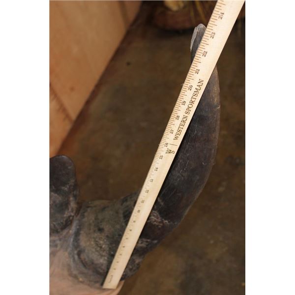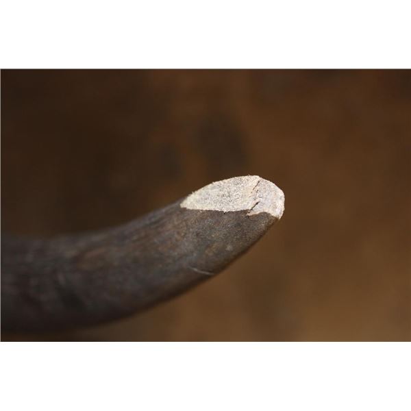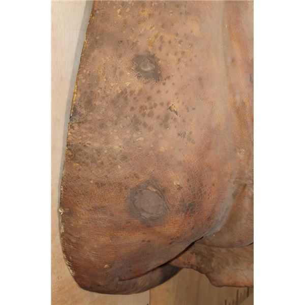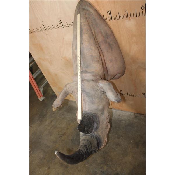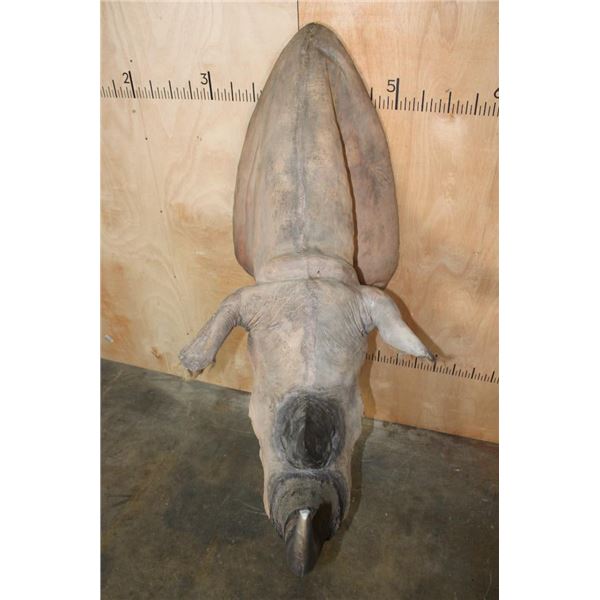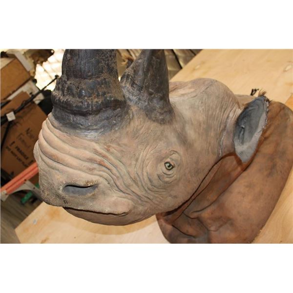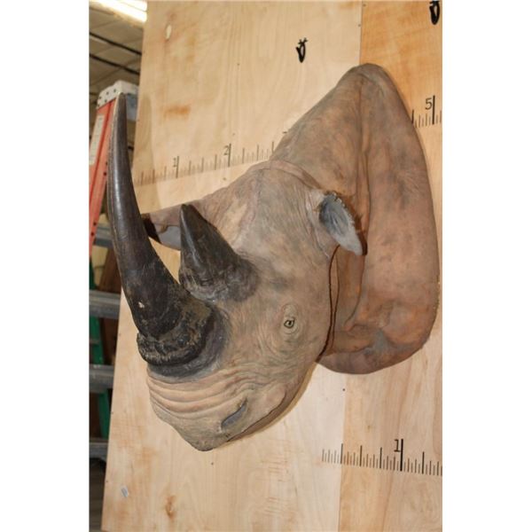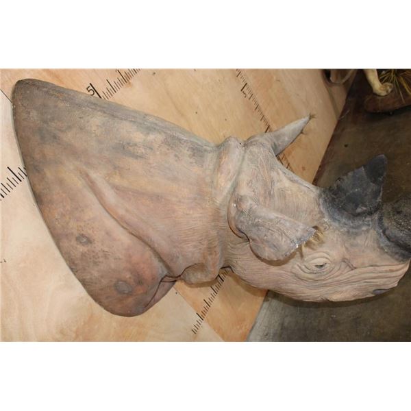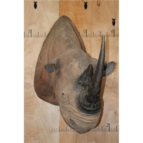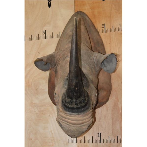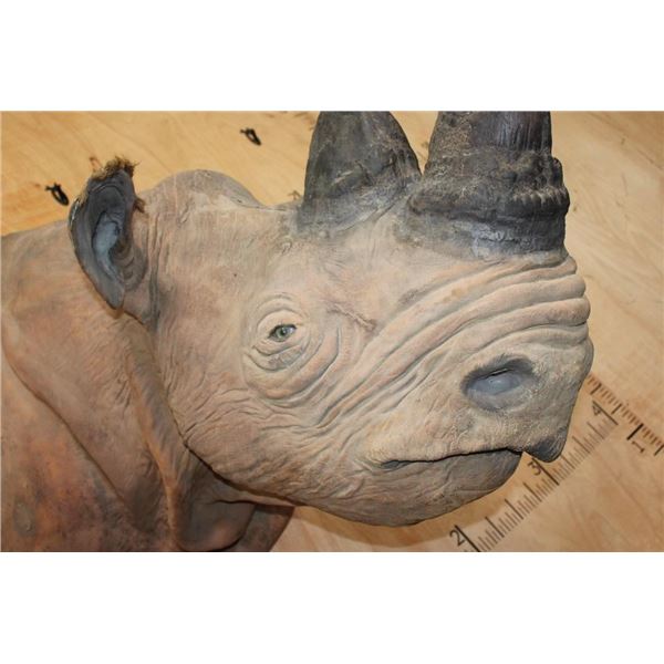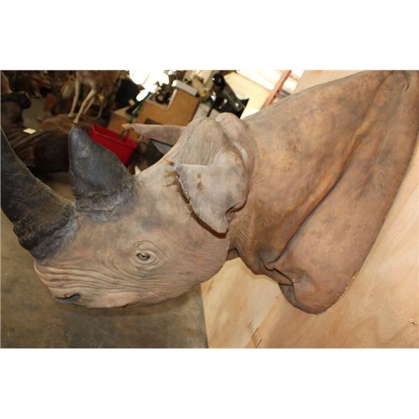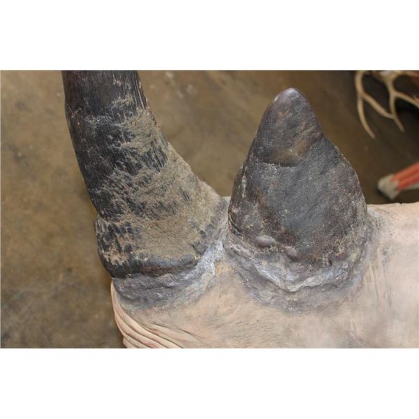 *TEXAS RESIDENTS ONLY*! *Extremely Rare* BLACK RHINO with *Real Horns and Real Skin*. The Horns are HUGE. The Front Horn measures 25 3/8" Long around the curve and a whopping 23" around the Horn Base. The Back Horn measures 8.5" Tall and 14.75" around the Horn Base. This is an older mount with some hide cracking and previous repairs. TAXIDERMY?