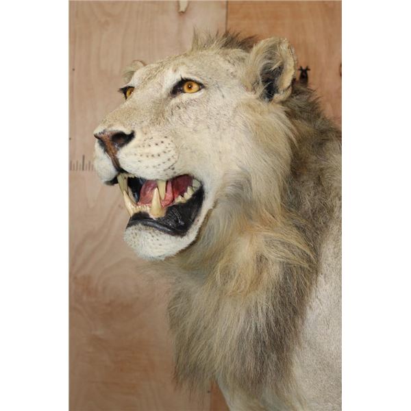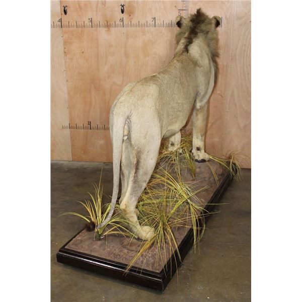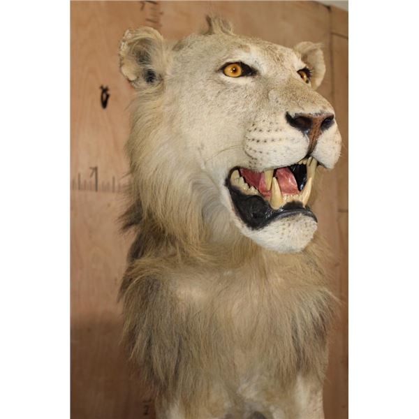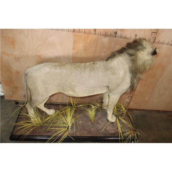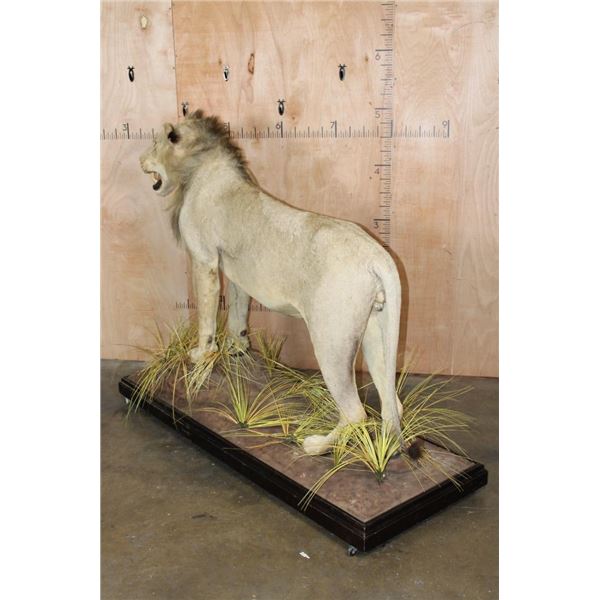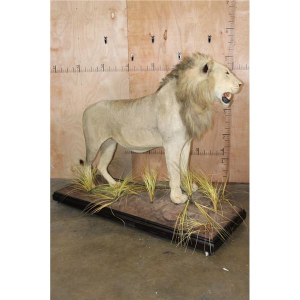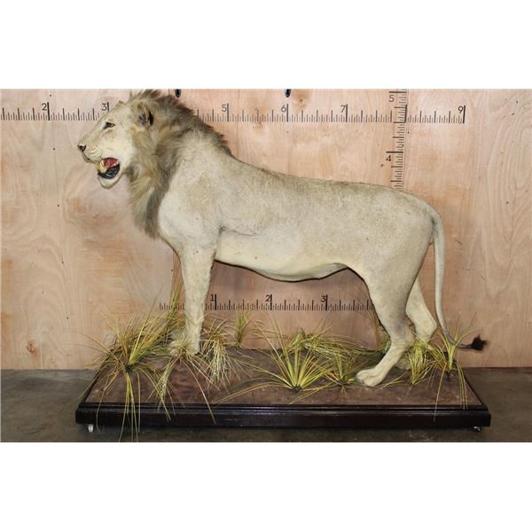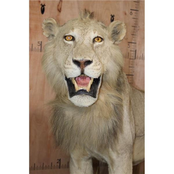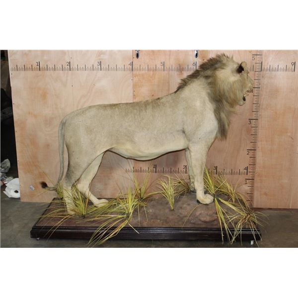 *TEXAS RESIDENTS ONLY*! Nice Life-sized AFRICAN LION. It is mounted on a Base with Wheels and measures 6' 5" Long x 28.25" Wide x 59" Tall. It has 8 Claws including 1 Dew claw. The Lion is removable from the Base and it is in Good Condition. TAXIDERMY