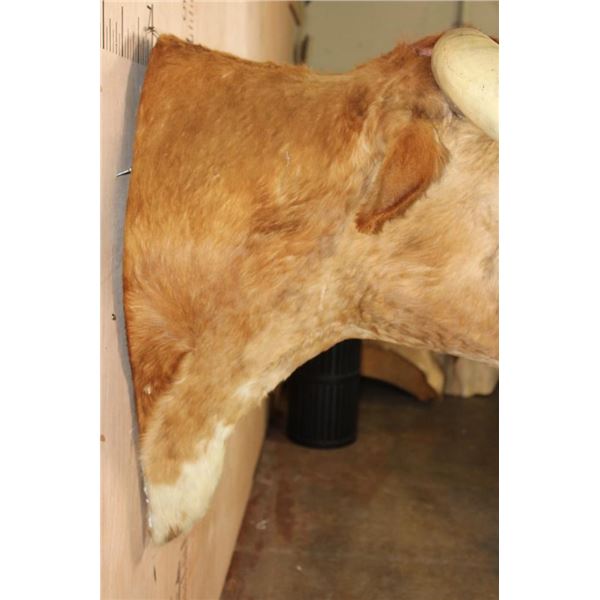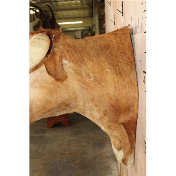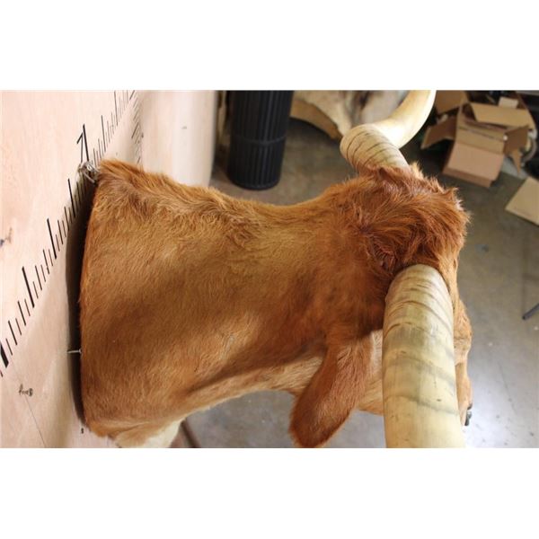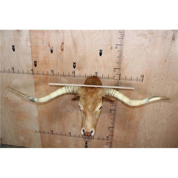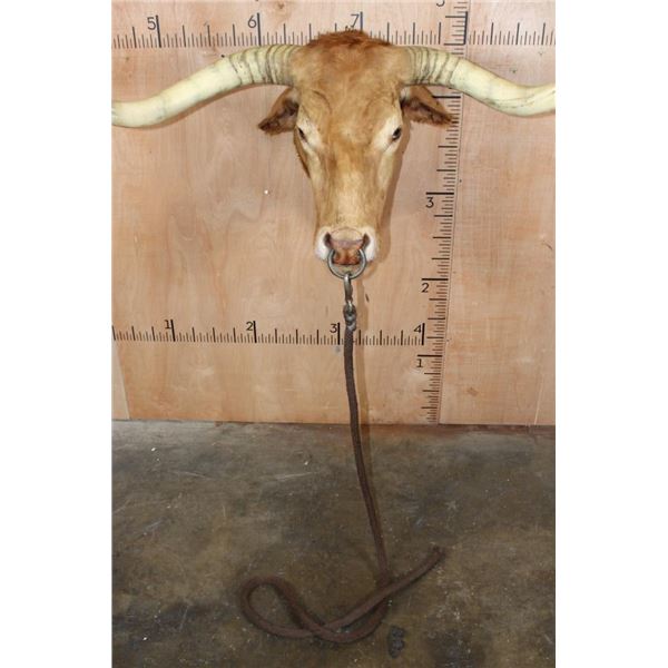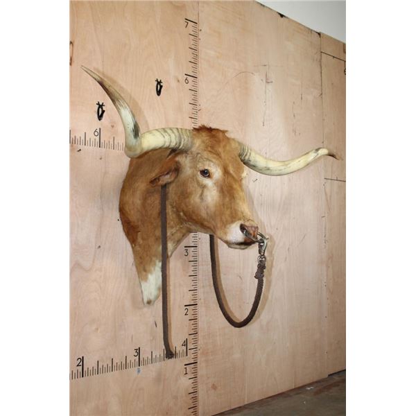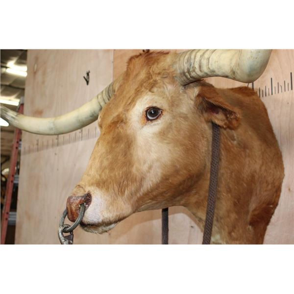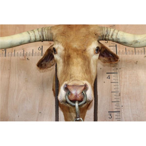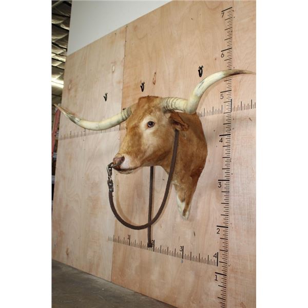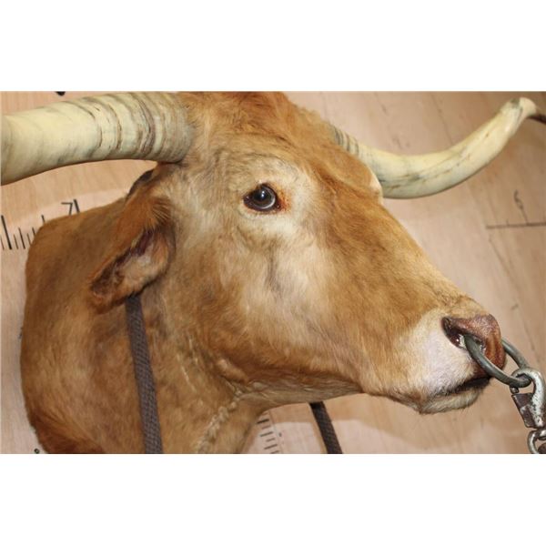 Very Nice and Unique TEXAS LONGHORN Shoulder Mount. It has a Cattle Nose Ring or Bull Ring attached to a rope. The Horns measure 64.5" from Tip to Tip. It is in Very Good Condition. TAXIDERMY