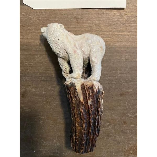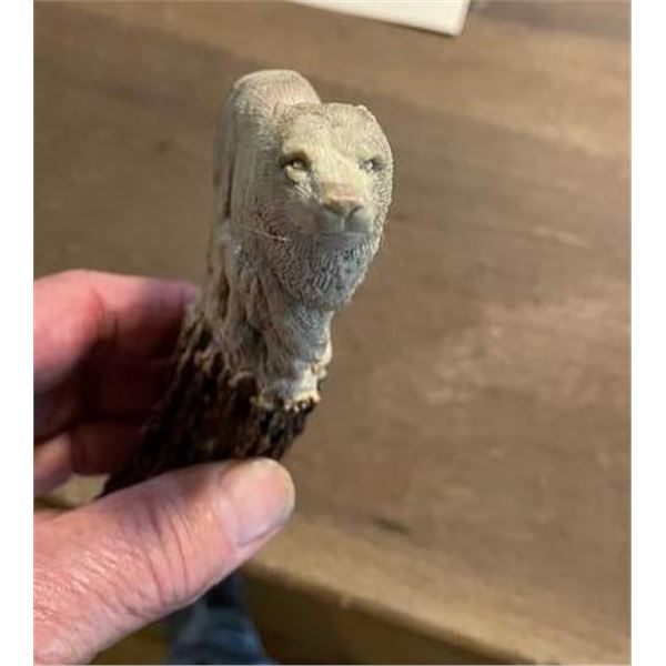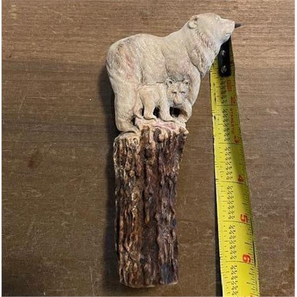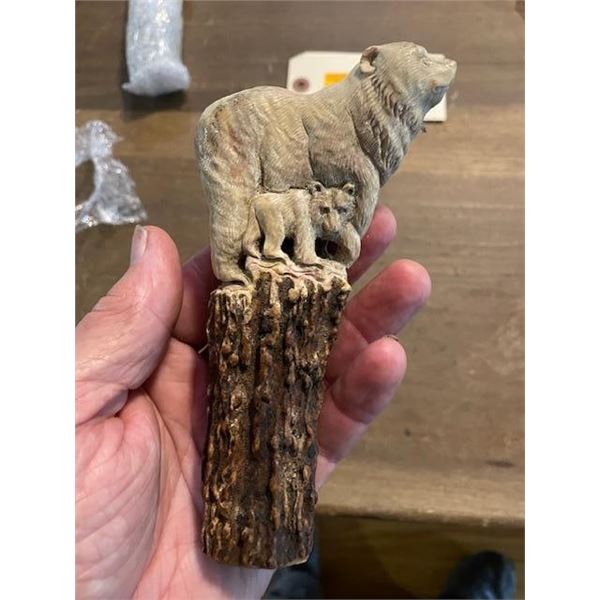 Beautiful Hand-carved STAG ANTLER Handle. It has been skillfully whittled into a BEAR and a BEAR CUB. It measures 6.25" Long x 3.25" Wide. This piece of art will make a unique Knife or Cane Handle. KNIFE AND CANE ACCESSORIES