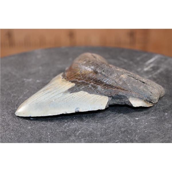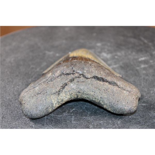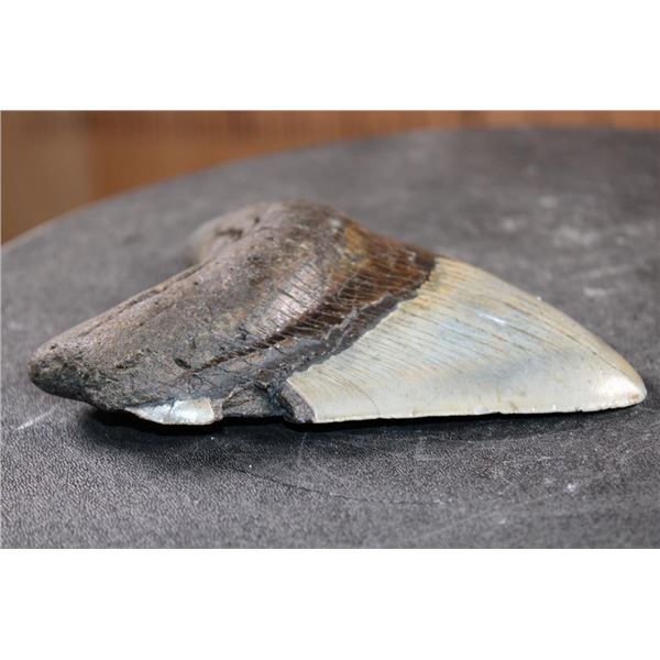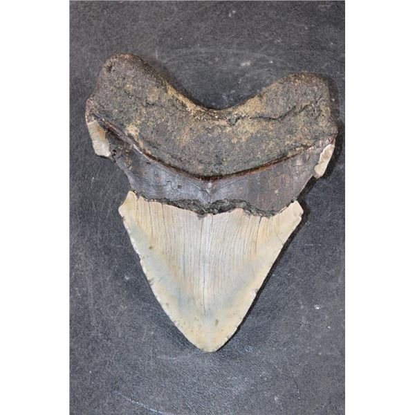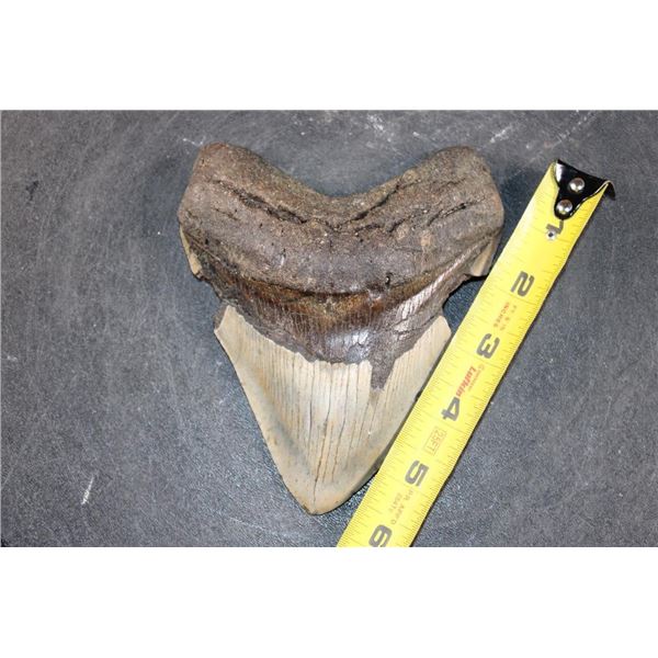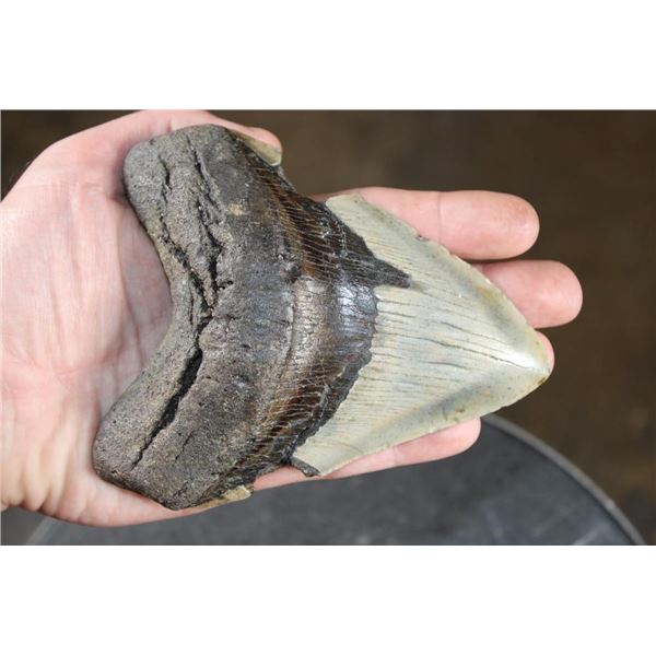 Gigantic MEGALODON Shark Tooth Fossil. This is the Biggest Shark Tooth in the sale! It measures 5 5/8" from the Top Corner to the Tip and 4 5/8" Wide and Weighs 13 oz. MEGALODON SHARK TEETH