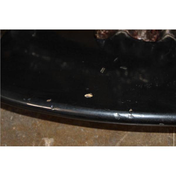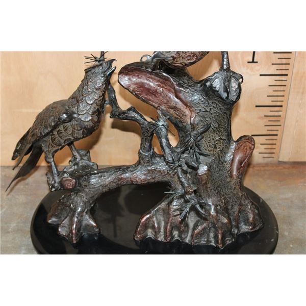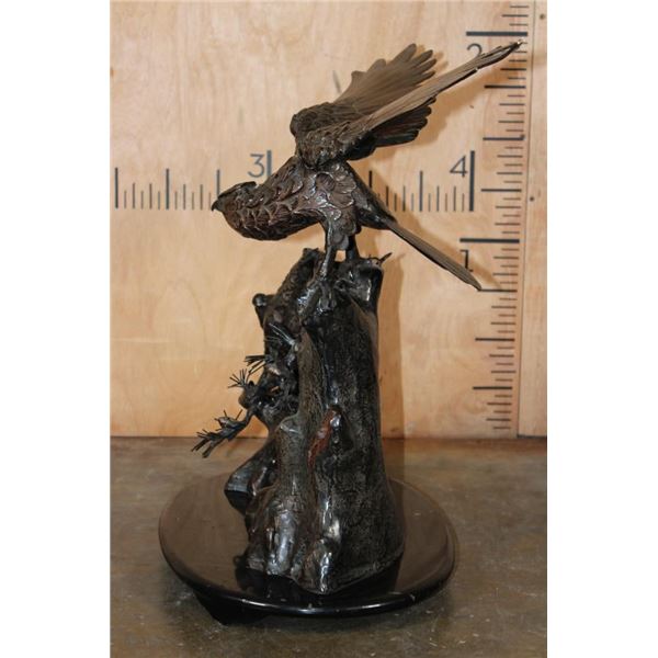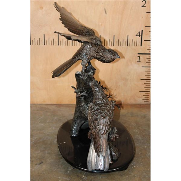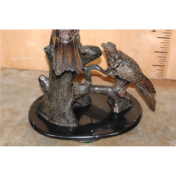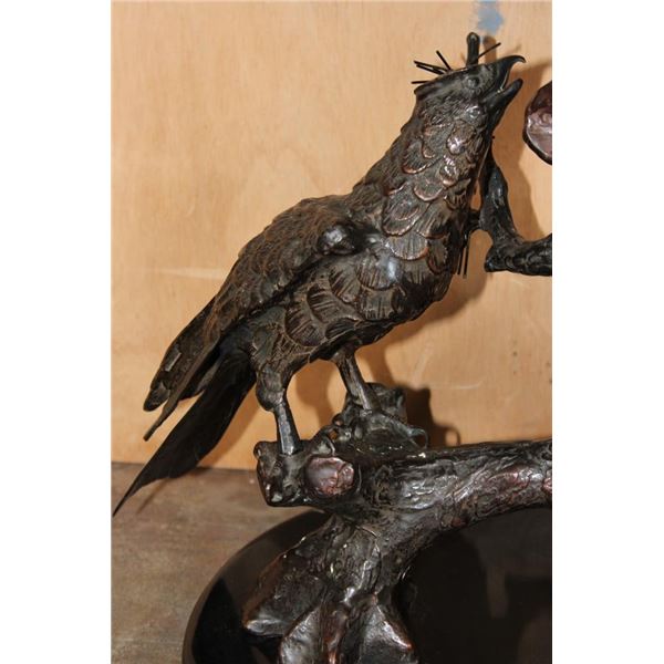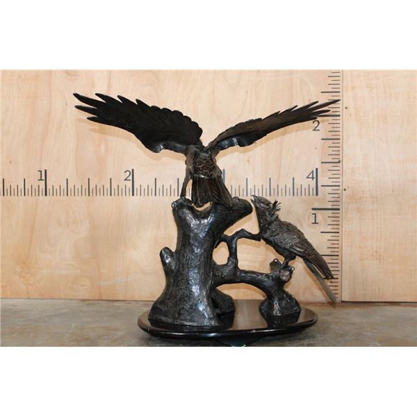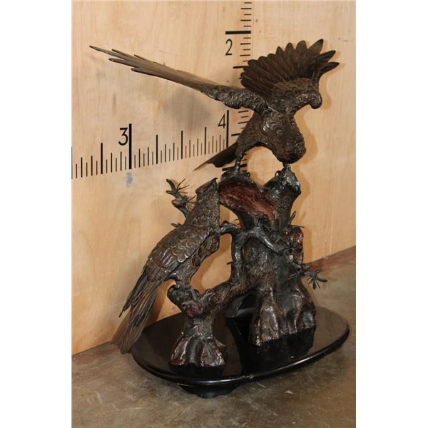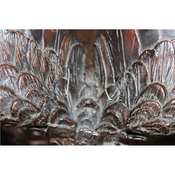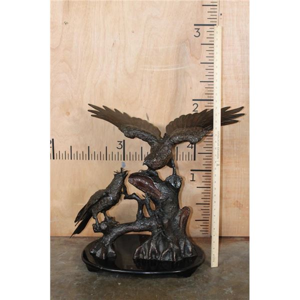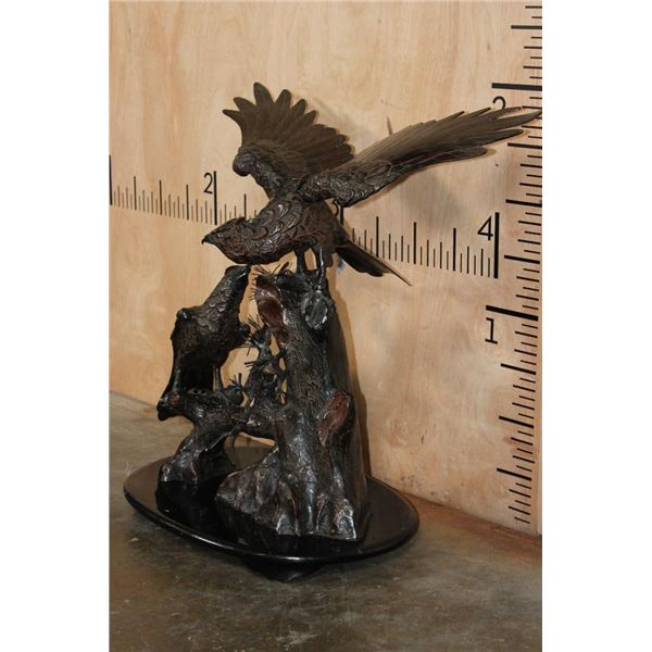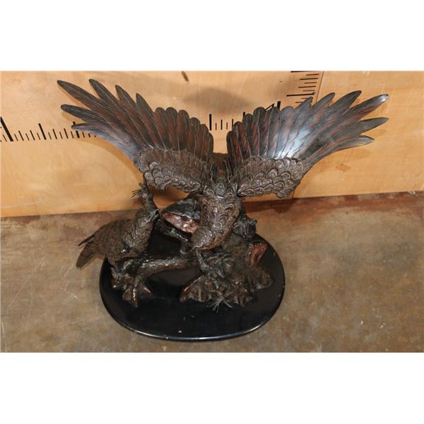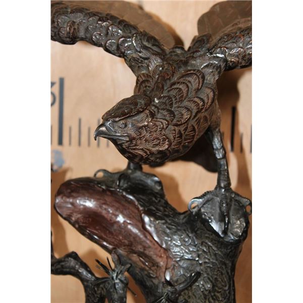 XL Japanese Patinated Bronze and Cast Iron Eagle Sculpture. It measures 24" Tall x 26.75" Long x 14.5" Wide and Weighs 27 lbs 10 oz. It has removable wings that attach by a wire. COLLECTIBLE BRONZE SCULPTURES