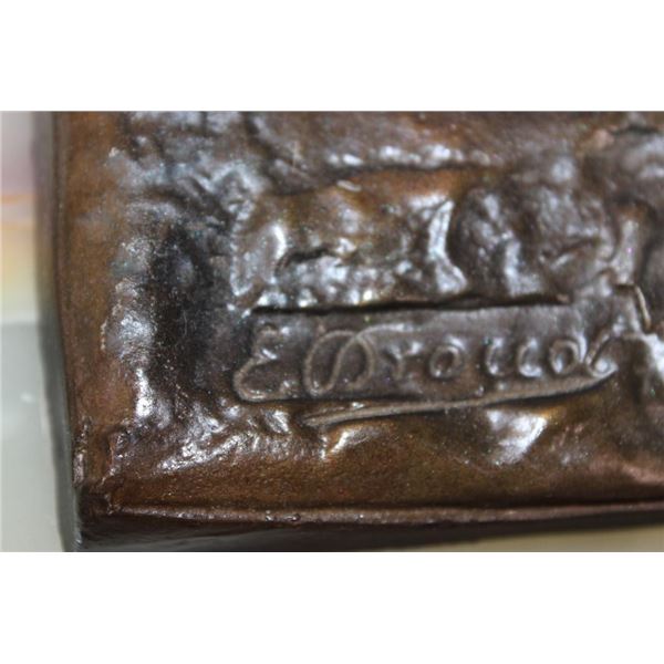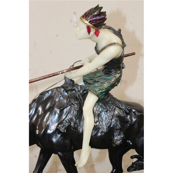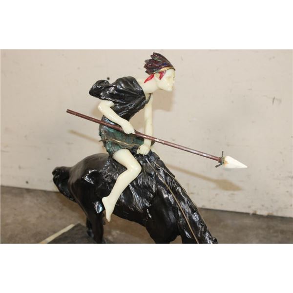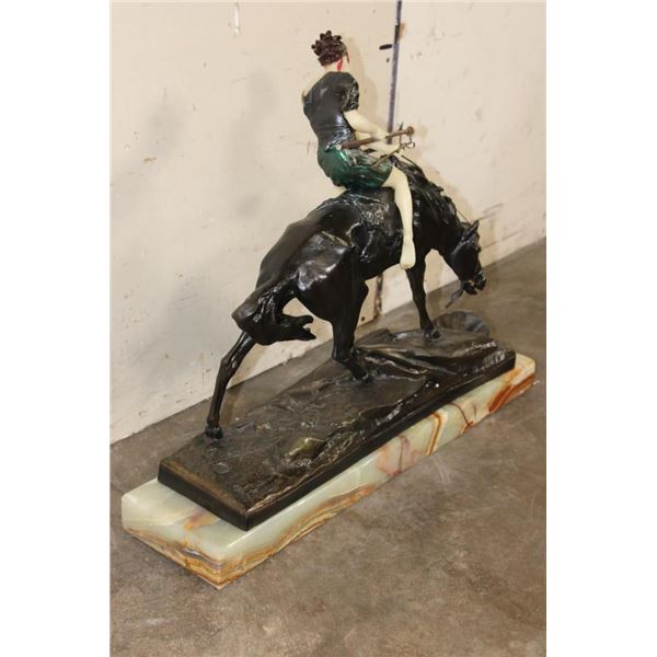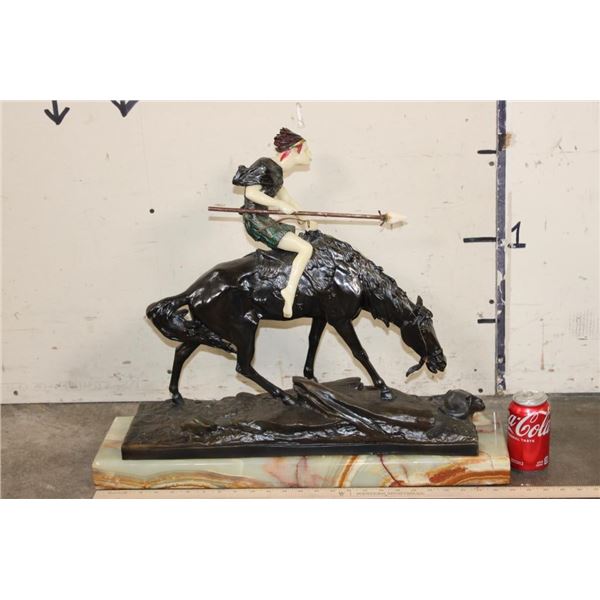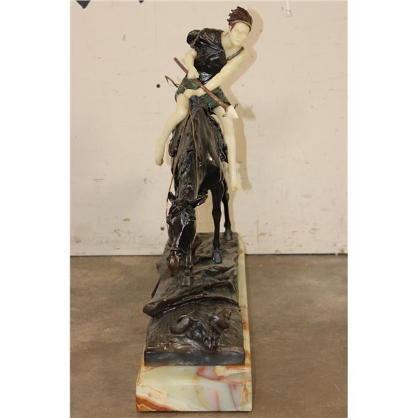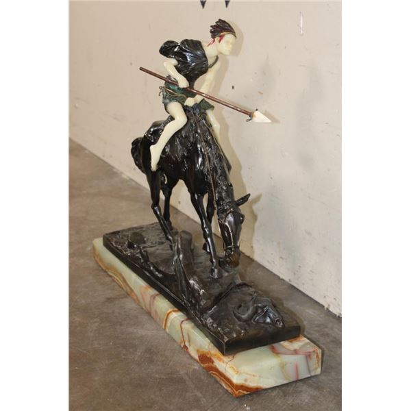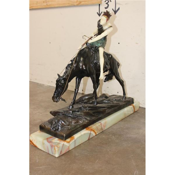 XL "Le Cavalier Indien" or "Native American on Horse" BRONZE Sculpture after Edouard Drouot on an ONYX Base. It is signed "Edouard Drouot" (French Sculptor 1859-1945) and measures 26" Long x 6.5" Wide x 21.75" Tall. The right hand is missing 2 fingers. The Total Weight is 63 lbs 1 oz. COLLECTIBLE BRONZE SCULPTURES?*This item was sold in our last auction. The buyer did not pay, it is being resold*.