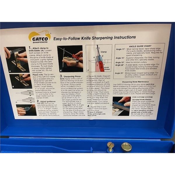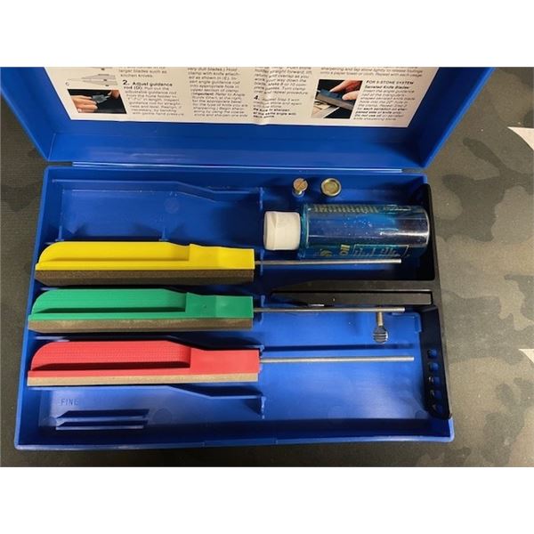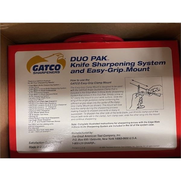 - Gatco Edge-Mate 3-stone knife sharpening system with coarse, medium and fine honing stones