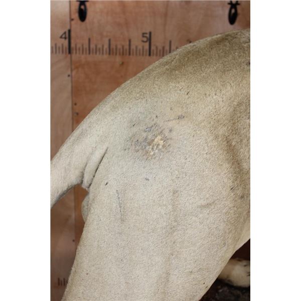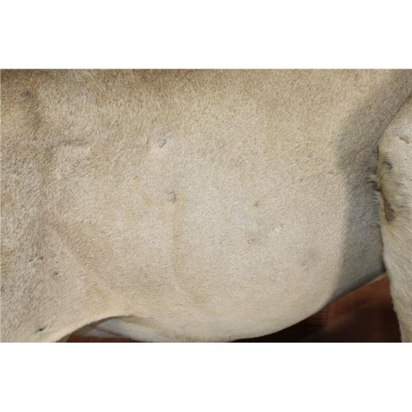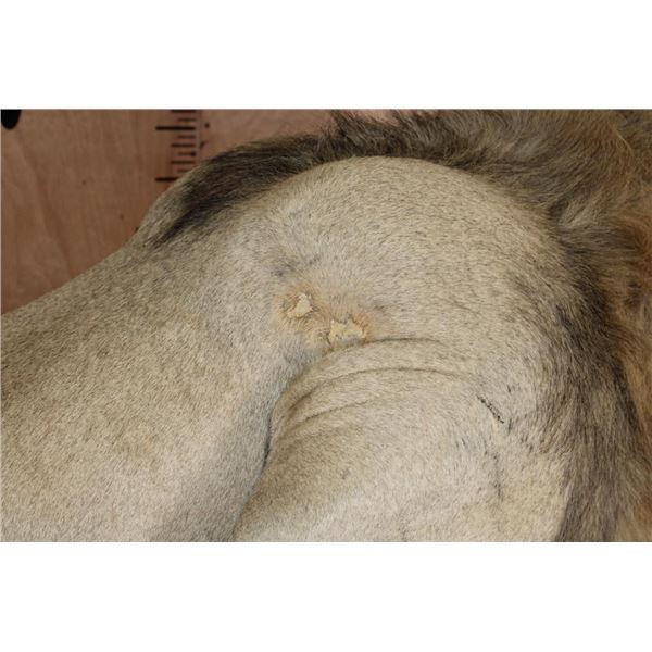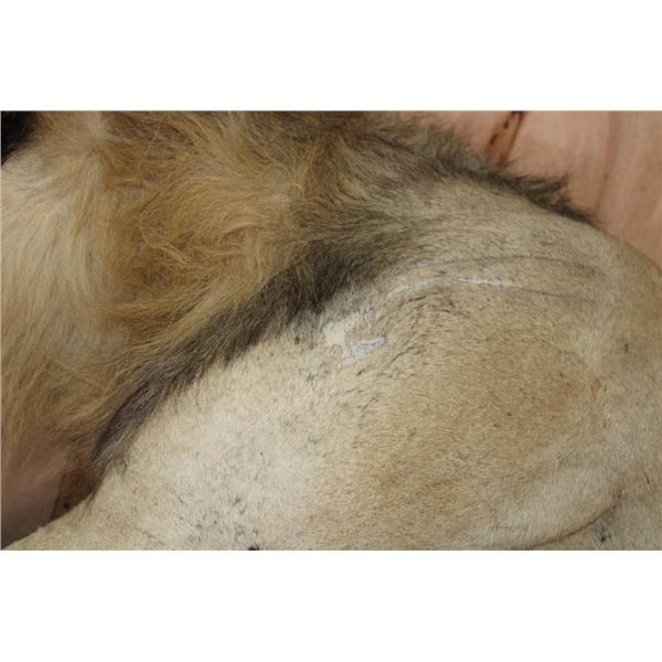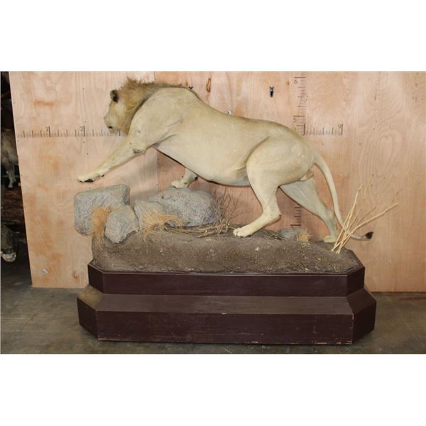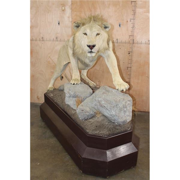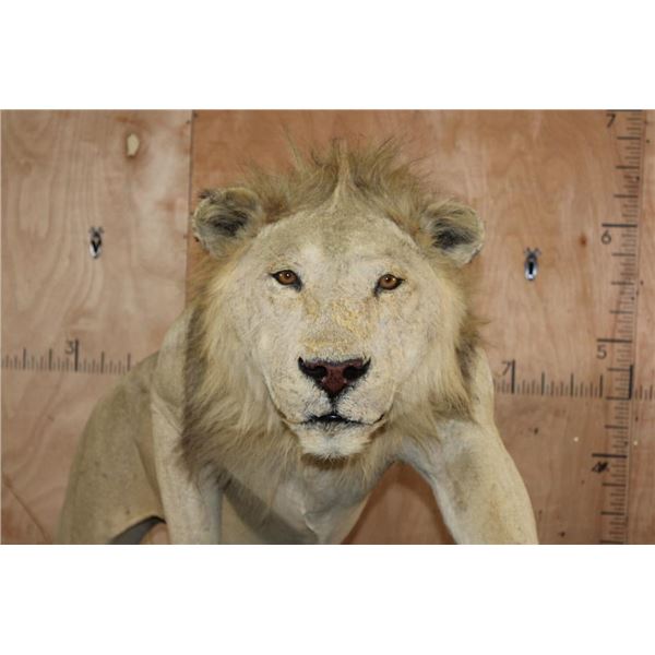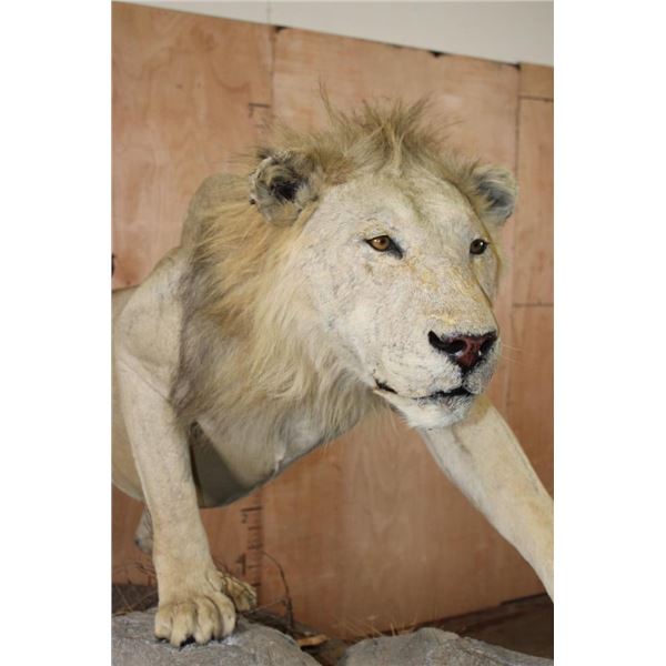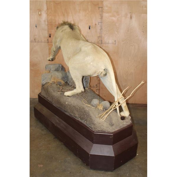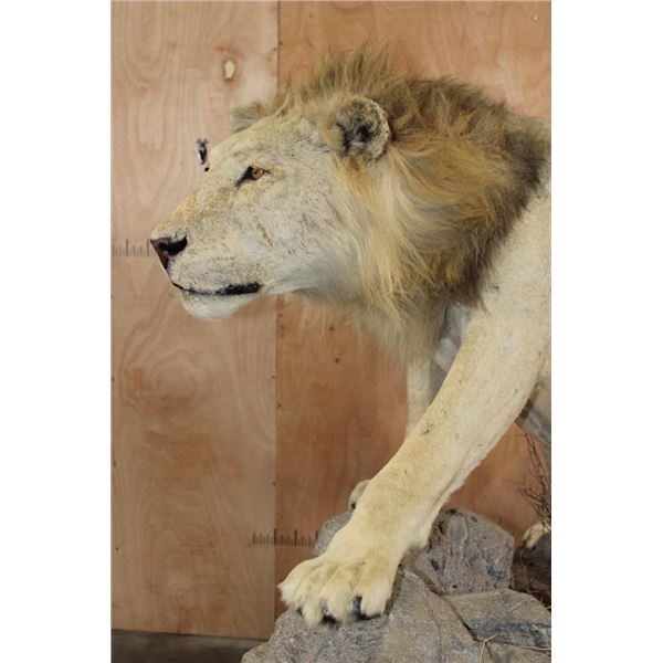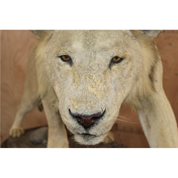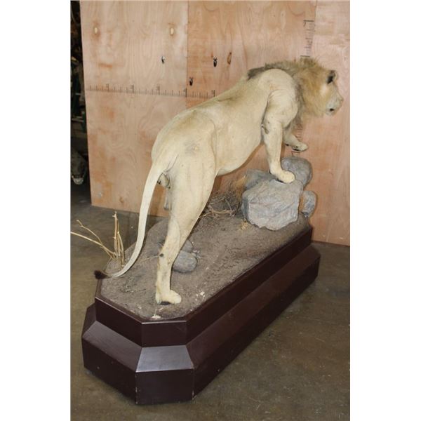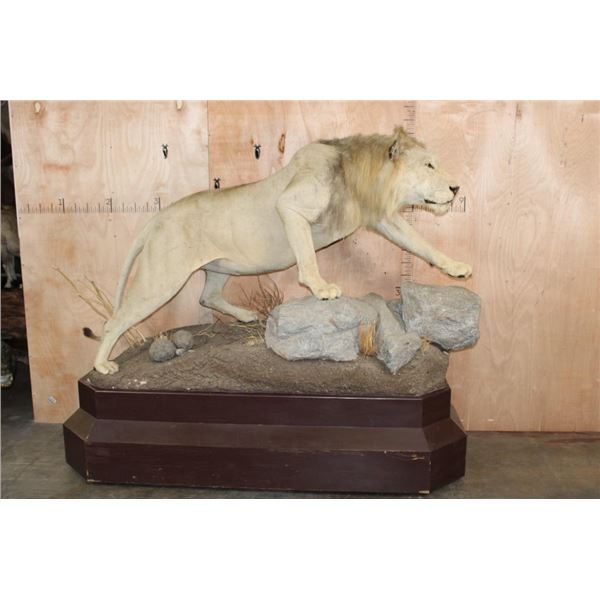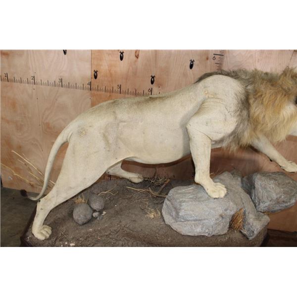 *TEXAS RESIDENTS ONLY* Life-sized AFRICAN LION on a Base with Wheels. It measures 7' 1" Long x 34" Wide x 5' 11" Tall. It has a Real Mane and No Claws. There are several hide rubs and paint touch ups. TAXIDERMY?